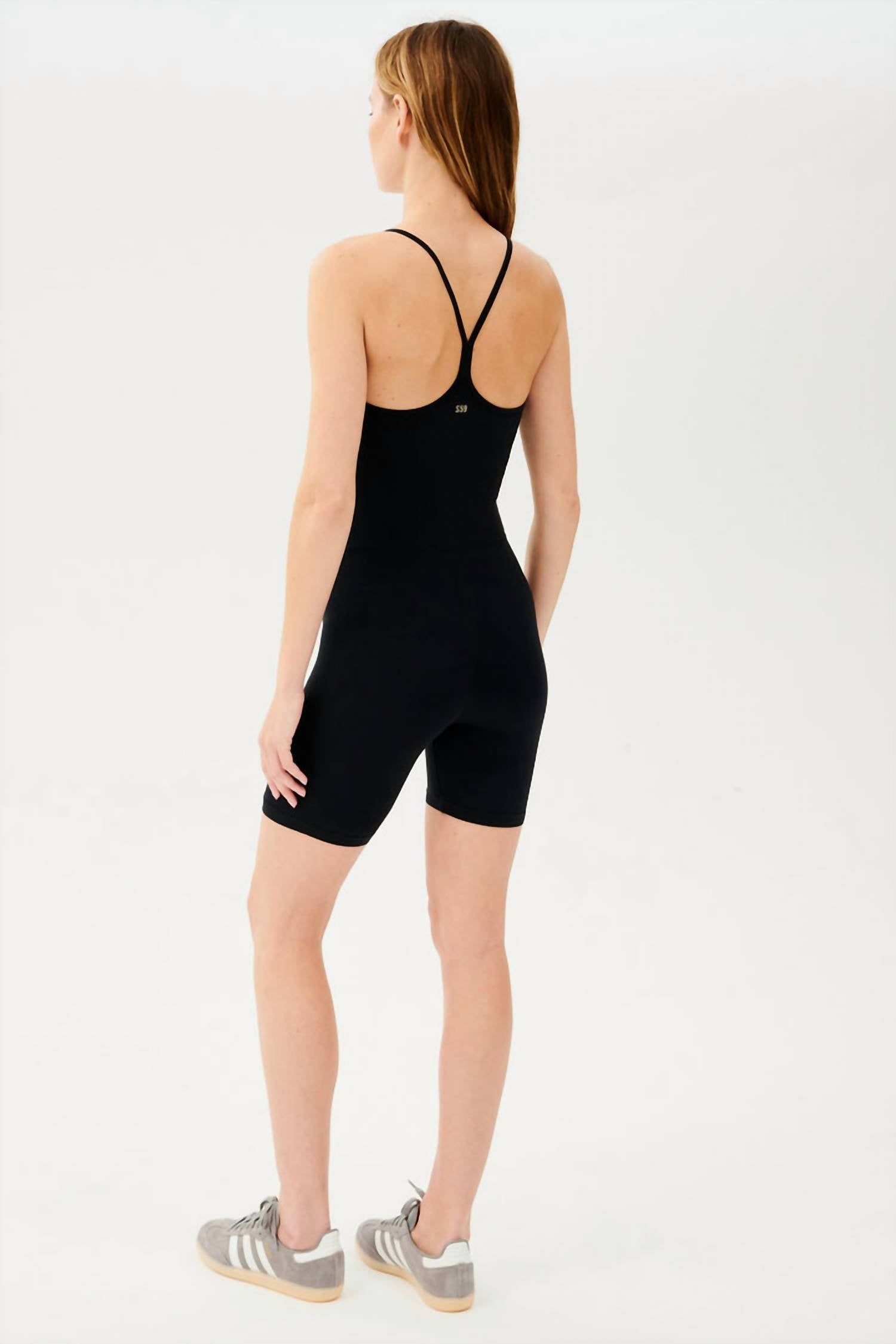 Introducing the Airweight 6" Short Jumpsuit by SPLITS59, a sleek and stylish piece designed for the modern woman. With a solid black color and featuring a bike short length, this jumpsuit is crafted from super soft Airweight fabric. It's best suited for activities like hot yoga, barre, and Pilates, offering a slim fit with a skinny leg. Closure: Pull on. Care: Hand wash and line dry.