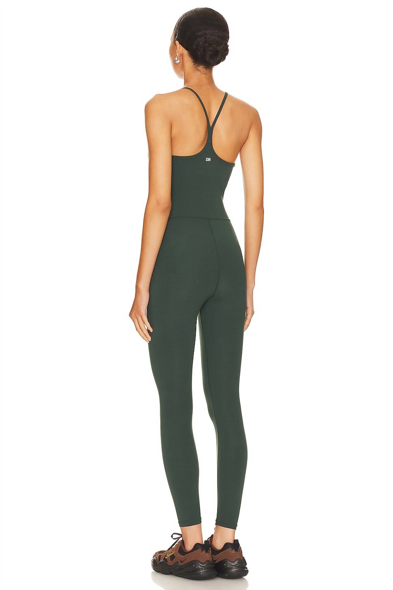 The Airweight Jumpsuit by SPLITS59 is designed for both workouts and casual wear, offering ultimate comfort with its super soft Airweight fabric. This military-colored, body-hugging one piece features a sleek scoop neckline and thin straps, with a practical interior shelf bra for added support. Composed of 81% nylon and 19% spandex, this jumpsuit ensures a snug, second-skin fit. Originating from the USA, it comes with a convenient pull-on closure, and can be effortlessly maintained by machine washing cold.