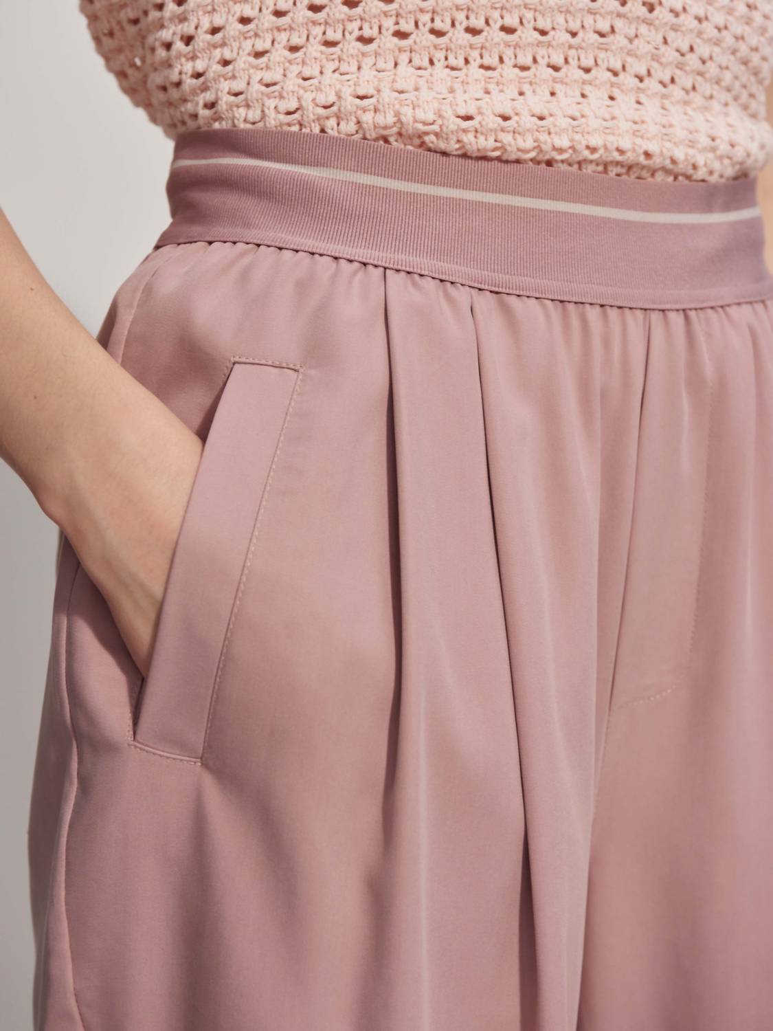 Embrace relaxed elegance designed in a dreamy woodrose shade. Wide-leg pants feature a high-rise pull-on style with an 11-inch front rise, complemented by a 29-inch inseam for a laid-back silhouette. Crafted from 77% Ecocosy and 23% Sorona. Promise comfort with pleated fronts and convenient side pockets. Care is simple, machine wash cool, avoid bleach and tumble drying, iron cool, and wash with similar colors.