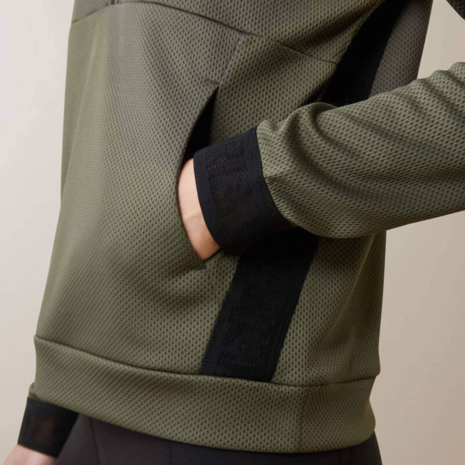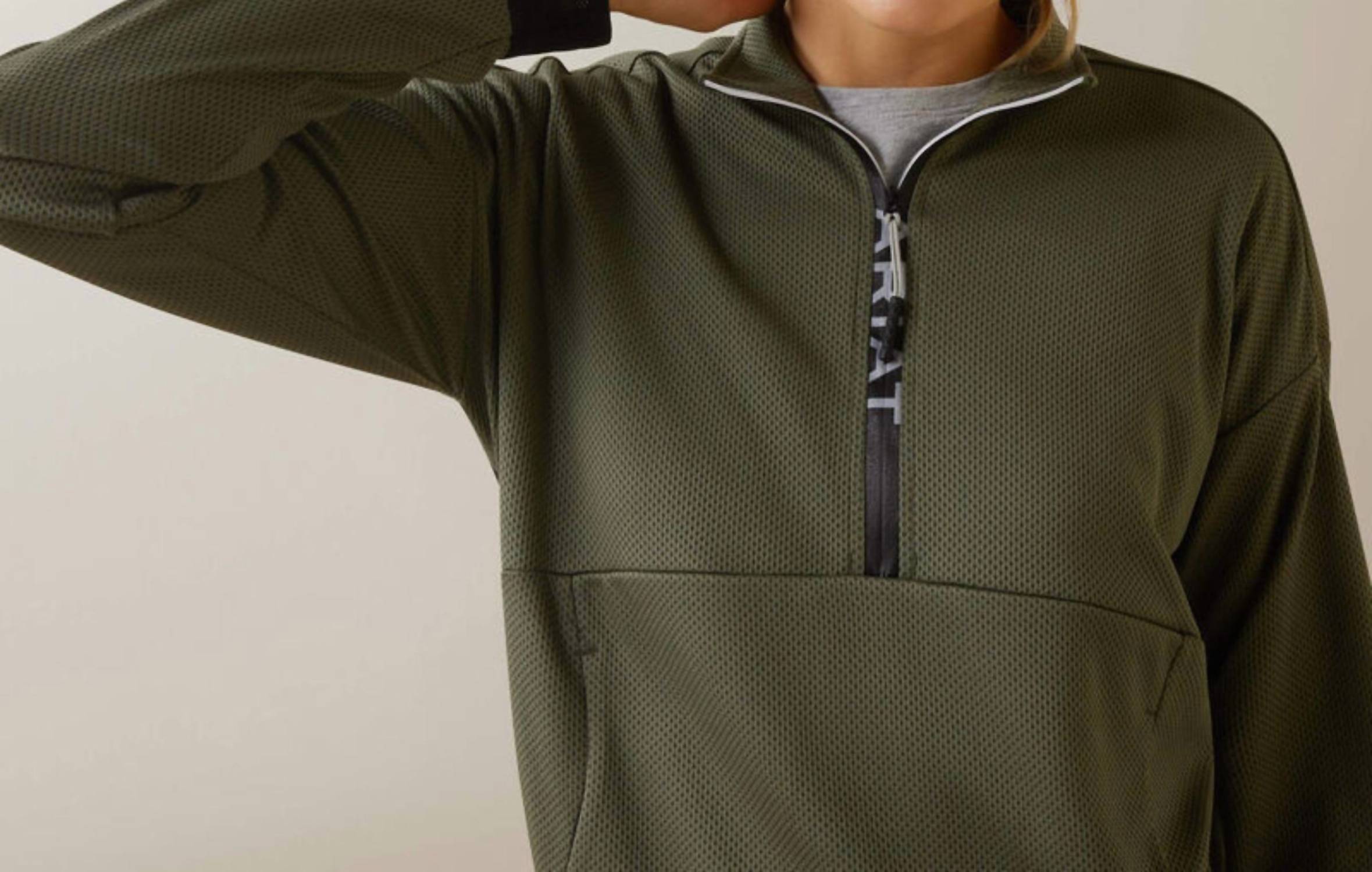 Discover the Ariat Women's Breath Zip Sweatshirt in Beetle, designed for activewear enthusiasts with long sleeves and a sleek mockneck. Crafted from 100% recycled polyester using a lightweight double-knit, this sweatshirt includes a modern kangaroo pocket and features flattering raglan styling. Incorporating AriatTEK moisture movement technology, it's perfect for your fitness workouts. Closure: Zip closure. Care: Machine wash and tumble dry.