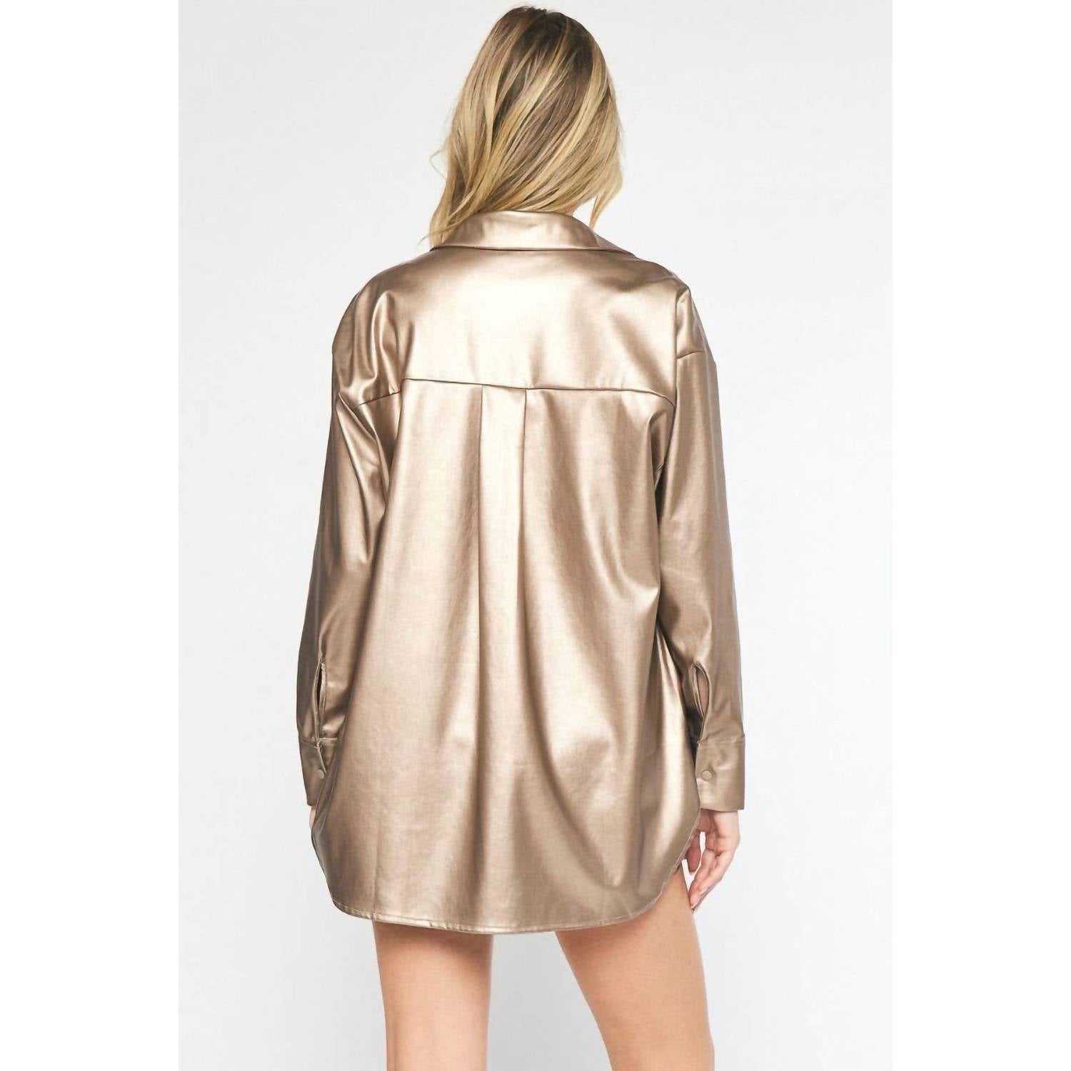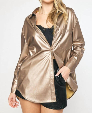 Introducing the Gold Button Up by Entro, a chic addition to your spring wardrobe perfect for holiday parties. This oversized top features long sleeves and a stylish collar with practical pockets for added convenience. The solid gold hue exudes elegance, while the button closure offers a classic look. Ideal for versatile styling, this garment is a must-have for any fashion-forward wardrobe.