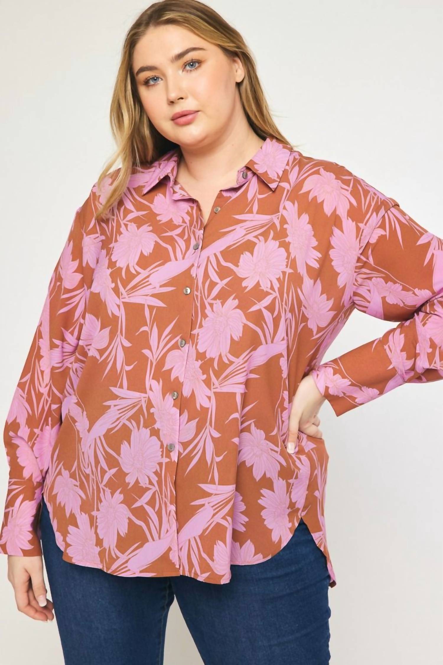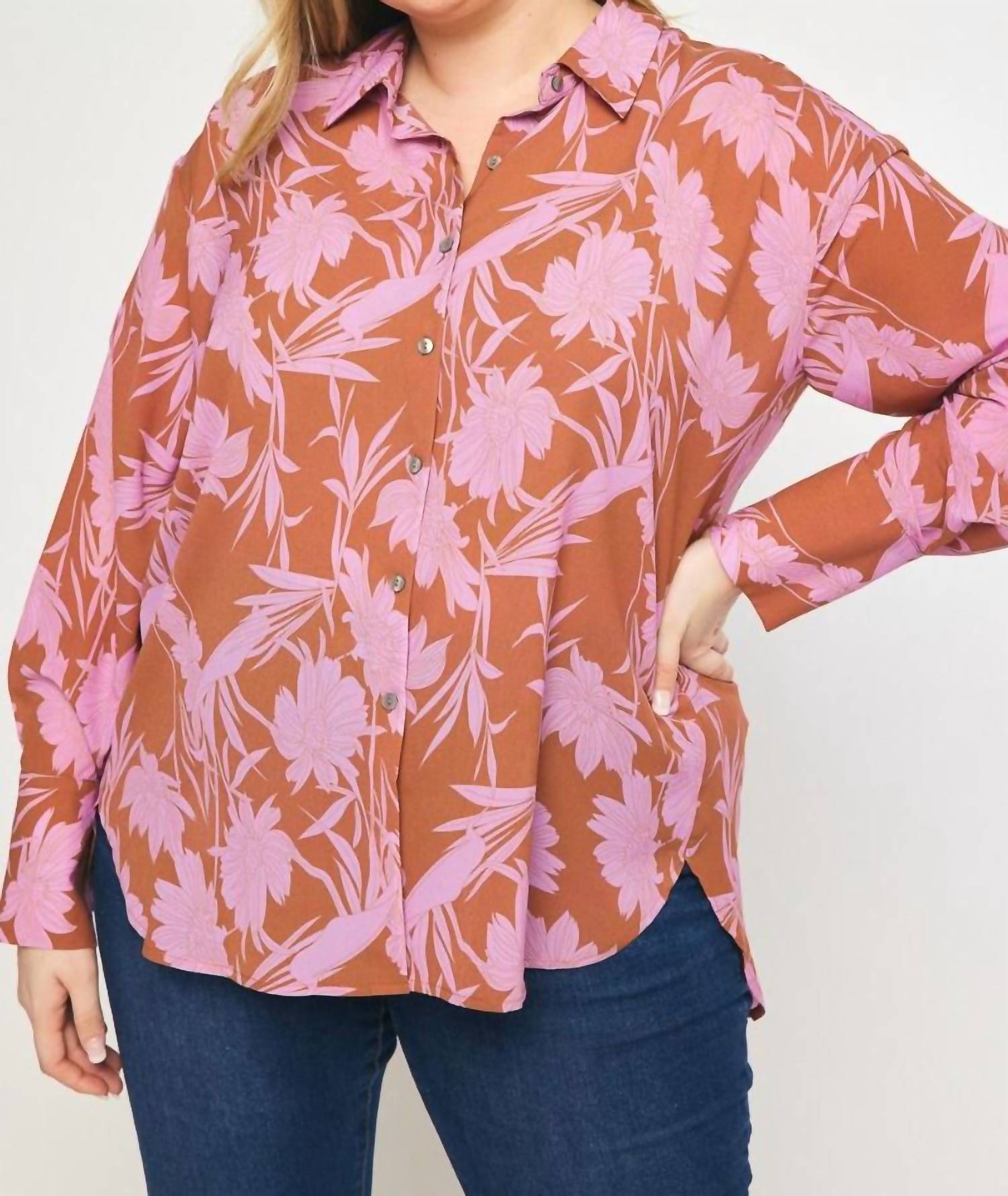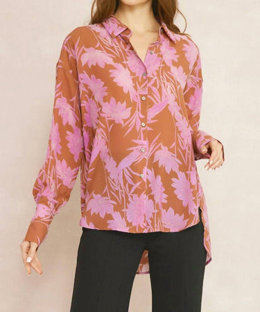 The Cinna Top by Entro is a lightweight, floral print button-up designed for your next spring holiday party. This long sleeve shirt in a charming pink hue features a classic collar for a polished look. It offers a button closure to ensure ease of wear. Perfect for adding a touch of elegance to your seasonal wardrobe.