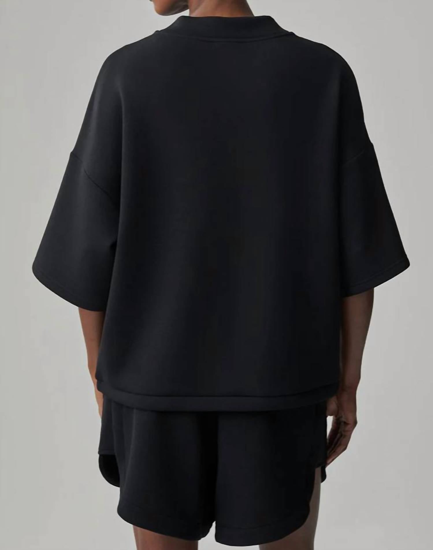 Discover the Alden Short Sleeve Sweatshirt by VARLEY, a minimalist addition to your casual wardrobe in classic black. This women's crewneck sweatshirt features short sleeves and a solid pattern, perfect for a spring dinner party or Thanksgiving gathering. Designed with a convenient pull-on closure, it is effortless to style with matching shorts for a cohesive look.