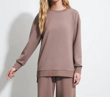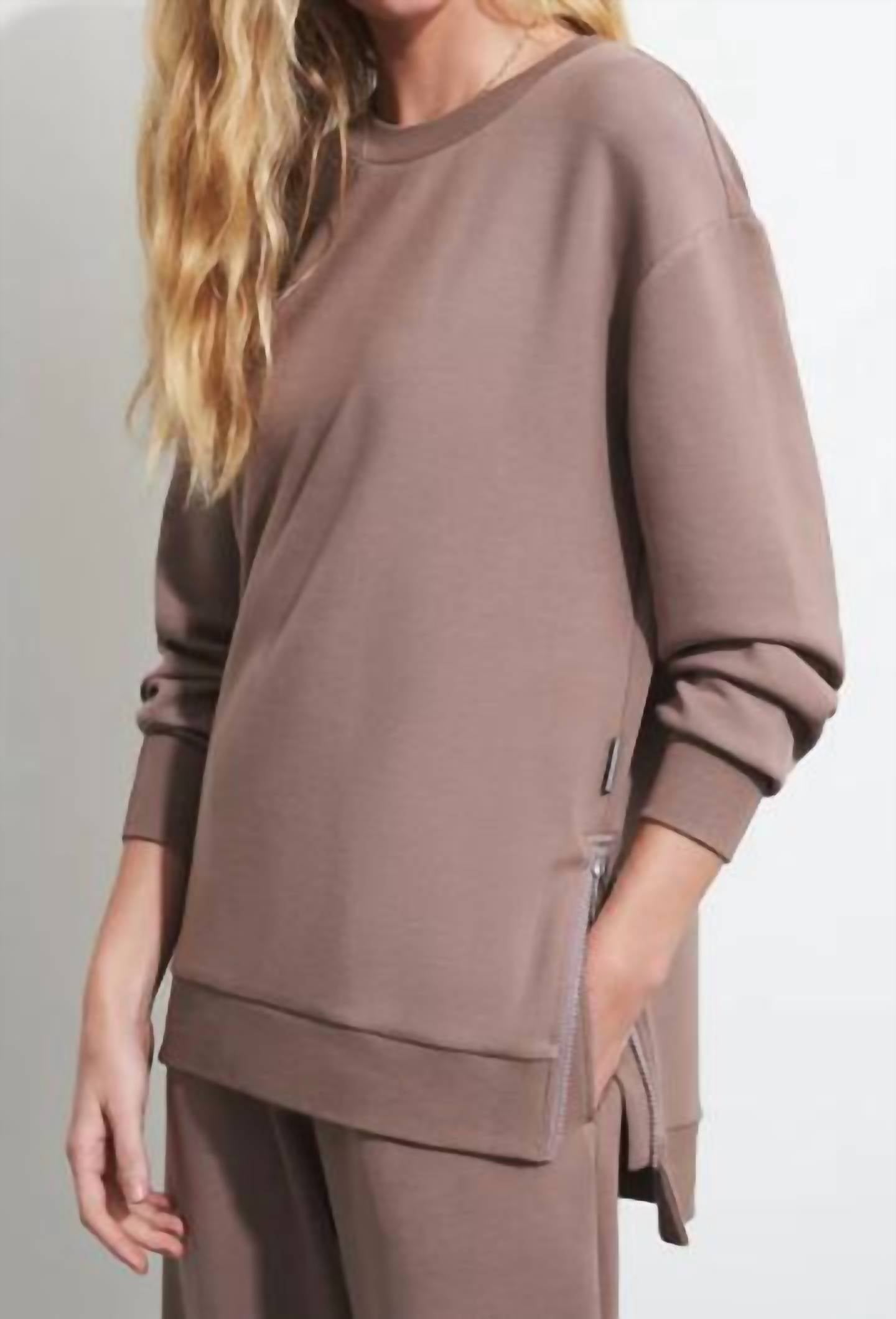 Experience ultimate comfort and elegance with the Charter Sweatshirt by VARLEY, in a rich Pine Bark hue. This piece is crafted with long sleeves from a luxurious viscose blend, featuring the added detail of side zip elements and a stylish dropped back hem. The material composition is 72% Viscose, 23% Polyester, and 5% Elastane, ensuring a lightweight feel that's perfect for spring gatherings like Thanksgiving dinners. Closure: Pull-on style.