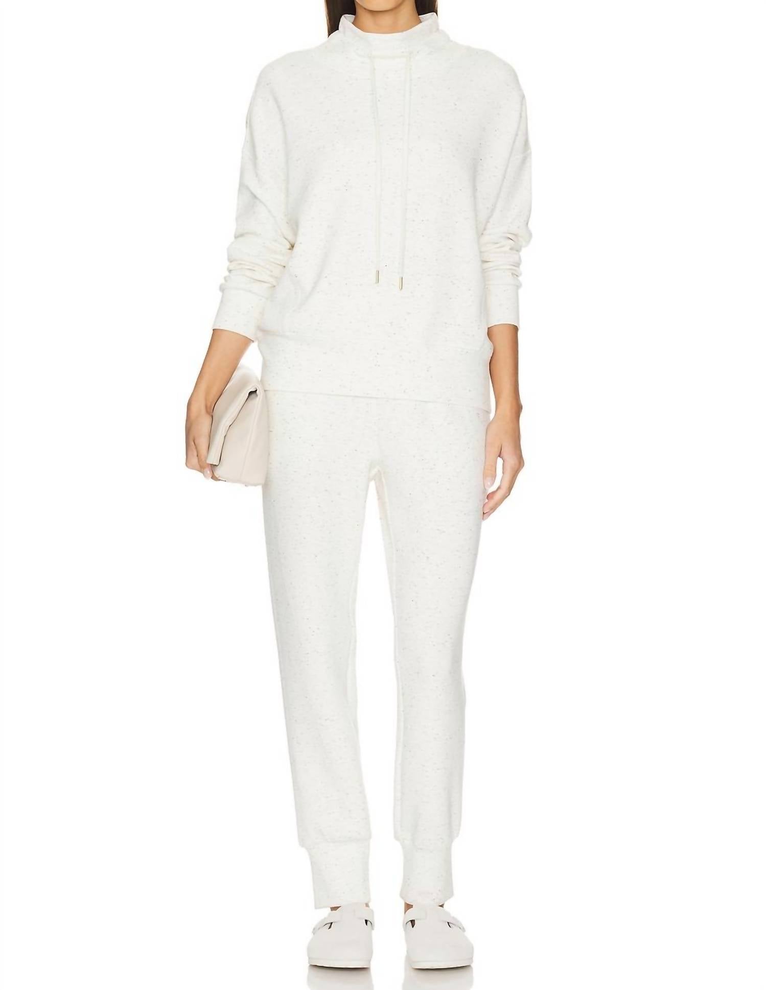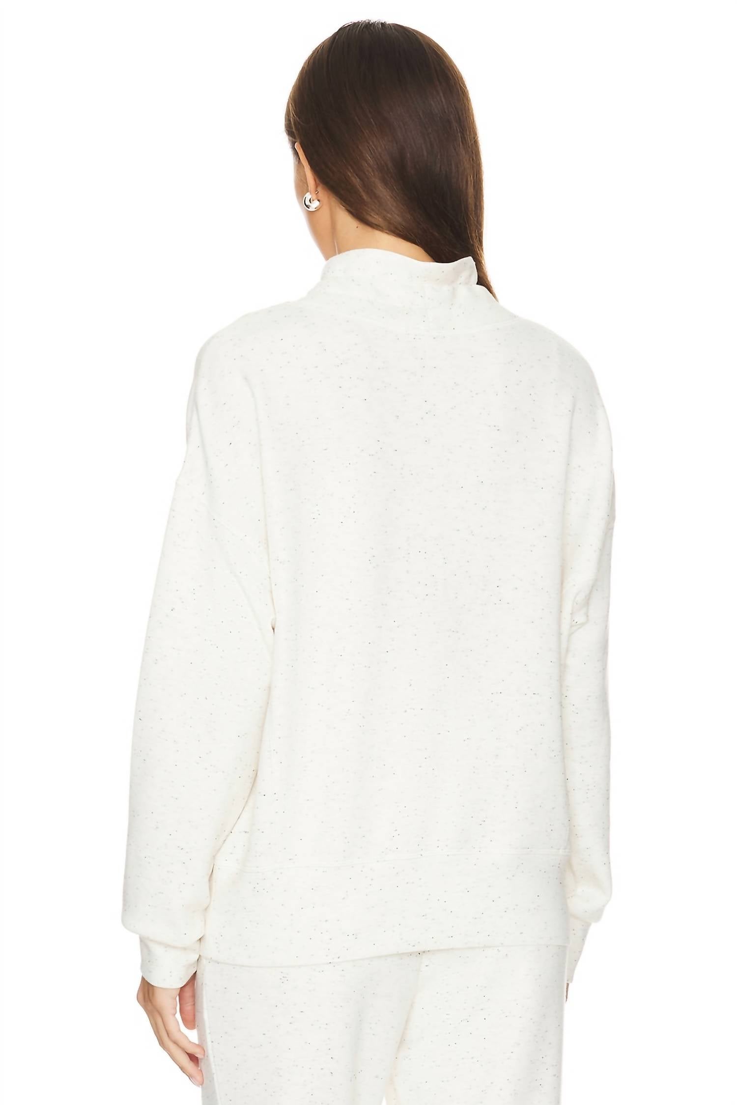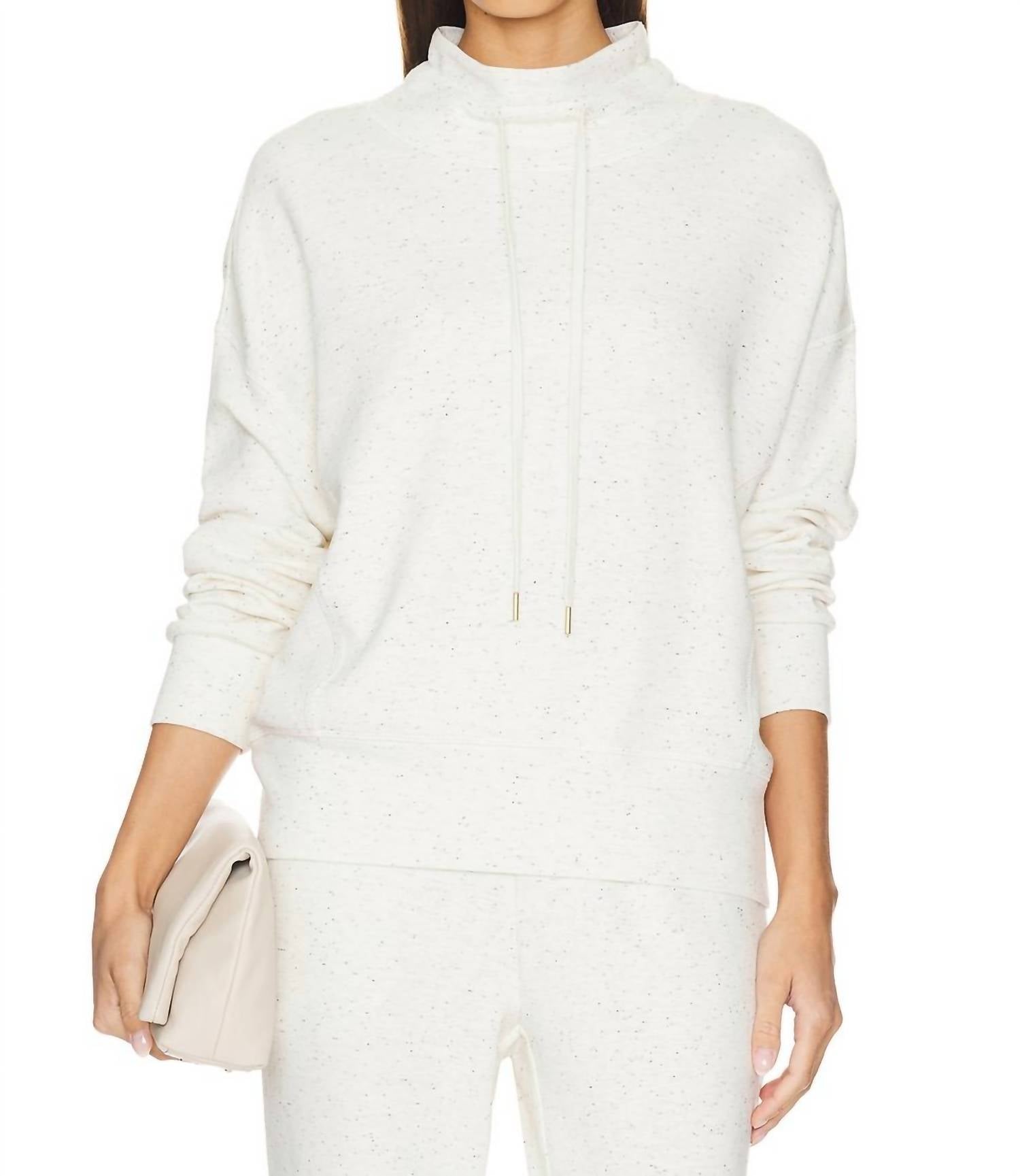 Cooler temps call for layering and we love this adorable sweatshirt for all the obvious reasons. Elevate your athleisure wardrobe with the Oakdale Sweat by VARLEY, designed for women seeking a blend of style and comfort. This ivory marl fleck sweatshirt features long sleeves and a built-up mock neck, perfect for fitness or casual outings. Made from a viscose blend of 72% viscose, 23% polyester, and 5% elastane, it offers a relaxed fit with a convenient pull-on closure. For care, simply machine wash and lay flat to dry. Front length measures 24.4" with a sleeve length of 18.5".
