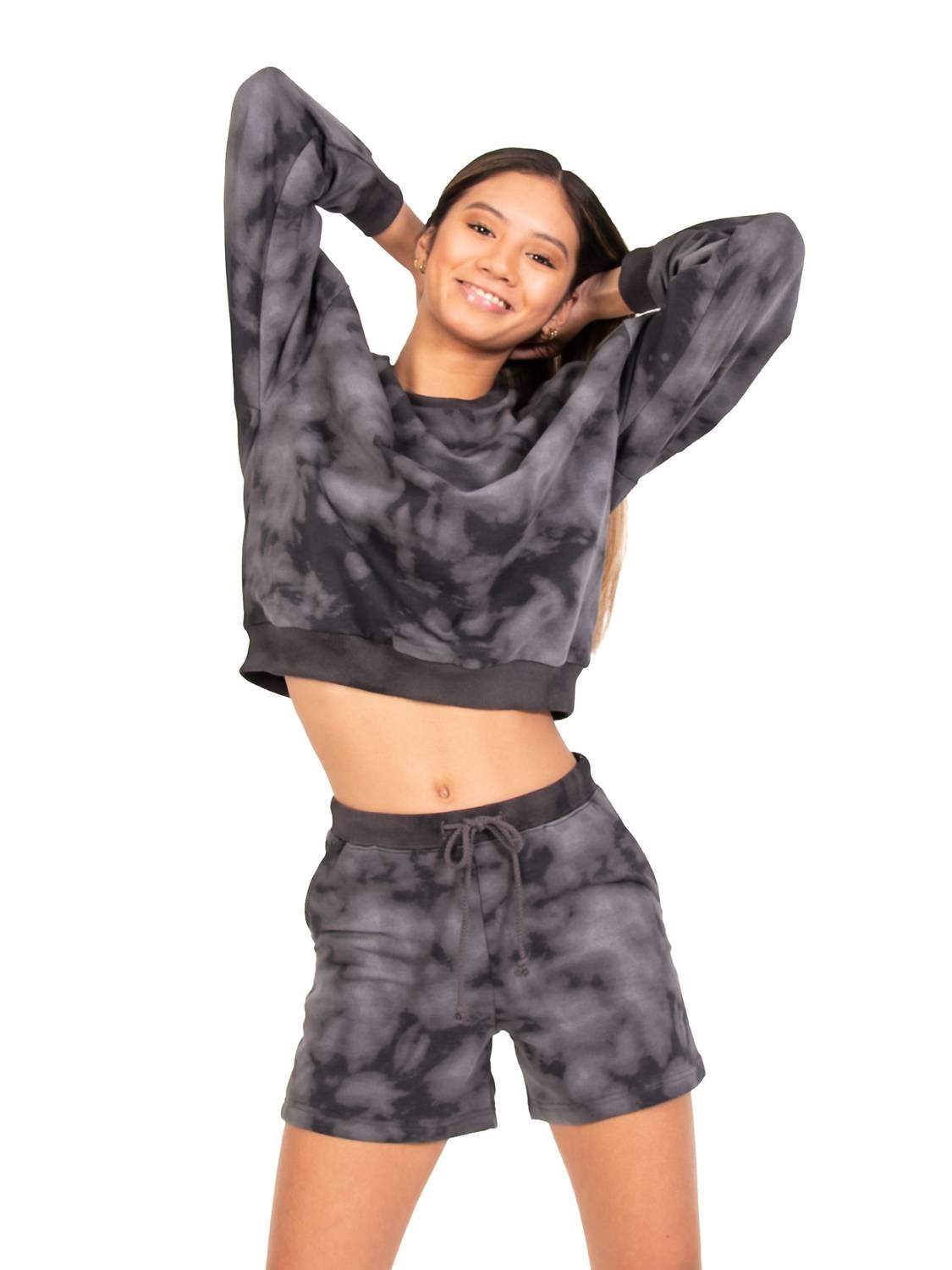 Discover the French Terry Dad Shorts with Drawstring by Body Wrappers, your new go-to for style and comfort. These high-waist shorts, crafted from a soft cotton blend, feature a chic tie-dye pattern in captivating charcoal, lavender, and pink tones. With a pull-on closure and added pockets, they are as functional as they are fashionable, perfect for layering over bike shorts or leotards. Composition: 55% Cotton, 40% Polyester, 5% Spandex. Care: Machine wash. Available from XS to 2XL, with a recommendation to size down for the perfect fit. Ideal for vacation or relaxed days at home.