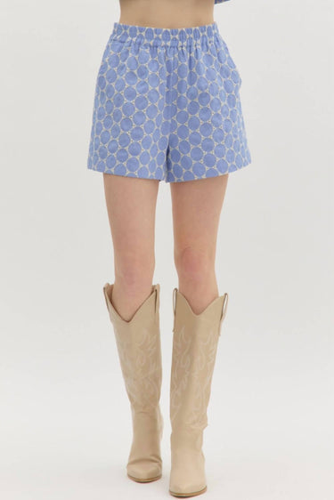 Introducing the Chambray Denim Embroidered Shorts by Entro, a chic addition to your summer wardrobe. These women's shorts feature a high-rise silhouette with a comfy pull-on closure, complete with an elasticated waistband and side pockets for convenience. Crafted from a lightweight 80% Cotton, 20% Polyester blend chambray denim, they showcase intricate ivory circle embroidery for a textured, maximalist look. With a 3" inseam, these imported shorts are lined for a non-sheer finish and are easy to care for with a machine wash cold and low tumble dry. Perfect for vacations, they come in a refreshing cornflower color.