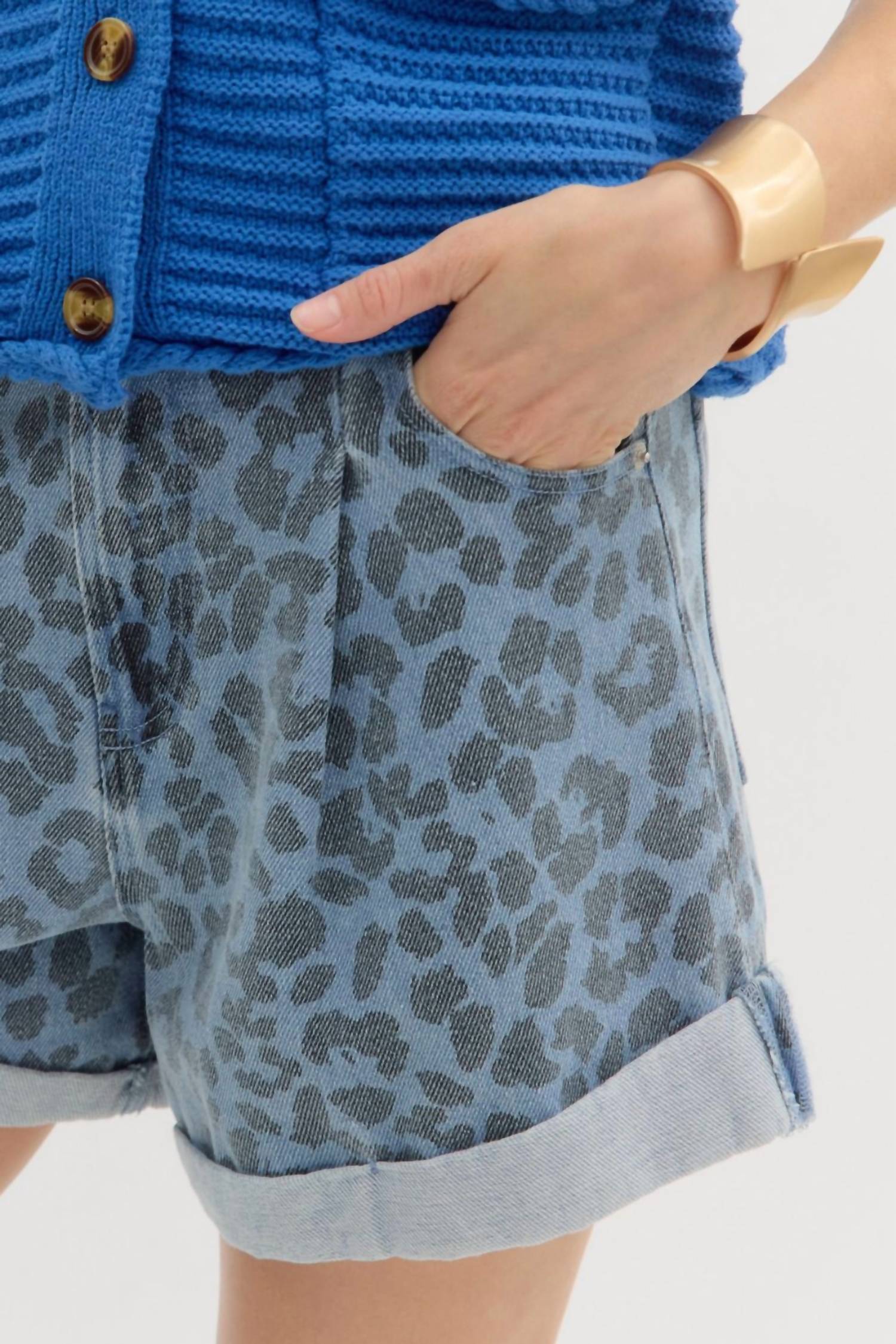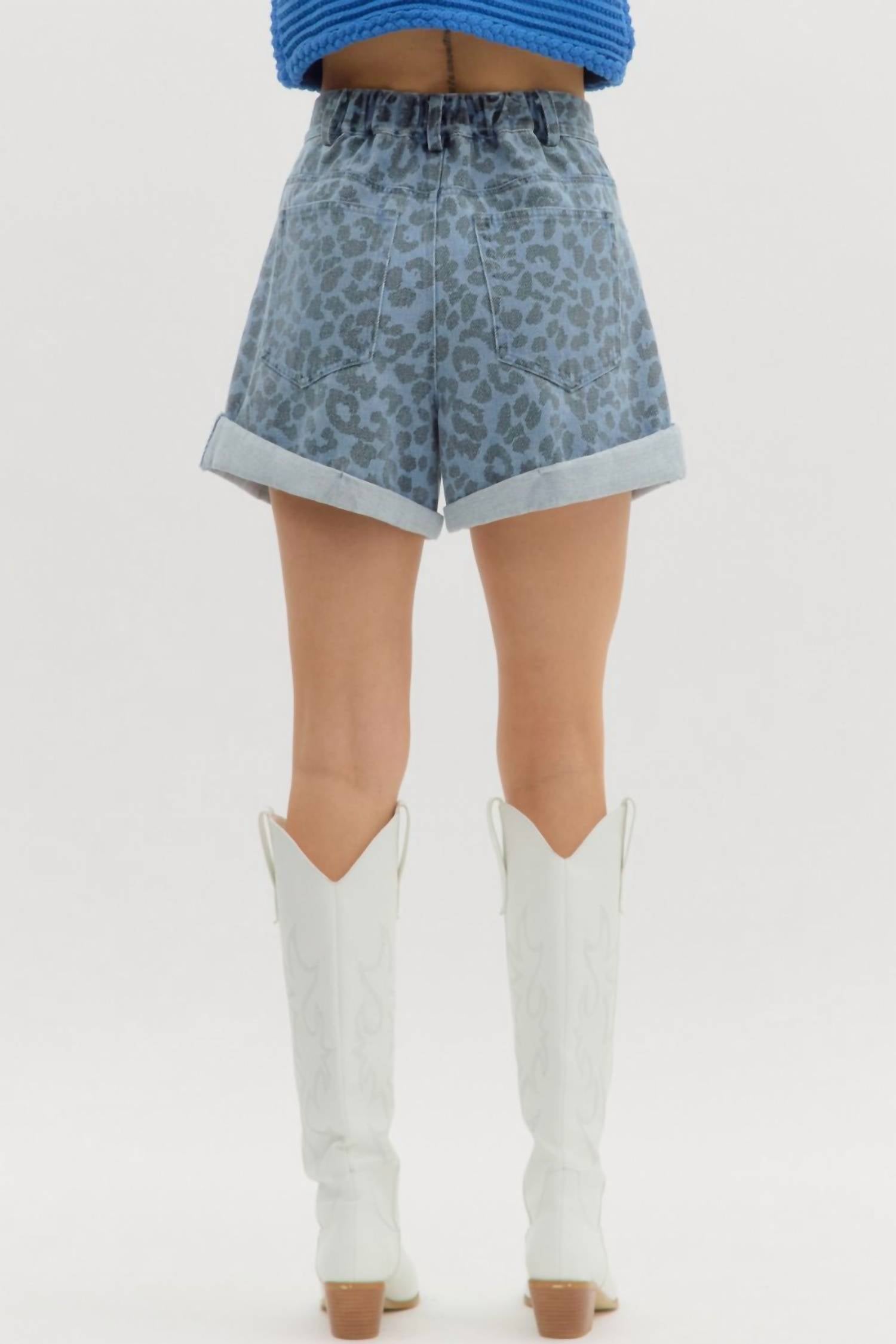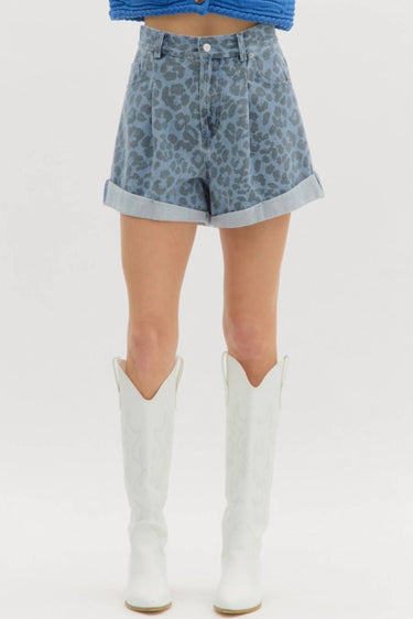 Discover the Denim High Waisted Shorts by Entro, featuring an abstract leopard print and trendy roll-up hem for a chic look. These shorts boast a classic button and fly-zipper closure and an elasticated back waistband, offering both style and comfort. Made from 100% cotton, they come equipped with practical front and back pockets. Care for this lightweight piece by machine washing and line drying.