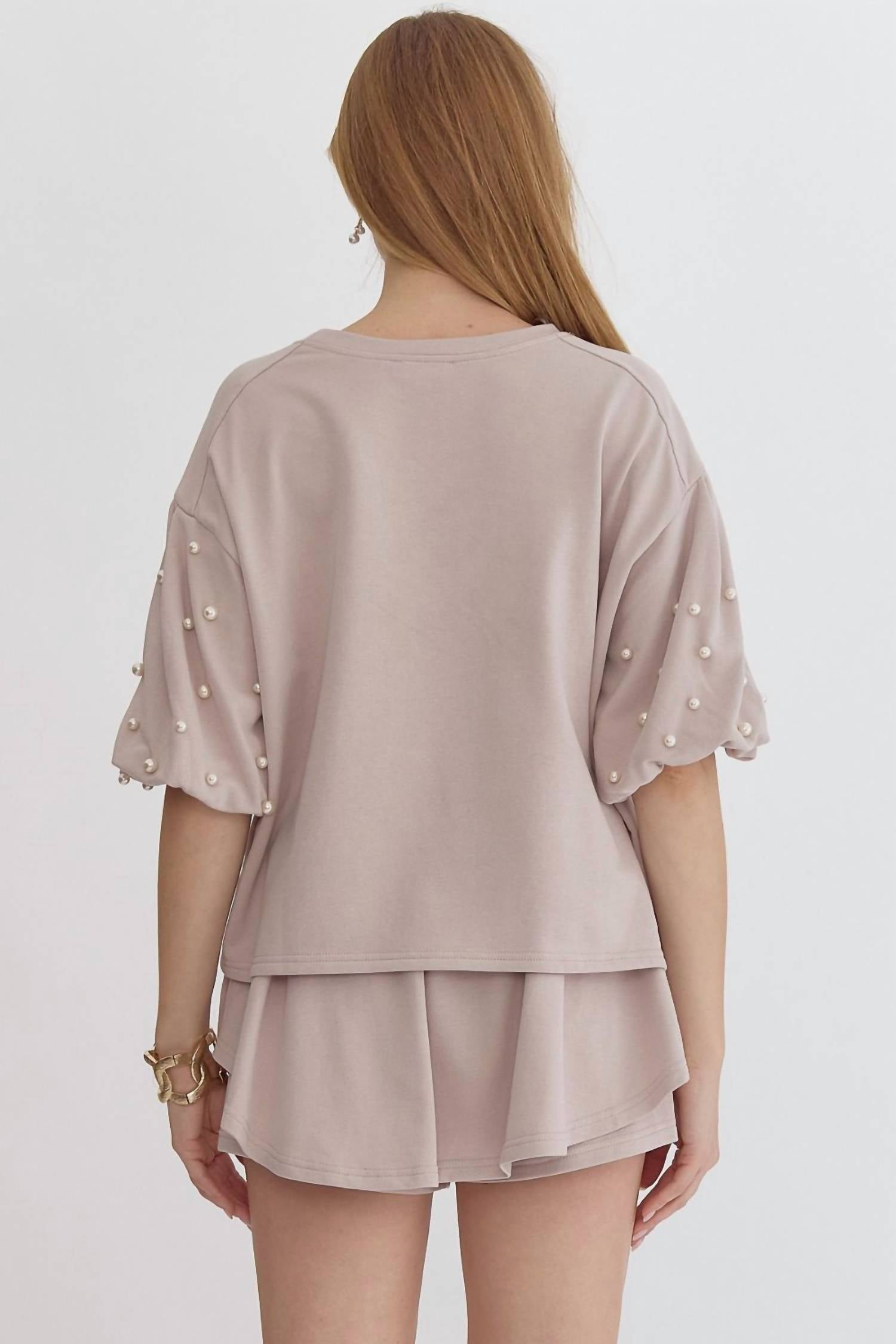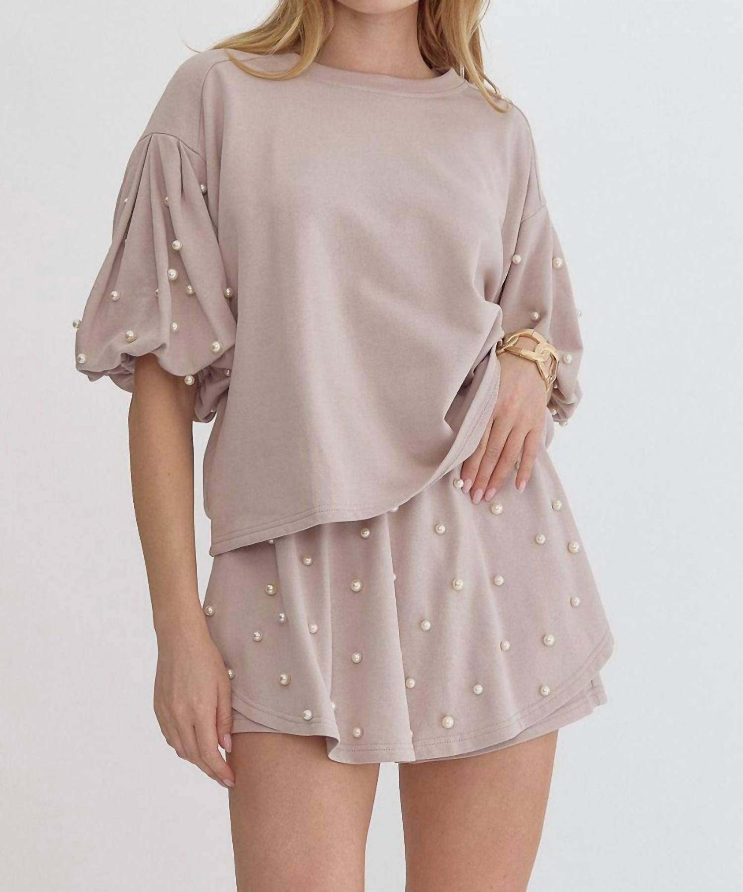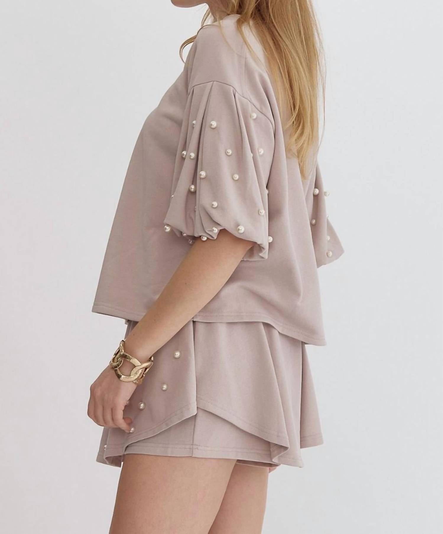The short-sleeve top is slightly oversized with puff sleeves and pearl embellishments, paired with a ruffle skort featuring a wide elastic waist also adorned with pearls. Composition: 82% Cotton, 18% Polyester. Origin: Imported from China. Closure: Pull on. Care: Hand wash cold, do not bleach, hang dry. Top fits oversize, while the bottom fits true to size.