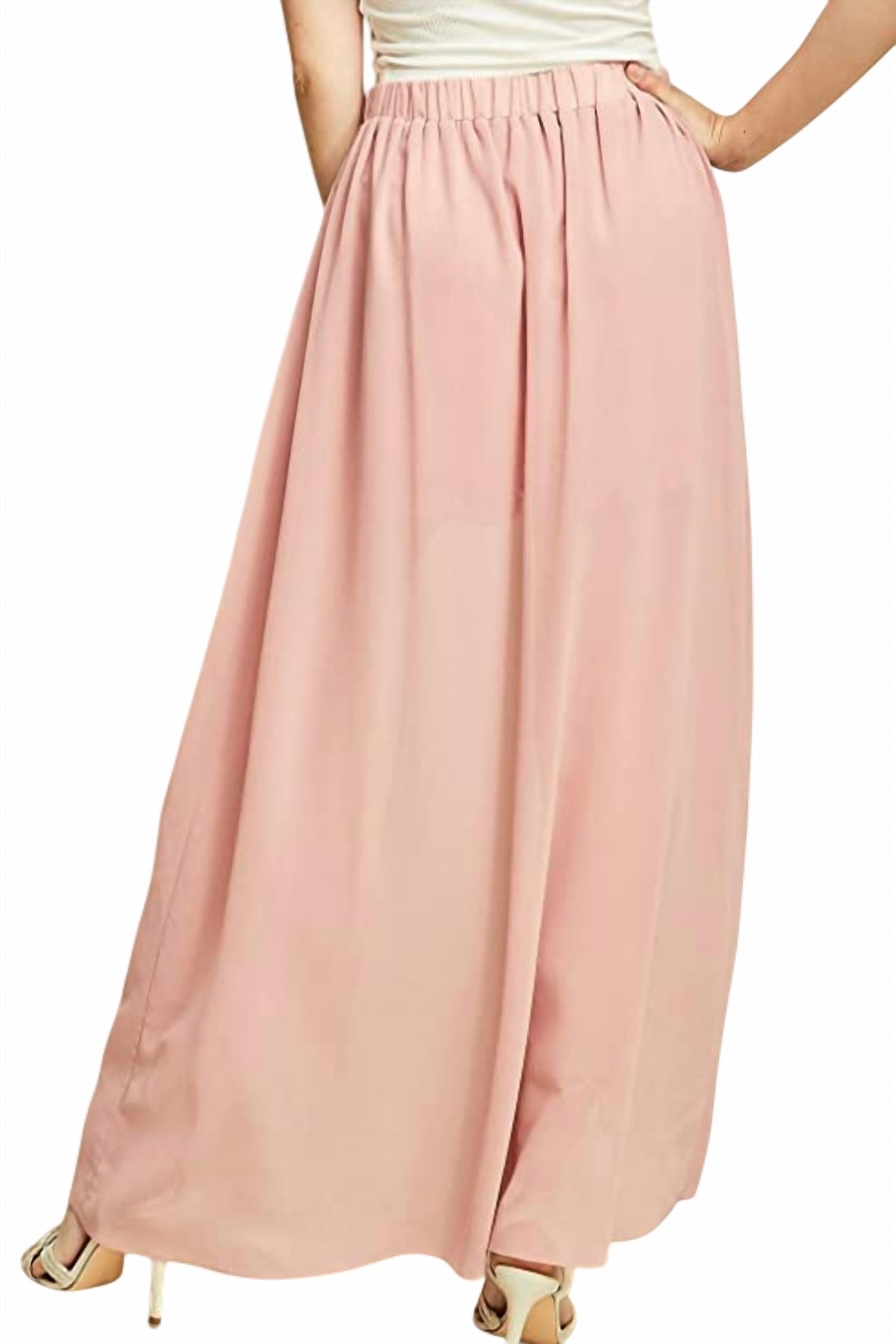 This maxi short features a high waist, half elasticized waistband, solid crinkled fabric, is partially lined, has a maxi length skirt panel and is light weight. Small: waist 26" Length 42", Medium: waist 28" Length 42", Large: waist 30" Length 42". 100% Polyester. Hand wash.