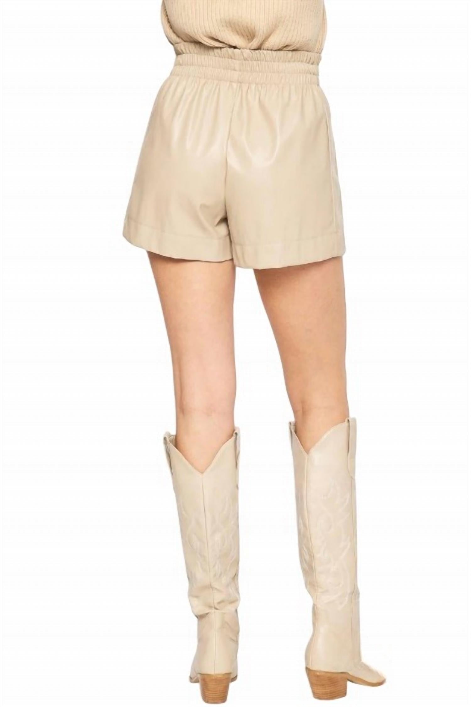 Introducing the Entro Katy Vegan Leather Shorts, a chic and comfortable addition to your wardrobe. These high-waisted shorts feature a sleek faux leather finish in a solid beige color, enhancing curves with a flattering fit. Composition: 55% PU, 45% Polyester, with convenient side pockets for added functionality. Closure: Pull on. Care Instructions: Machine wash cold, line dry, and do not bleach. Unlined and imported, these shorts effortlessly blend style and ethics, perfect for any occasion.