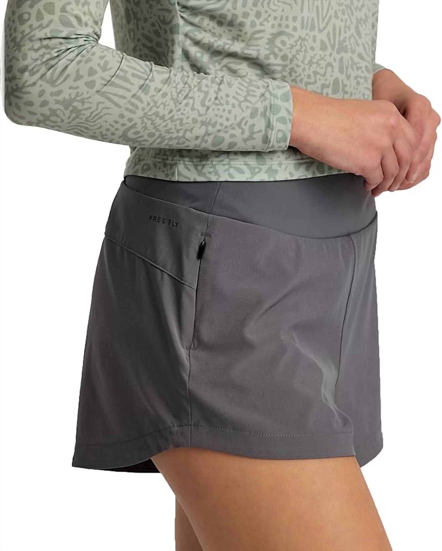 Introducing the Women's Bamboo Lined Active Breeze Short by FREE FLY, the ideal choice for your fitness and workout needs. These athletic shorts feature a high-rise, adjustable waistband with a pull-on closure, ensuring both comfort and style. The shorts boast a 3-inch inseam and are crafted with an ultra-lightweight and breathable fabric, with the shell composed of 86% recycled polyester and 14% spandex, and a bamboo viscose and polyester lining for exceptional comfort. Designed with a side zip pocket for convenience during activities like yoga, these shorts are perfect for the summer athleisure trend.