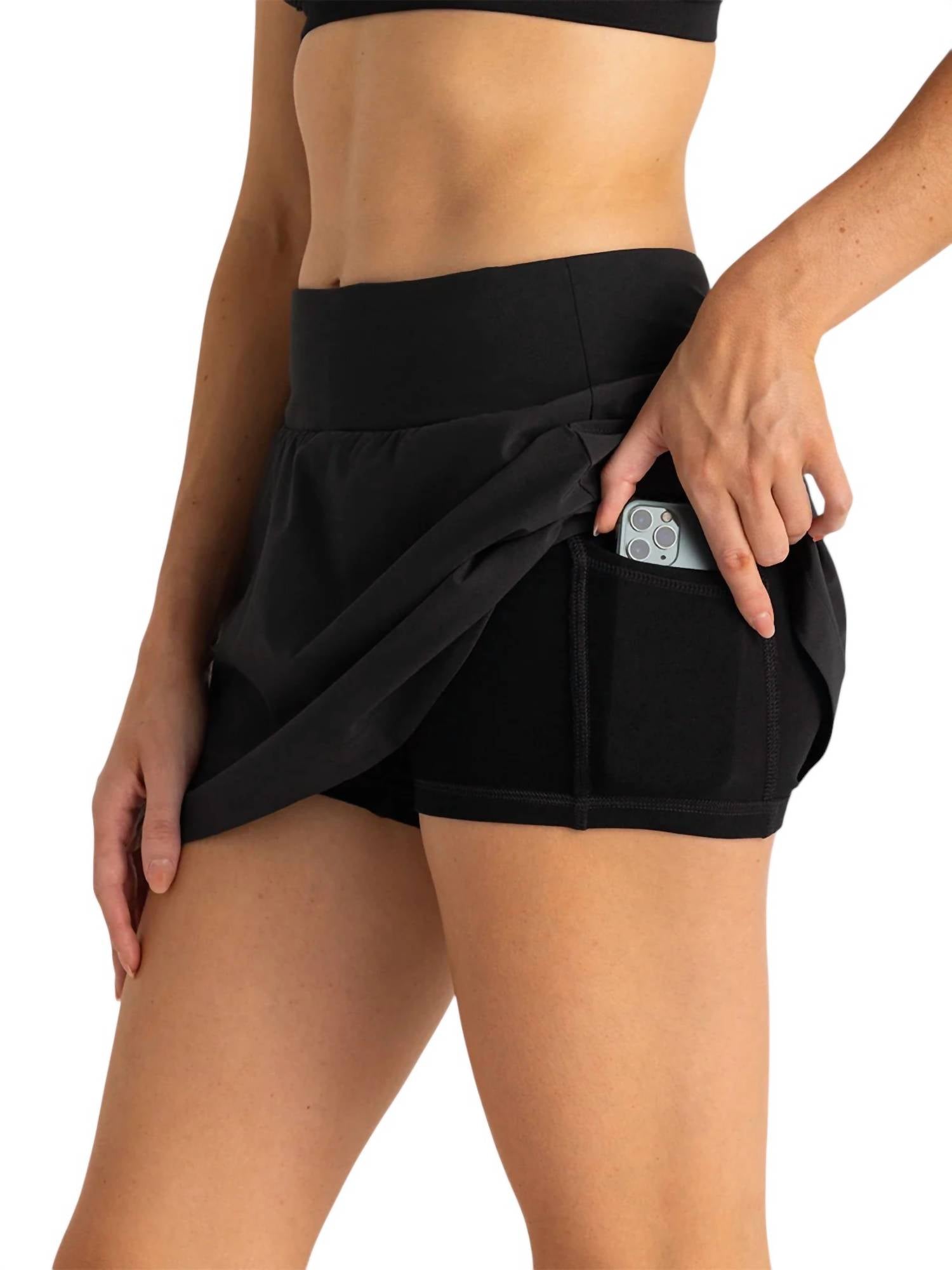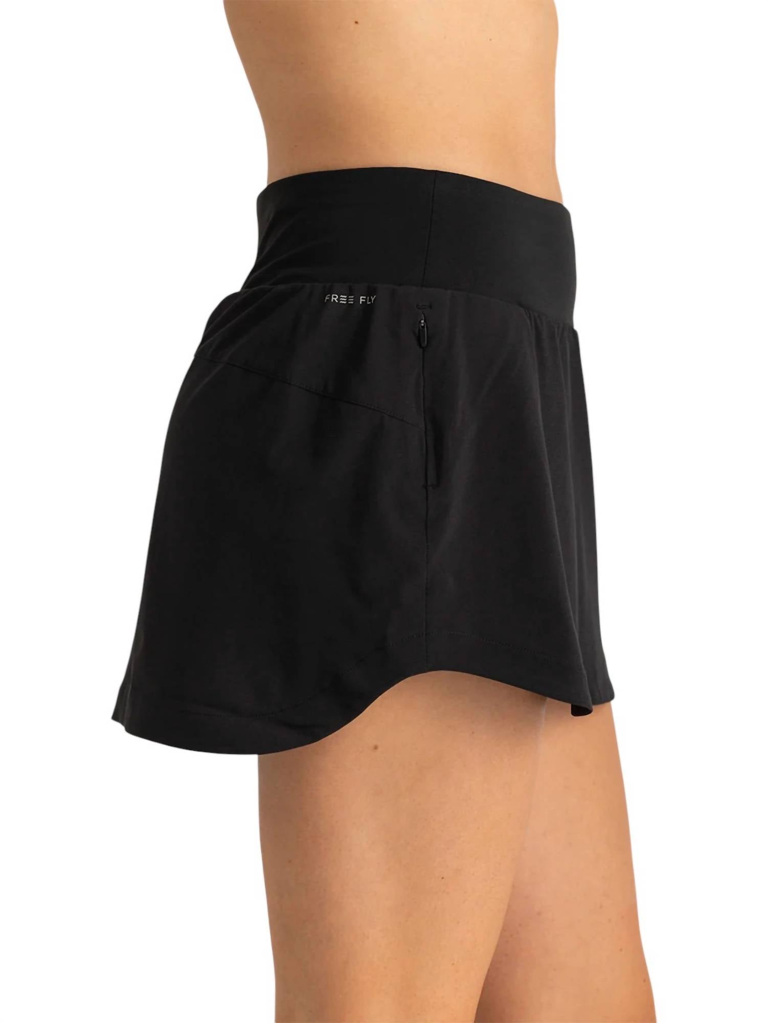 Introducing the Women's Bamboo Lined Active Breeze Short by FREE FLY, the ideal choice for your fitness and workout needs. These black, solid-colored athletic shorts feature a high-rise, adjustable waistband with a pull-on closure, ensuring both comfort and style. The shorts boast a 3-inch inseam and are crafted with an ultra-lightweight and breathable fabric, with the shell composed of 86% recycled polyester and 14% spandex, and a bamboo viscose and polyester lining for exceptional comfort. Designed with a side zip pocket for convenience during activities like yoga, these shorts are perfect for the summer athleisure trend.