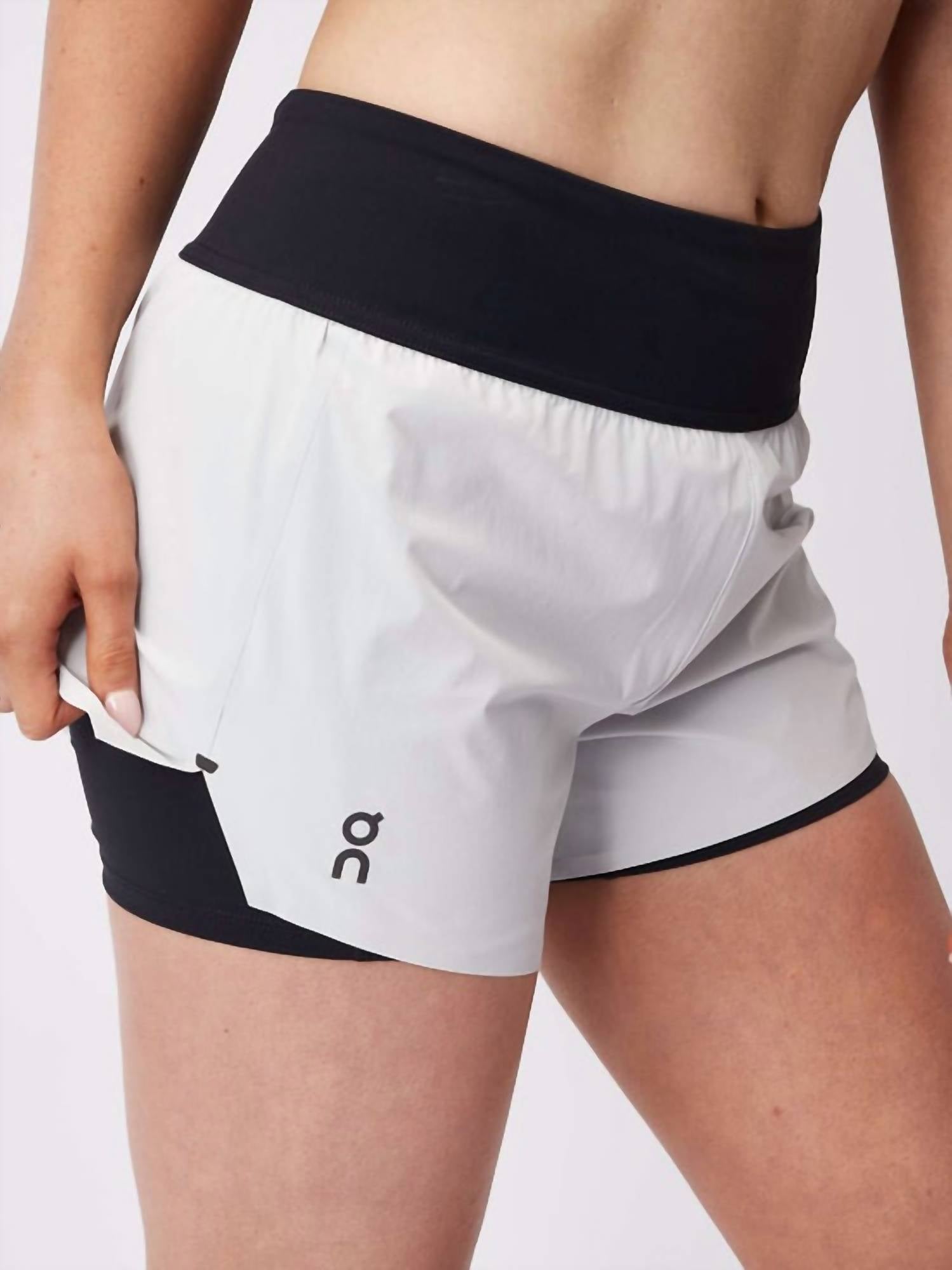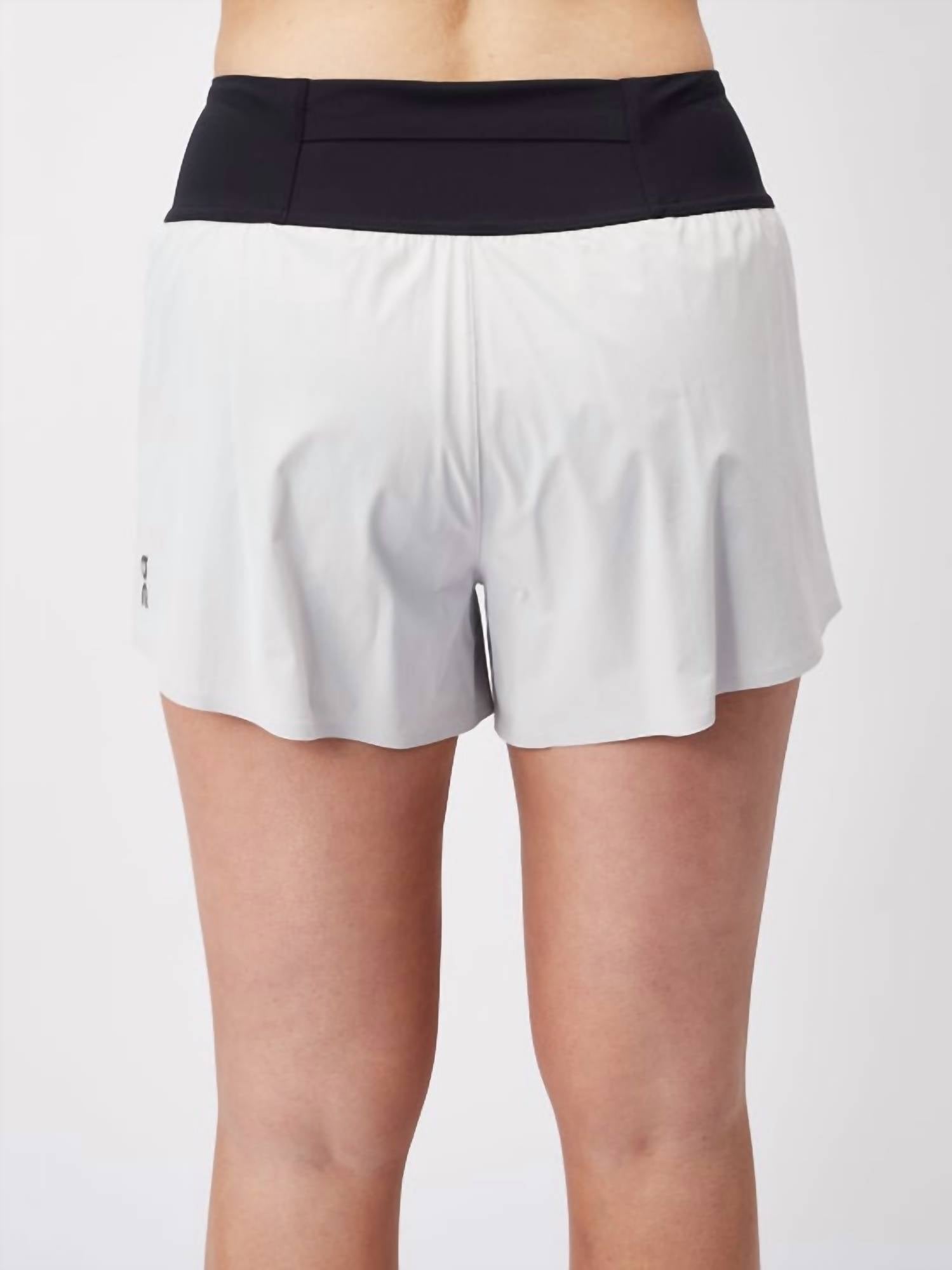 Unveiling the Running Shorts by On Cloud in Glacier Black, crafted to elevate your warm-weather training and racing routines. These women's athletic shorts feature a double-layered design with a comfortable compression waistband and mid-compression interior lining. Made from a lightweight performance jersey with a lining of 65% recycled polyamide and 35% elastane, they provide fast drying and sweat-wicking capabilities. Closure: Pull-on style. Care: Machine wash and line dry. With a reflective logo and a rise of 11in / 28cm, plus an inseam of 3.25in / 8cm, they're perfect for fitness workouts.