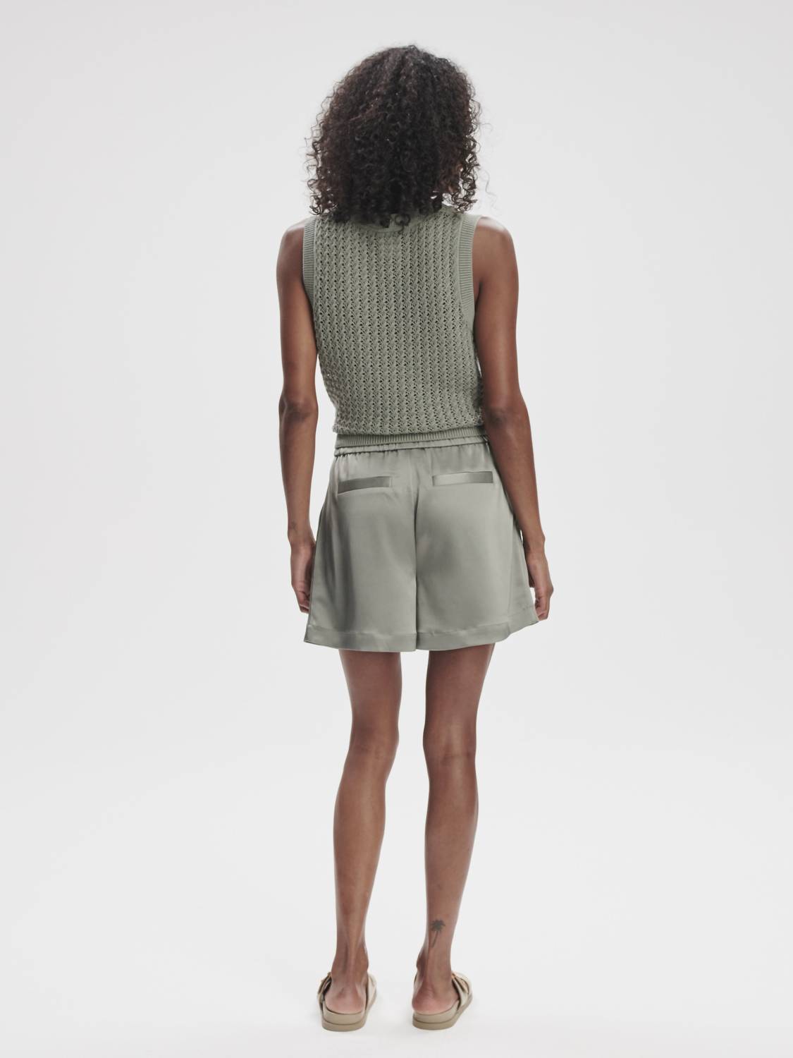 Introducing the Sarka High Rise Short by VARLEY, a sophisticated addition to your summer wardrobe in chic Gravity Sage. These women's shorts are crafted from a blend of 80% Acetate and 20% Polyester, ensuring a luxurious sateen finish. Featuring a high-rise cut with a fully elasticated gathered waistband, they offer comfort and style with their snap closure and fly-front zip. Practicality is enhanced with fully functional side pockets and mock pockets at the back. Care instructions include machine wash on a cool, gentle cycle, drying flat, and a cool iron inside out for maintenance.