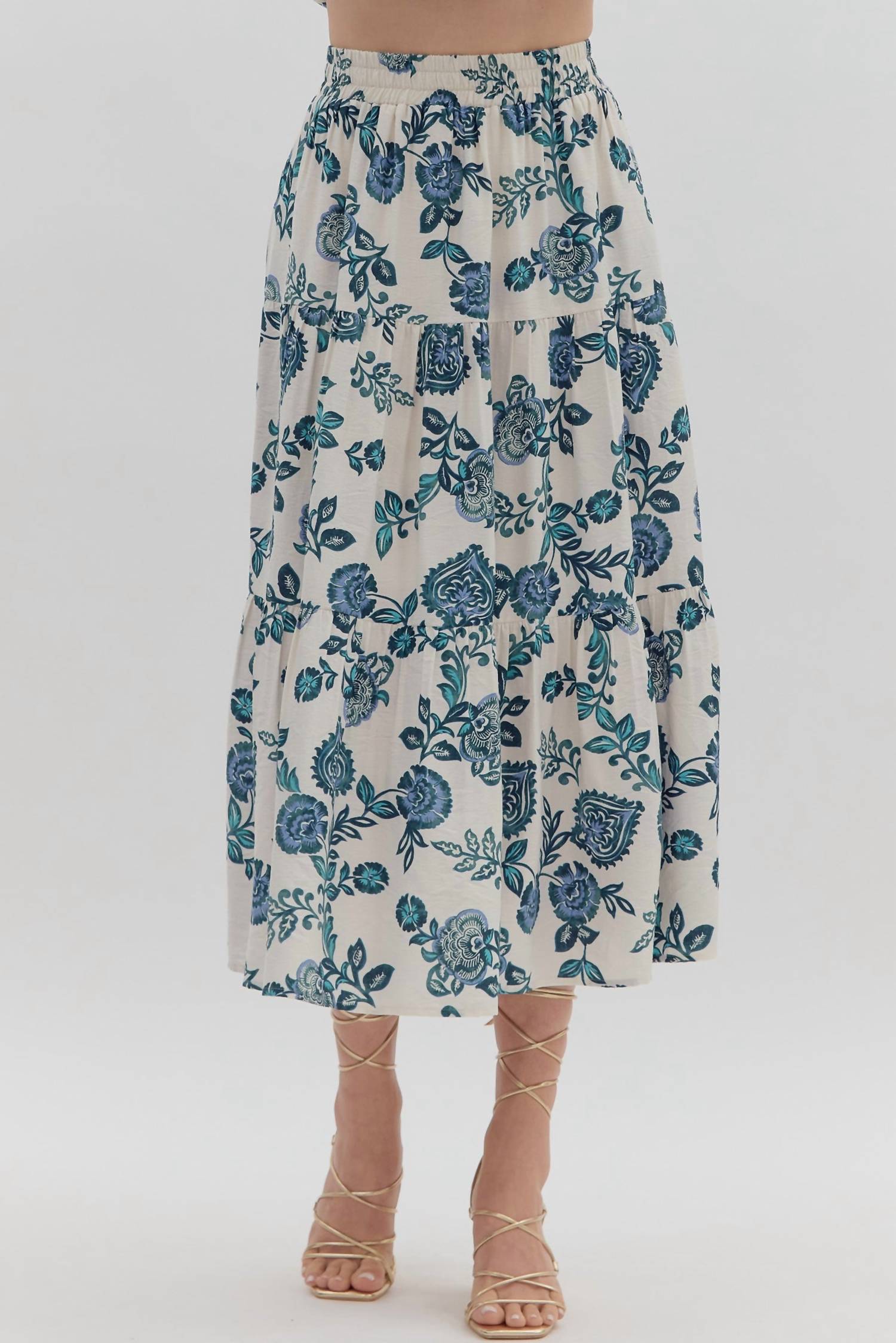 Introducing the Camille Floral Midi Skirt by Entro, a chic addition to your wardrobe in vibrant Oyster, Peacock, and Marine Navy hues. This women's tiered skirt features a lively large-scale floral pattern, elastic waistband, and convenient pockets for added functionality. Crafted from 80% Rayon and 20% Nylon with a 100% Polyester lining, this 35-inch midi length skirt offers a comfortable pull-on closure. Care instructions include hand washing only. The perfect choice for spring occasions, from Easter celebrations to vacation getaways.