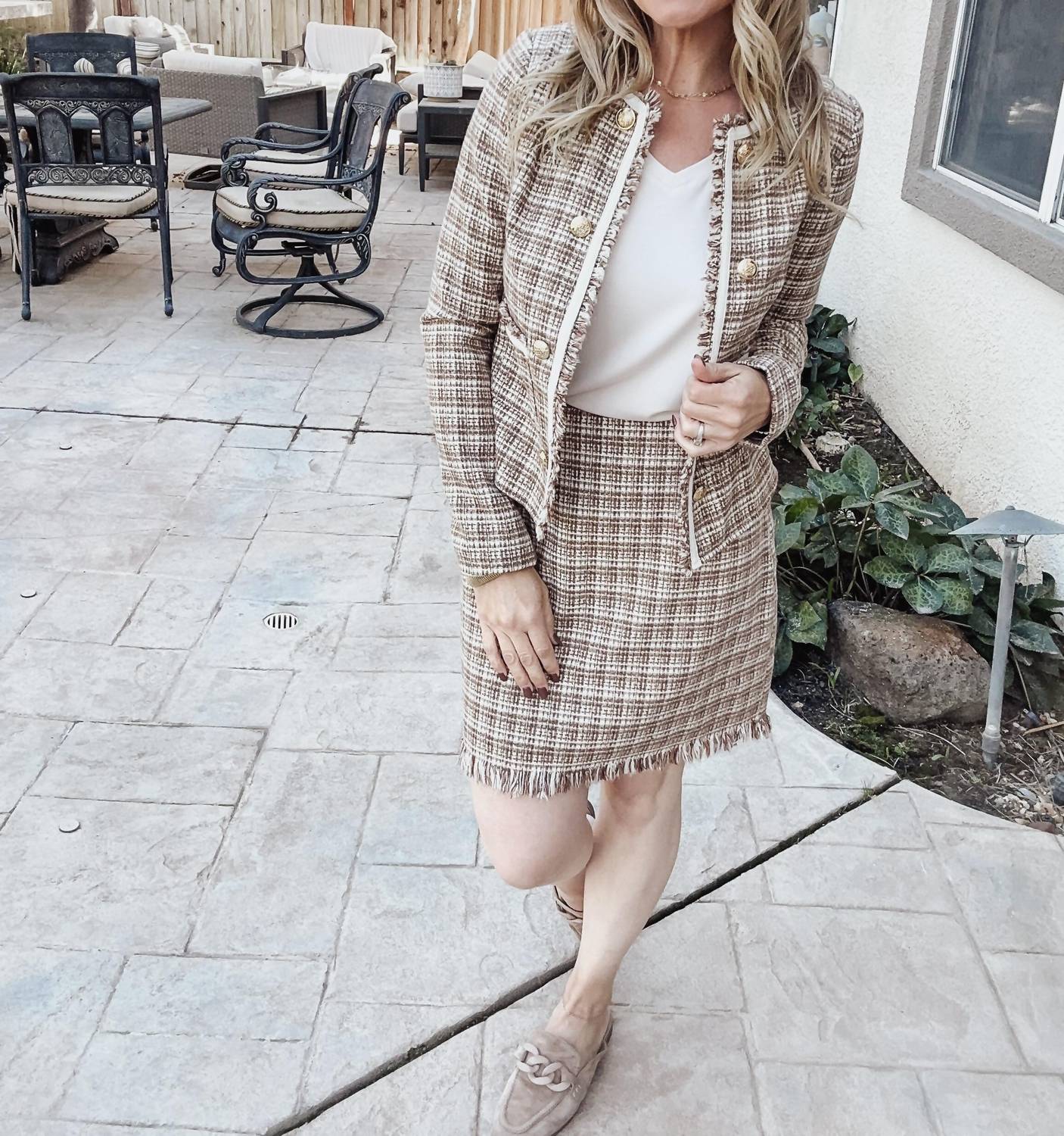 Make a statement with the Women's Holiday In The City Tweed Skirt by Entro, an embodiment of preppy chic styling in a taupe plaid and check pattern. Designed for a sophisticated dinner party look, this midi skirt makes elegance effortless. With its timeless tweed composition, it brings a touch of luxury to your spring wardrobe. Perfect for women seeking to blend staple pieces with modern elegance.