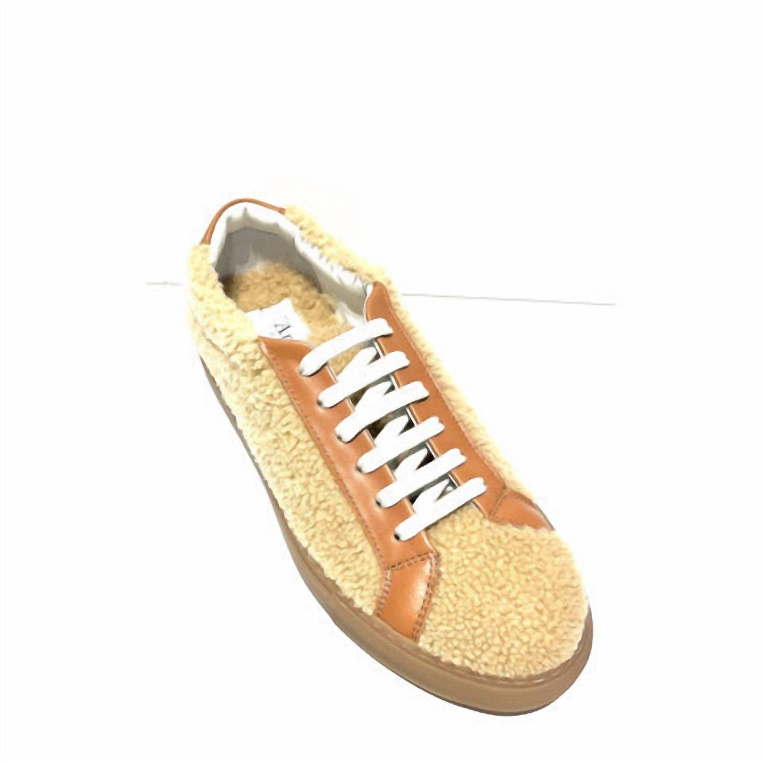 Introducing the Antenora Women's Shearling Sneaker in striking gold, crafted for unmatched comfort and style. These sneakers feature a distinctive combination of shearling and leather, providing a luxurious texture complemented by a shearling insole for added coziness. Designed with a round toe, they are made in Italy, ensuring high-quality craftsmanship. Enjoy a playful yet sophisticated addition to your footwear collection.
