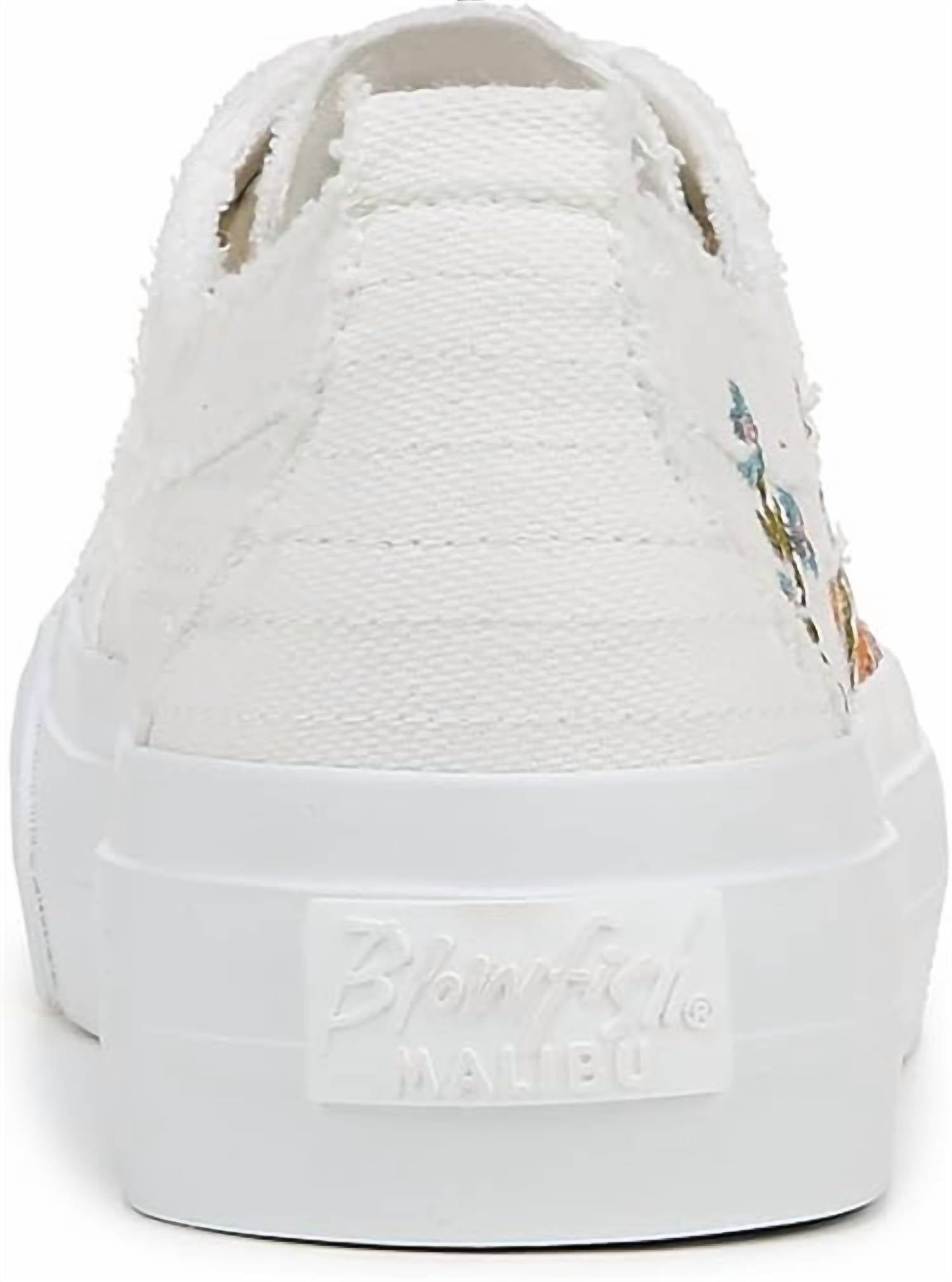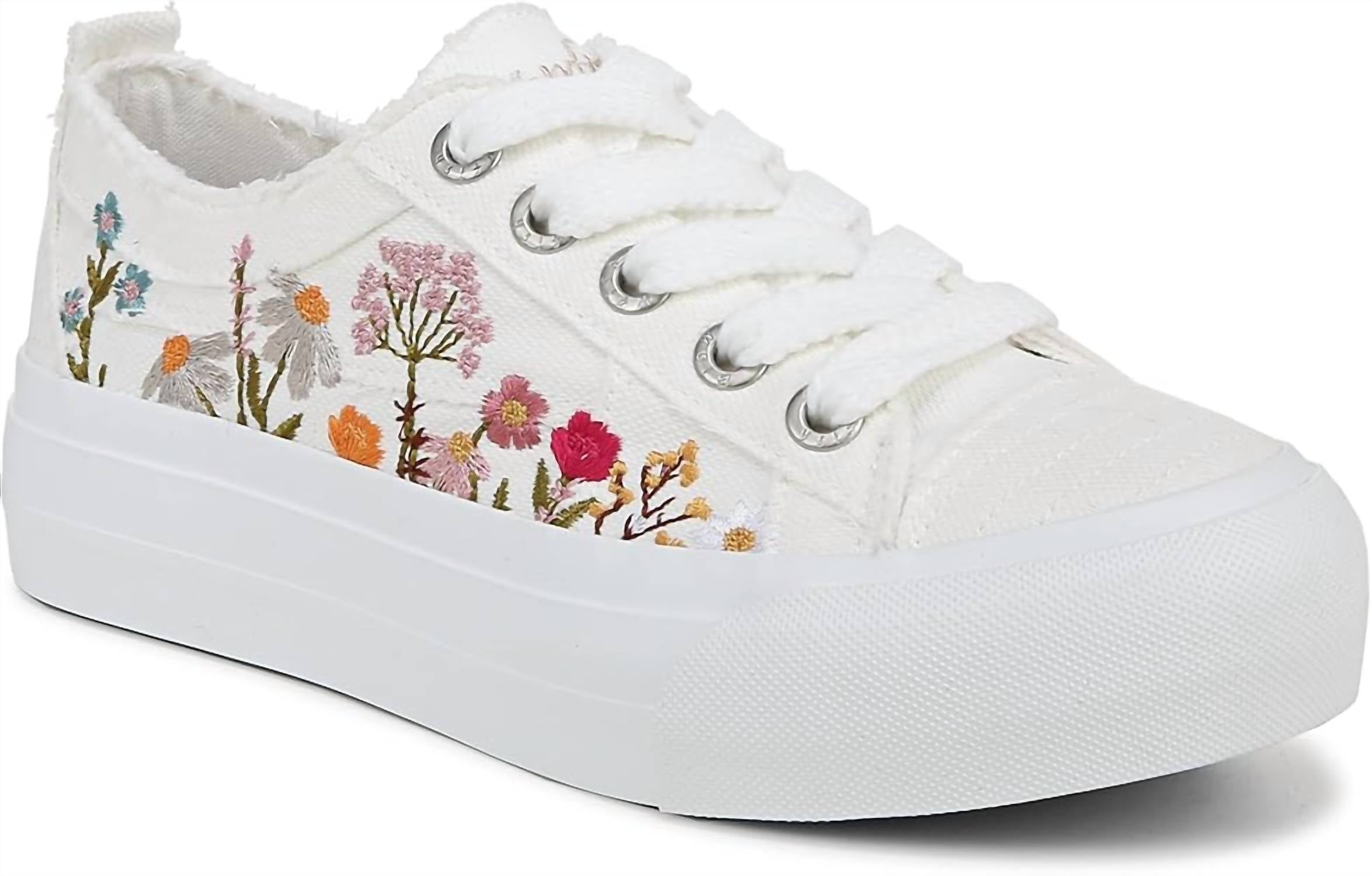 Elevate your spring wardrobe with the Women's Sadie Sneakers by Blowfish Malibu, the perfect blend of style and comfort. Crafted from crisp white canvas with charming embroidered wildflowers, these sneakers feature a medium width and round toe design. The platform heel offers a flat and comfortable boost, perfect for all-day wear. Enjoy the easy lace-up style with eye-catching frayed edges, ideal for pairing with sundresses or casual denim.