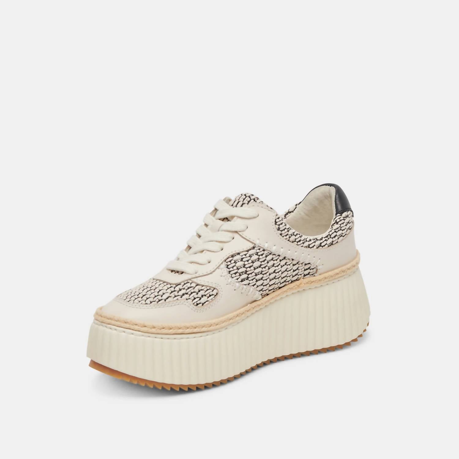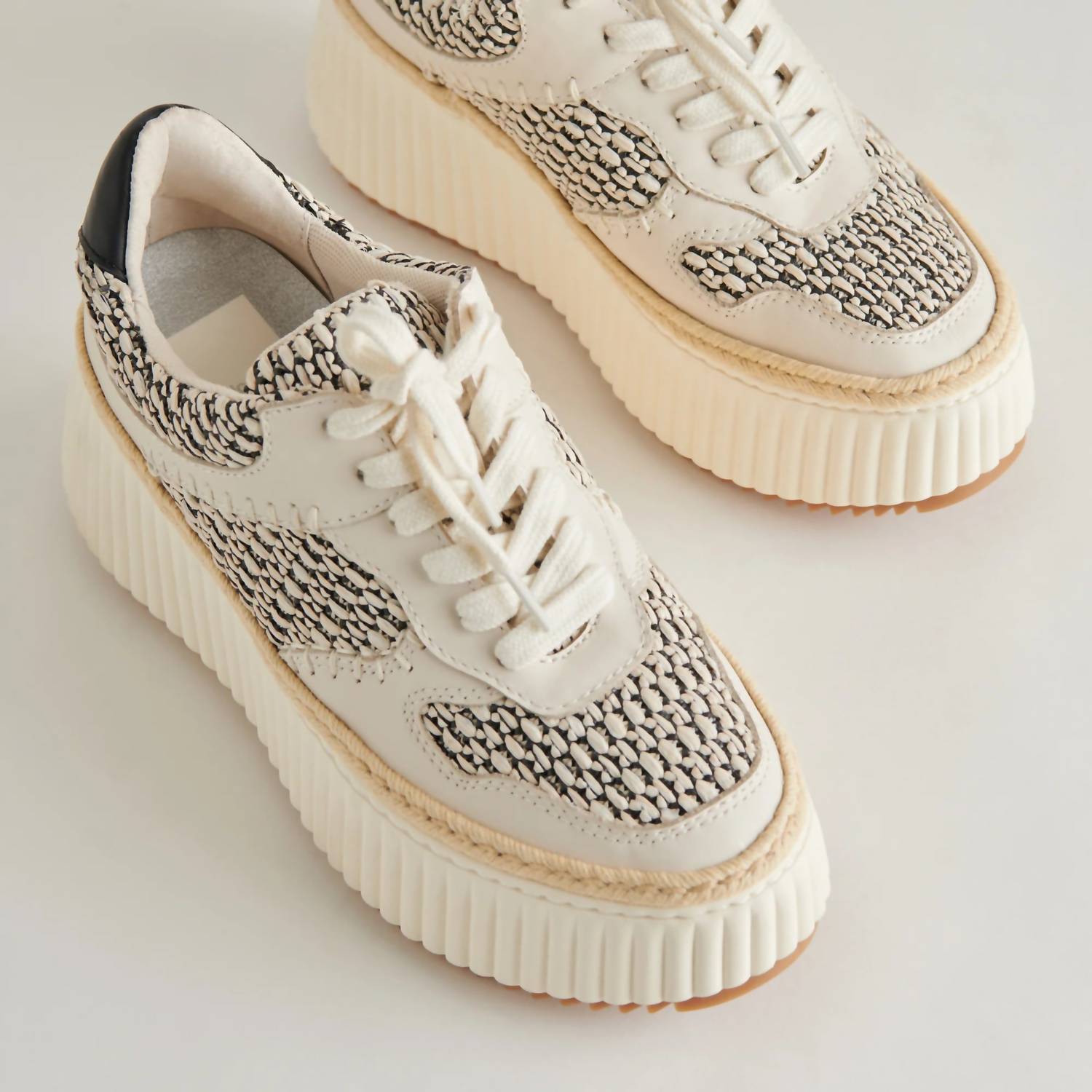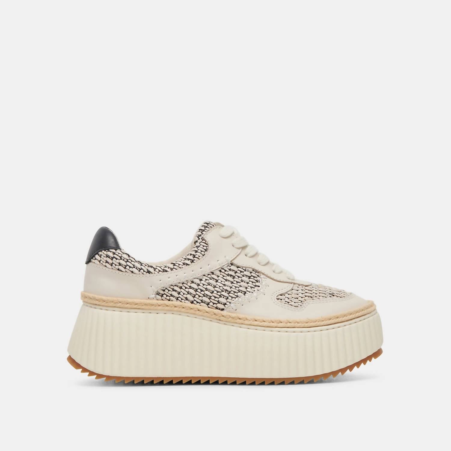 Step into style with the Women's Dandi Sneakers by Dolce Vita, featuring a natural color and stylish raffia detailing. These chic sneakers boast synthetic raffia and leather uppers and a comfortable lace-up style, perfect for spring streetwear. The design includes a 2" wedge heel and a 1/2" platform, combining fashion and comfort effortlessly. Complete with a round toe shape, these shoes elevate any casual ensemble.