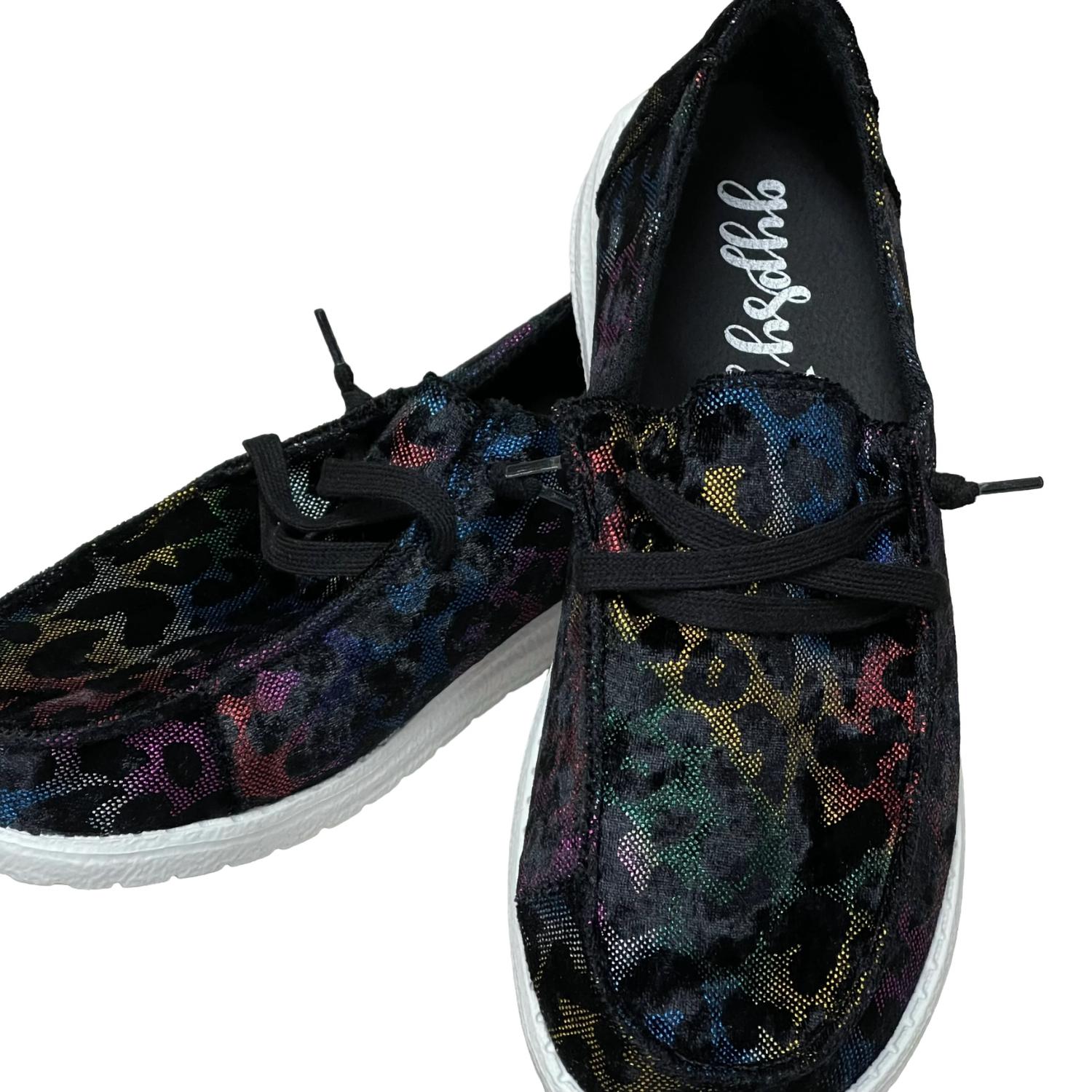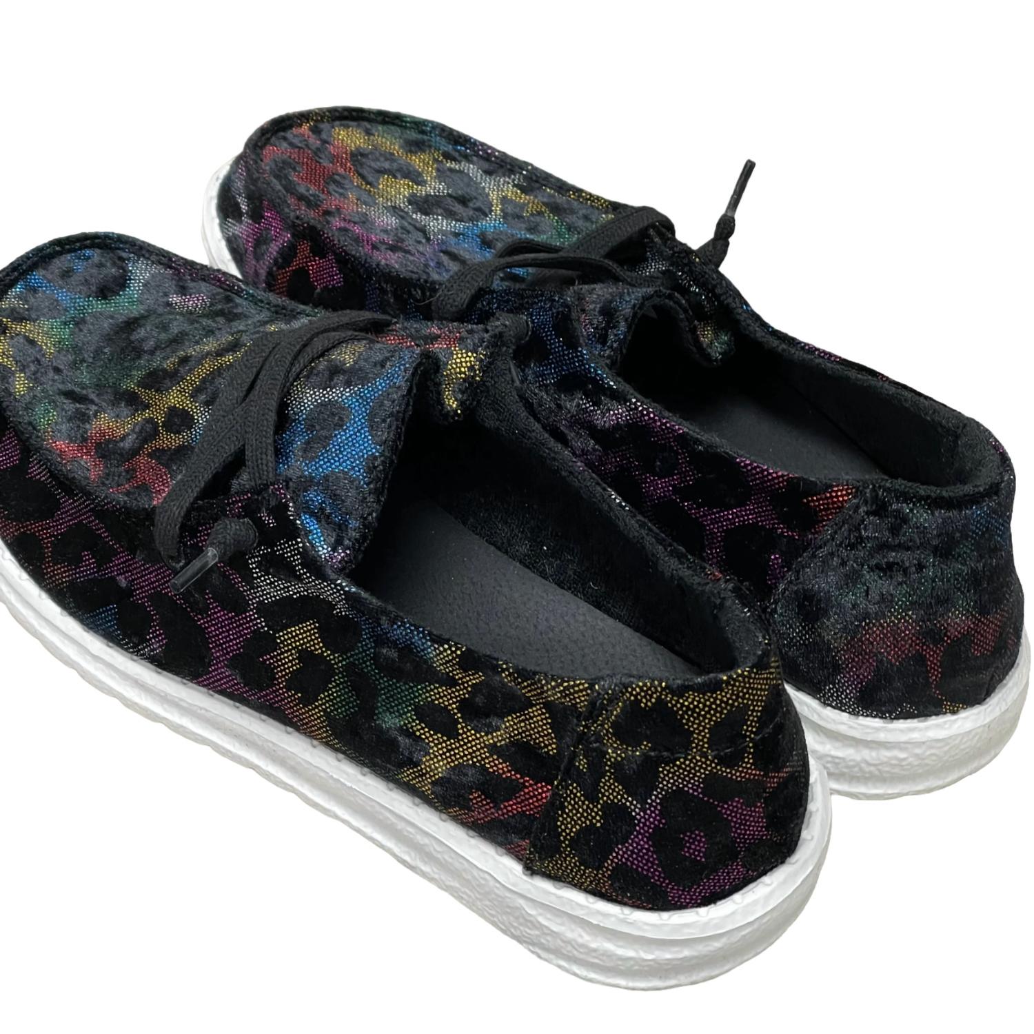 Get your daily steps in with these adorable sneakers.Round toe slip-on sneakers with lace detail in a multi-print design. They feature a padded insole and a white rubber outsole for enhanced comfort.