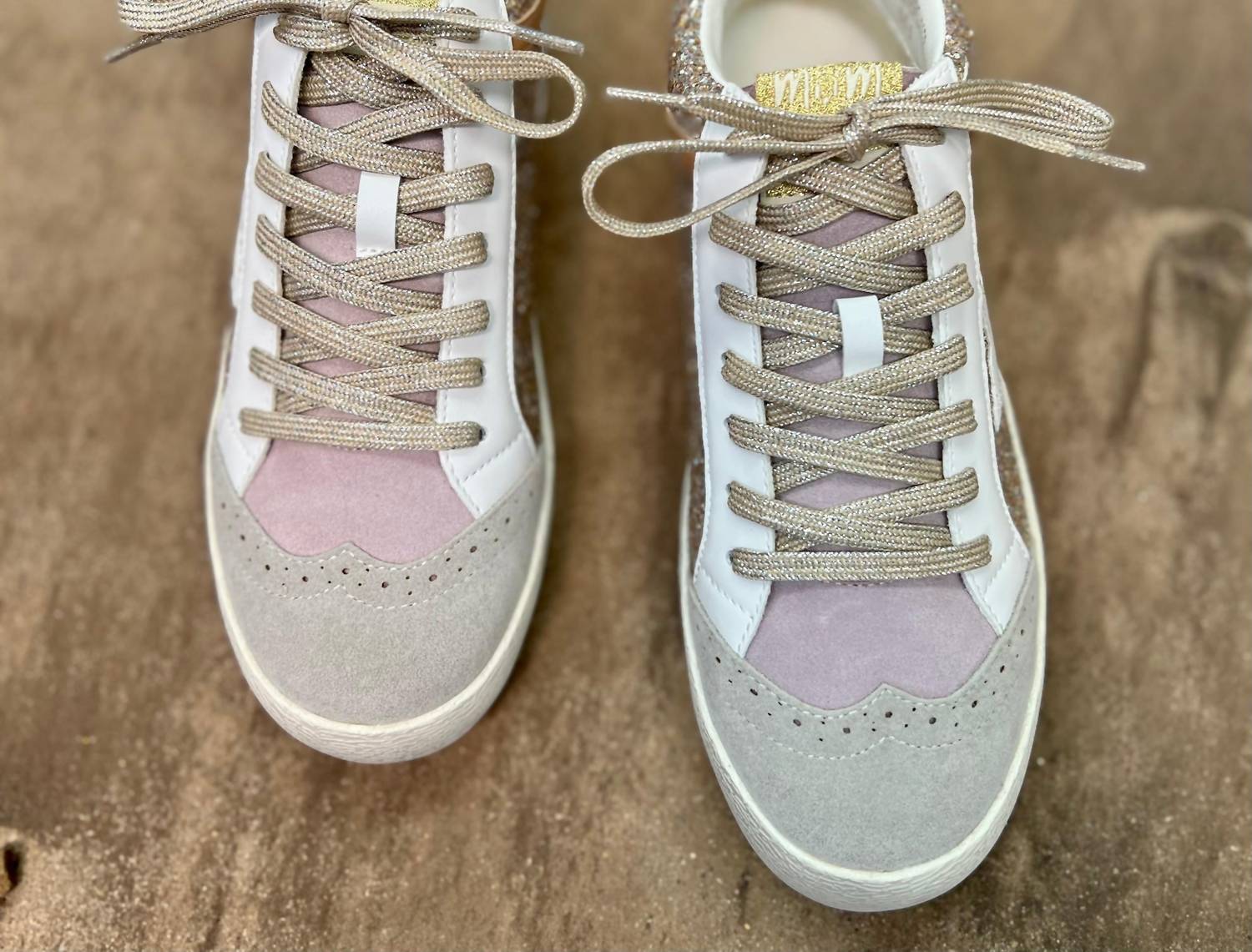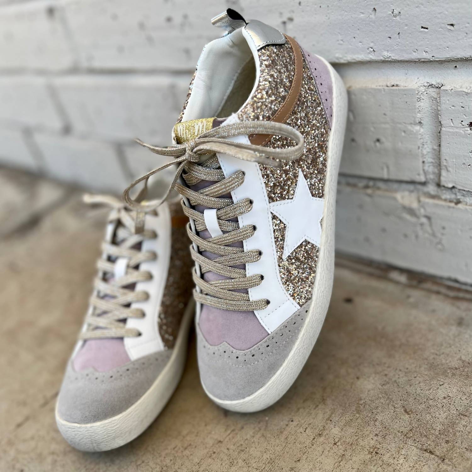 Introducing the Women's Oxford Sneakers by MiiM, a perfect fusion of luxury and style in lilac and gold. Featuring a classic Oxford high-top design, these sneakers are crafted from a suede-like material adorned with shimmering gold glitter and a stylish white star. Composition: Man-made materials for a comfortable fit. These sneakers are true to size, ensuring a perfect fit for every step.