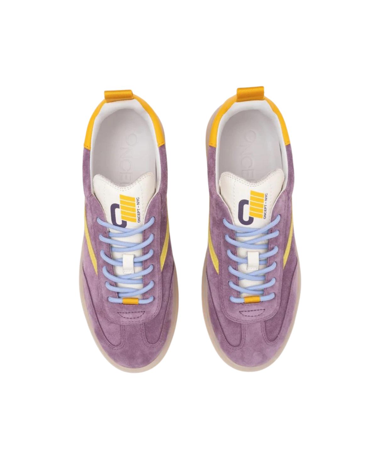 Introducing the Women's Crushed Panama Sneaker by Oncept, a stylish choice for your spring streetwear wardrobe. These low-top sneakers feature a luxurious combination of ultra-soft luxe leather and tencel pulp-based twill lining, complemented by Re-nylon spiral laces and a leather sock for ultimate comfort. The round toe design offers a comfortable fit, and the platform heel ensures enduring style. Designed for the savvy traveler, they're perfect for vacation wear in a vibrant grape hue, boasting a molded footbed made with recycled materials and re-speckled bottoms.