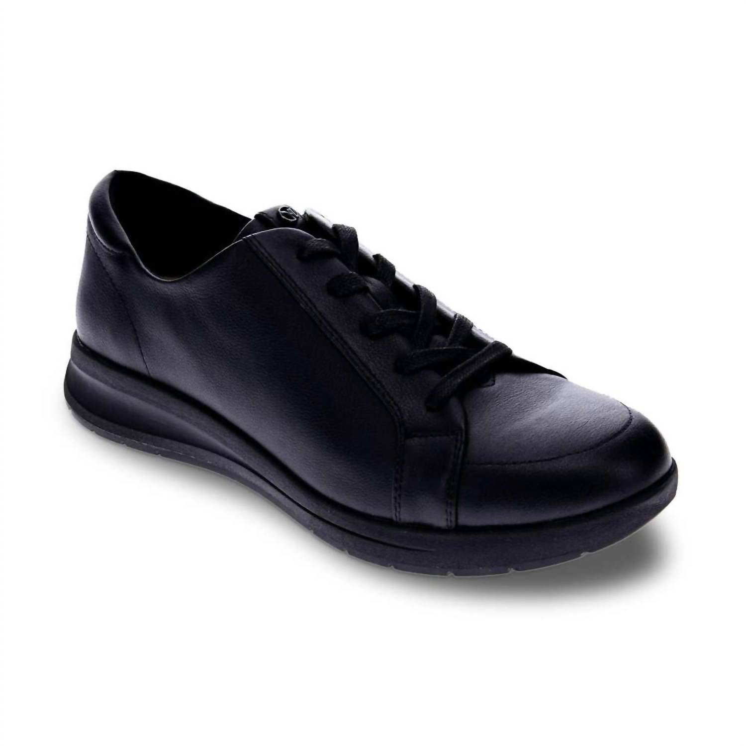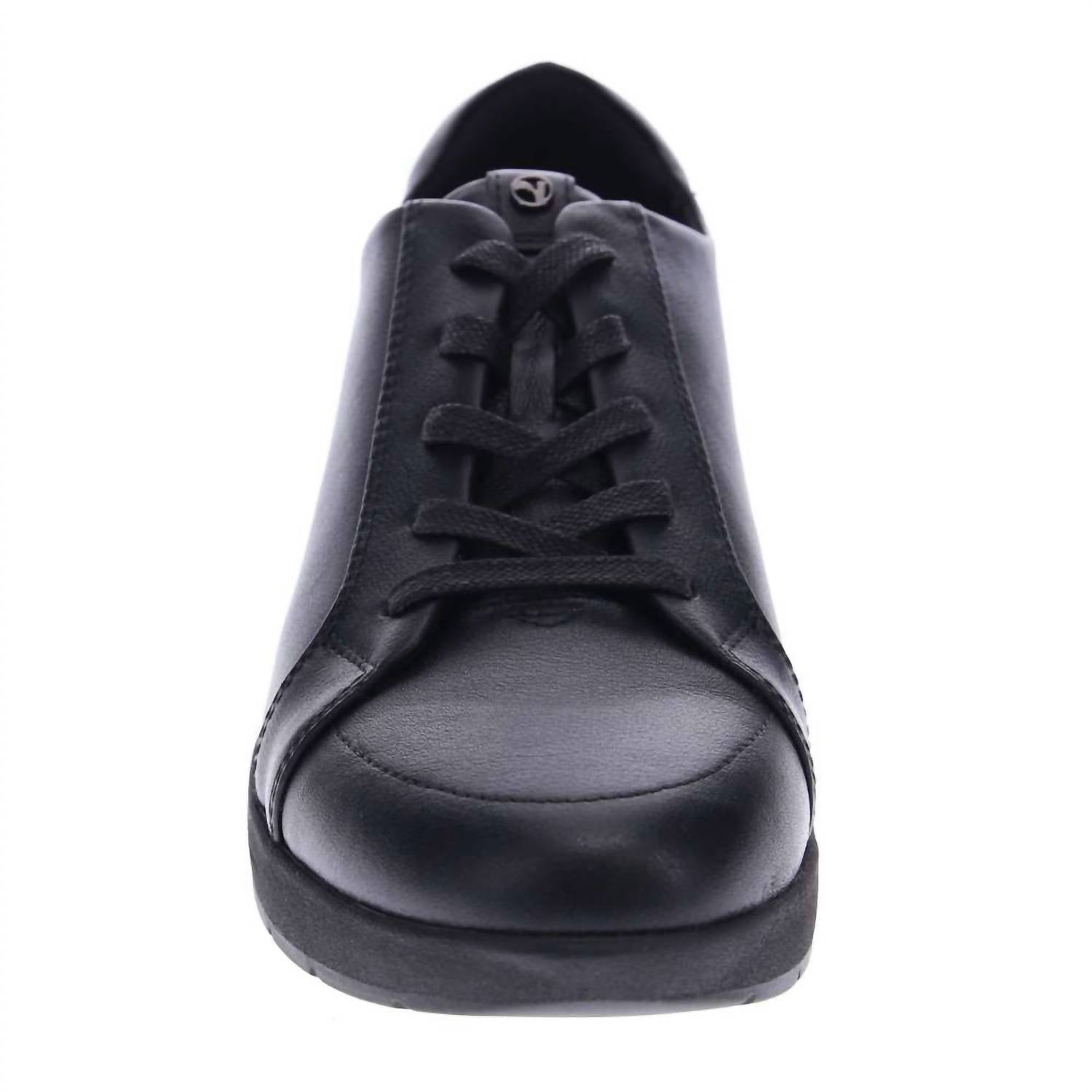 Step into comfort and style with the Women's Athens Lace-up Comfort Sneakers by Revere, perfect for travel enthusiasts. Crafted from premium leather with a round toe design and a chic black finish, these sneakers feature a removable comfort footbed with built-in arch support for orthotic customization. The slip-resistant outsole and wedge heel ensure a secure and fashionable fit, while maximum adjustability in the upper adds tailored convenience. Care is simple: clean with a damp cloth and air dry under indirect sunlight to maintain their sleek look.
