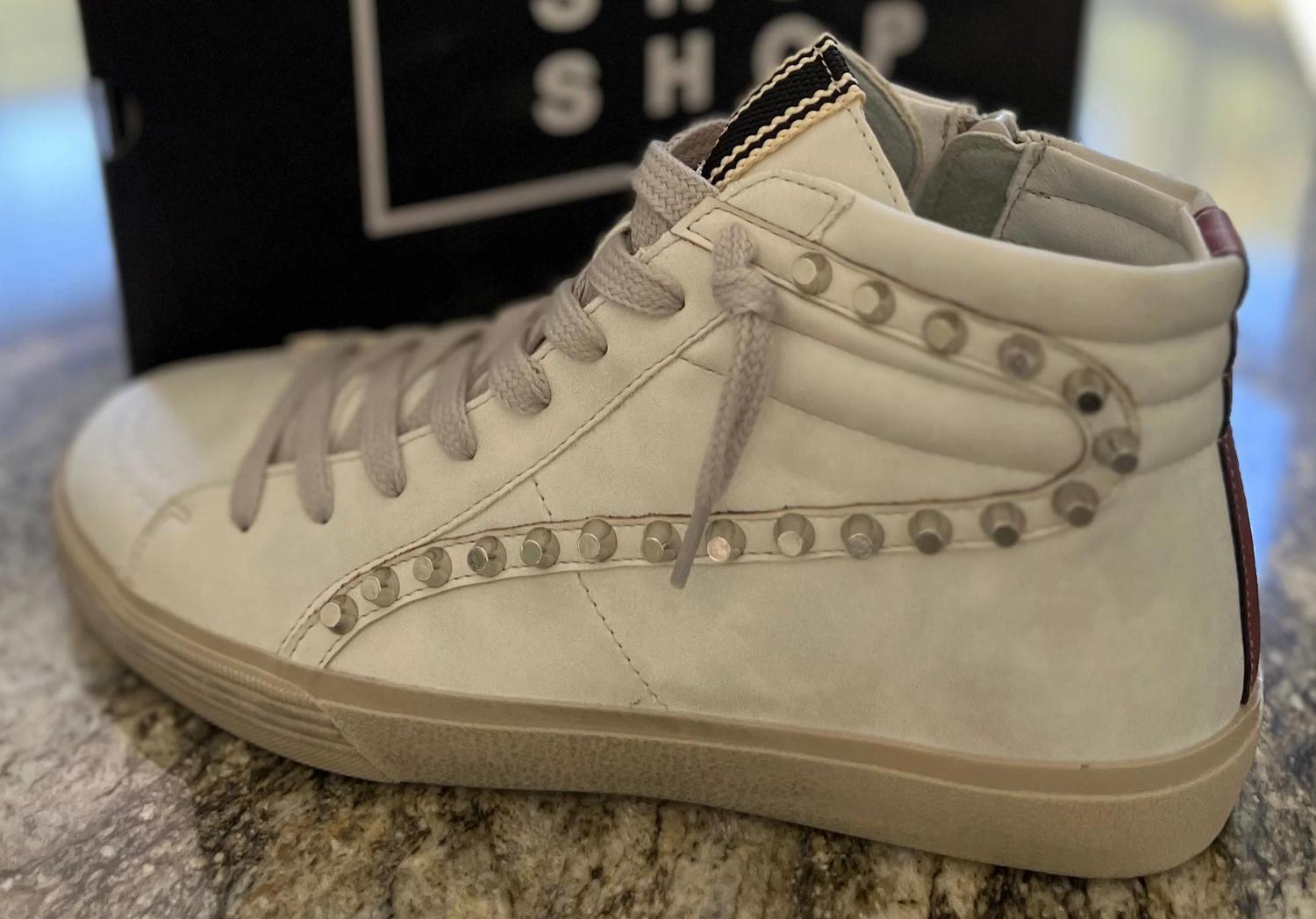 Introducing the Women's Roxie Sneakers by SHU SHOP, a bold twist on classic vintage high tops featuring a sleek white design. These stylish sneakers capture the essence of retro trends with a modern update, accented by metallic studs for added edge. The round toe shape ensures comfort and a timeless fit suitable for any wardrobe. Perfect for adults seeking a fashionable yet functional choice in their sneaker collection.