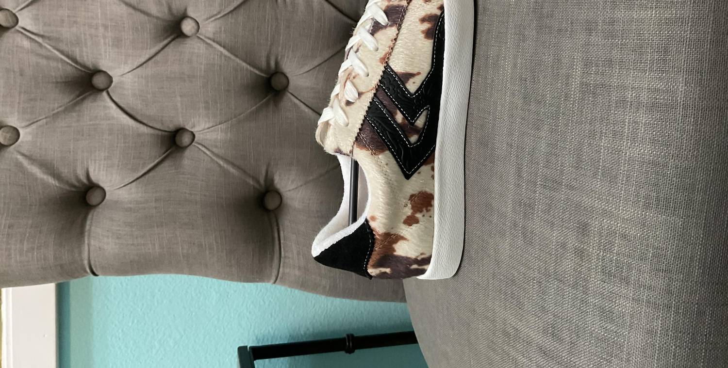 The sneaker is a low-top style with a cowhide print in brown and off-white, black side stripe, black heel tab, white laces, and a white sole.