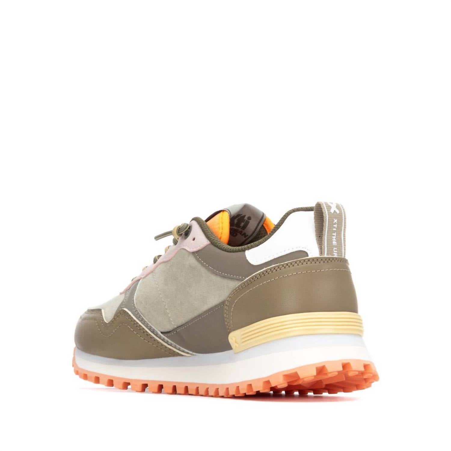Elevate your athleisure style with the Women's 144156 Round Toe Sneakers by Xti, crafted from premium leather in a chic kakhi hue. These sneakers, designed for medium width and featuring a flat heel height of 0 inches, offer unmatched comfort for fitness routines or casual outings. Perfect for the spring season, they seamlessly blend trendiness with practicality. Enjoy expertly crafted footwear made for the modern, active woman without compromising on style.