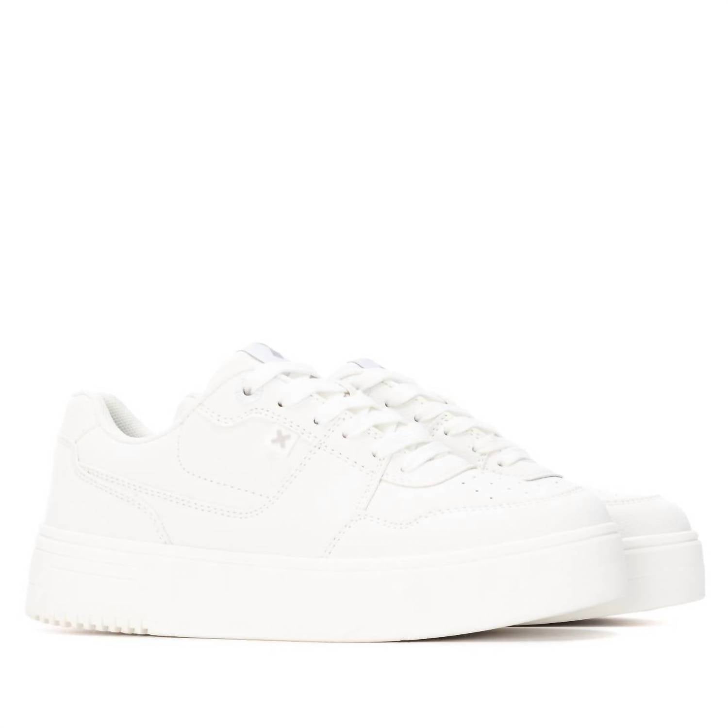 Step up your footwear game with Xti Women's Round Toe Sneakers, designed for the athleisure trend in a chic white leather finish. These medium-width sneakers offer the perfect combination of style and comfort, ideal for fitness or casual outings. Featuring a flat heel under 1 inch, they provide stability for all-day wear during the sunny spring season. Embrace quality and sophistication with Xti's expert craftsmanship.