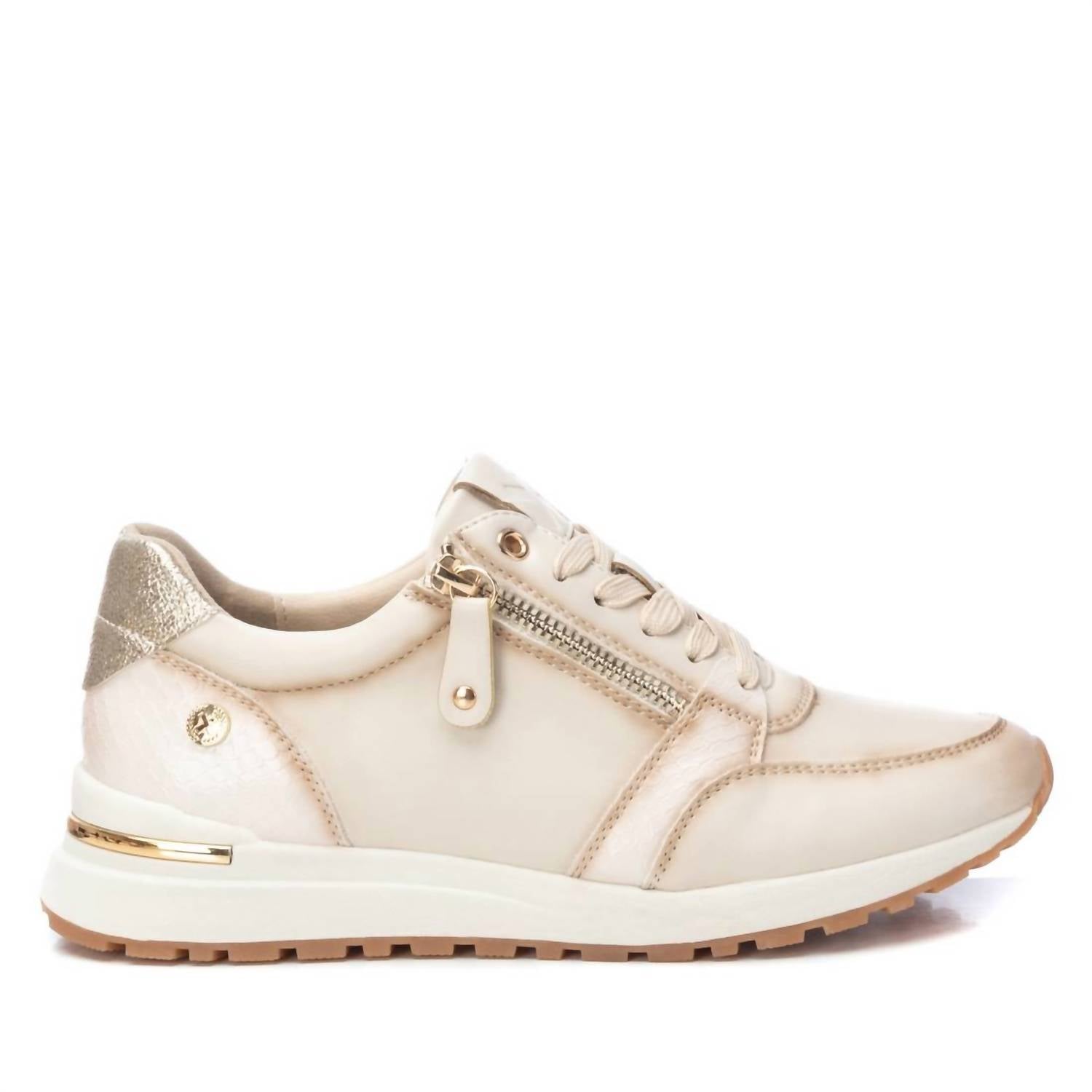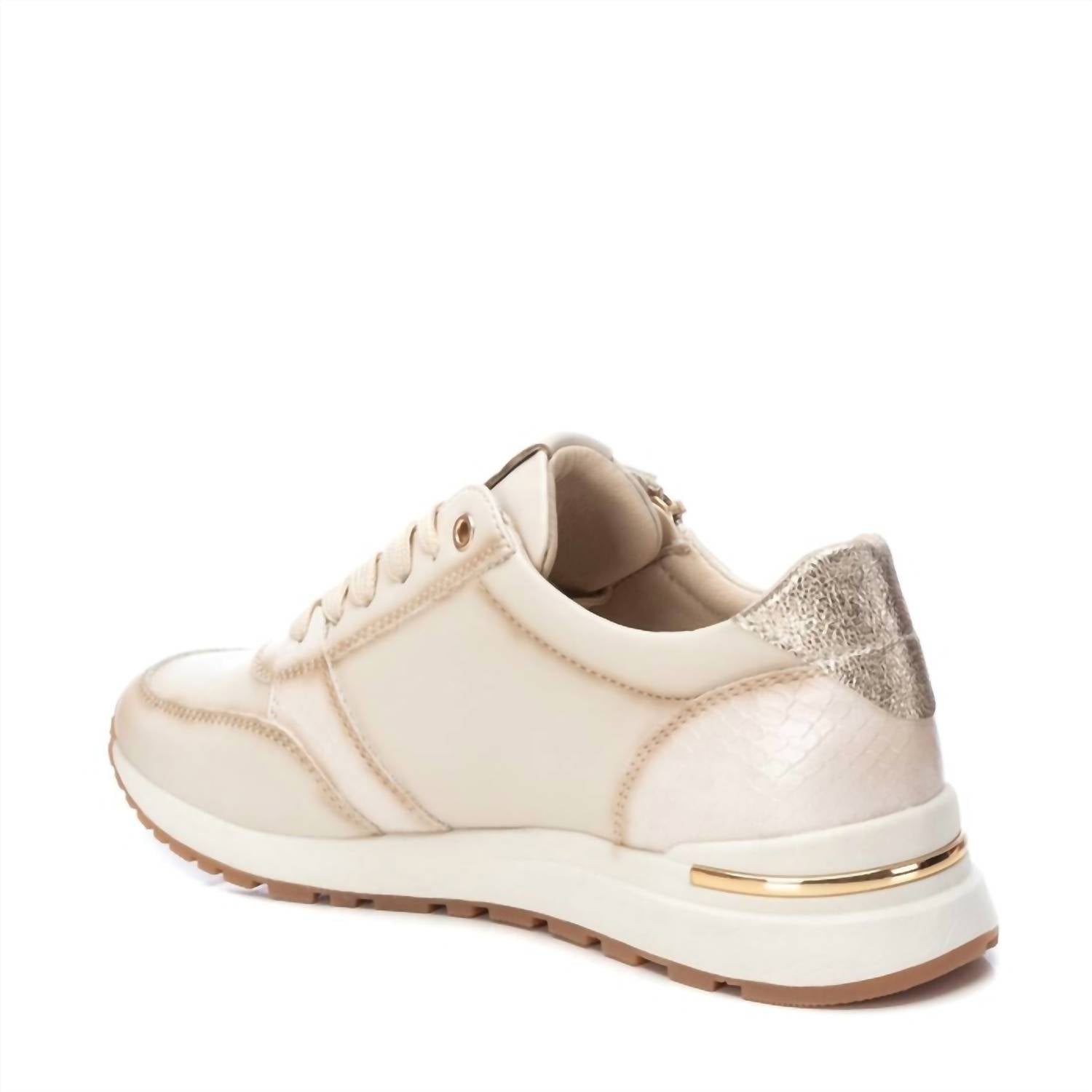 This Trainer Sneaker is crafted from faux leather with a lace-up closure and side zipper for a secure fit. It features a non-slip rubber sole, removable insole, and a low wedge heel for added comfort, perfect for casual wear. Made with certified vegan materials.