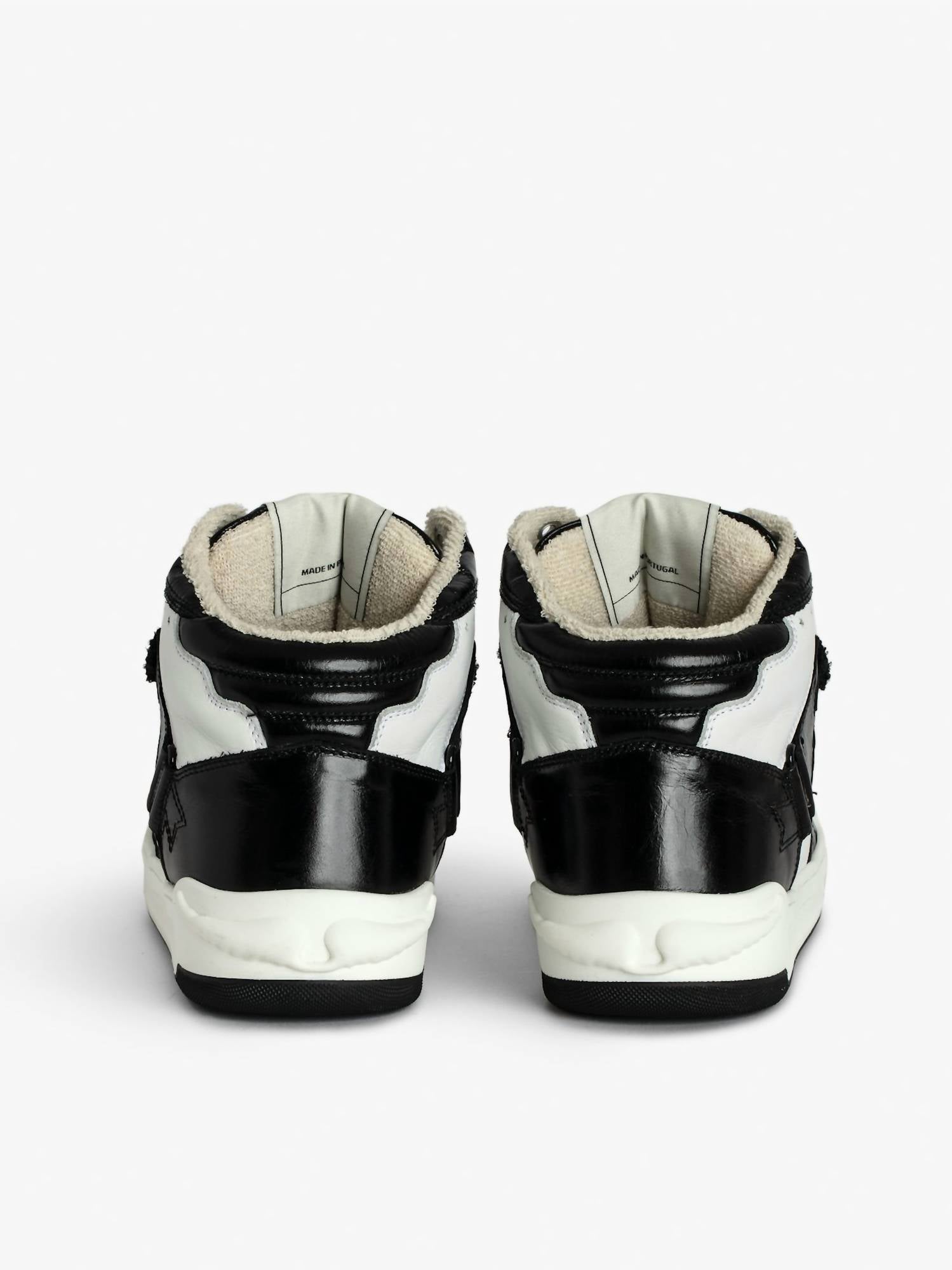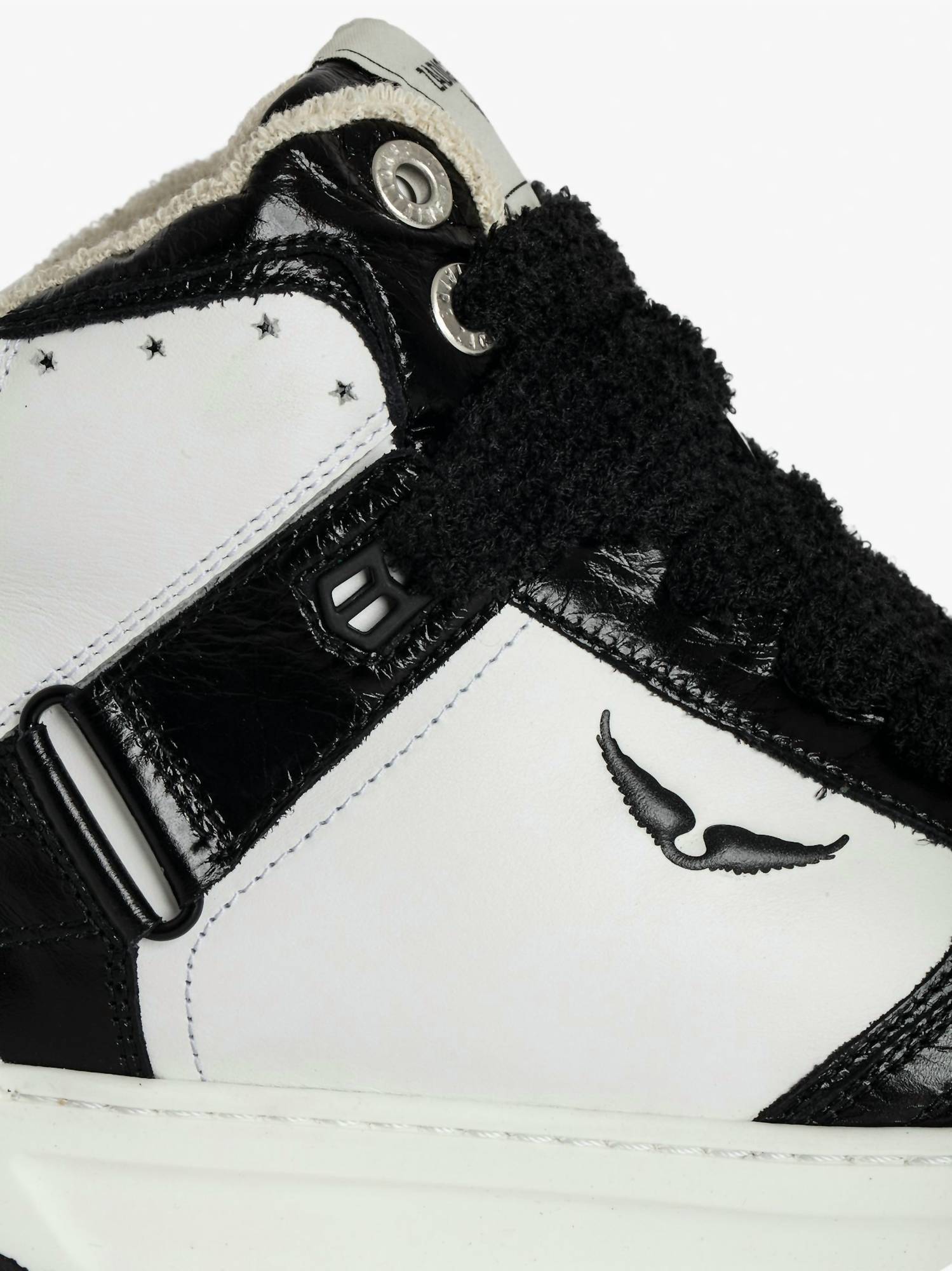 Introducing the Women's Wings High-top Sneakers by Zadig & Voltaire, a stylish blend of smooth and vintage leather with glossy panels in classic black. Made in Portugal, these women's high-tops feature lace-up fastening with additional straps and star-shaped cut-outs. Boasting a two-tone sole, these sneakers are crafted from over 95% low-environmental-impact materials, including 30% recycled content in the out-sole. Composition: 100% Calf Leather with an insole height of 1.7 cm.