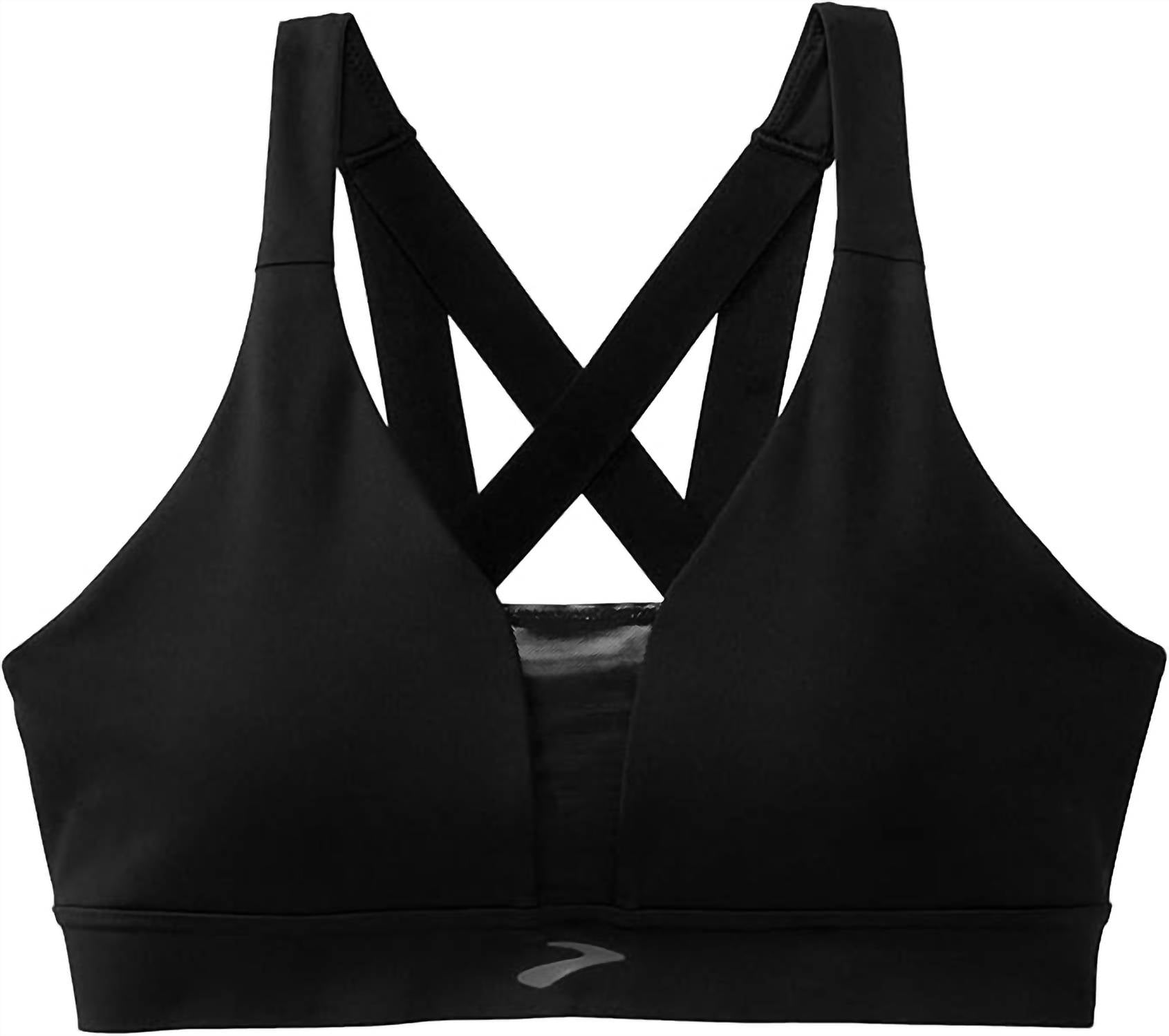 Introducing the Drive Plunge Run Bra Top by Brooks, specifically tailored for women seeking compressive support during runs. Crafted from a lightweight blend of polyester and spandex, this sports bra offers all-around comfort with a stylish strappy open back and mesh inserts for breathability. The solid black design features removable cups kept secure by envelope pockets, providing customizable coverage. Perfect for fitness activities, it embodies a minimalist trend ideal for summer workouts.