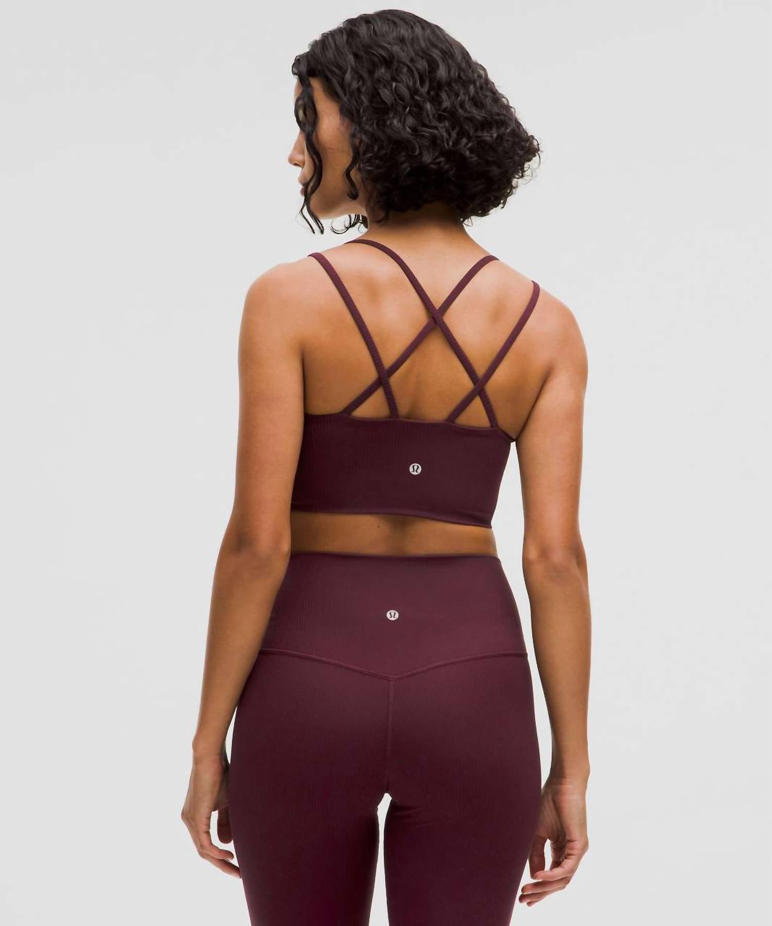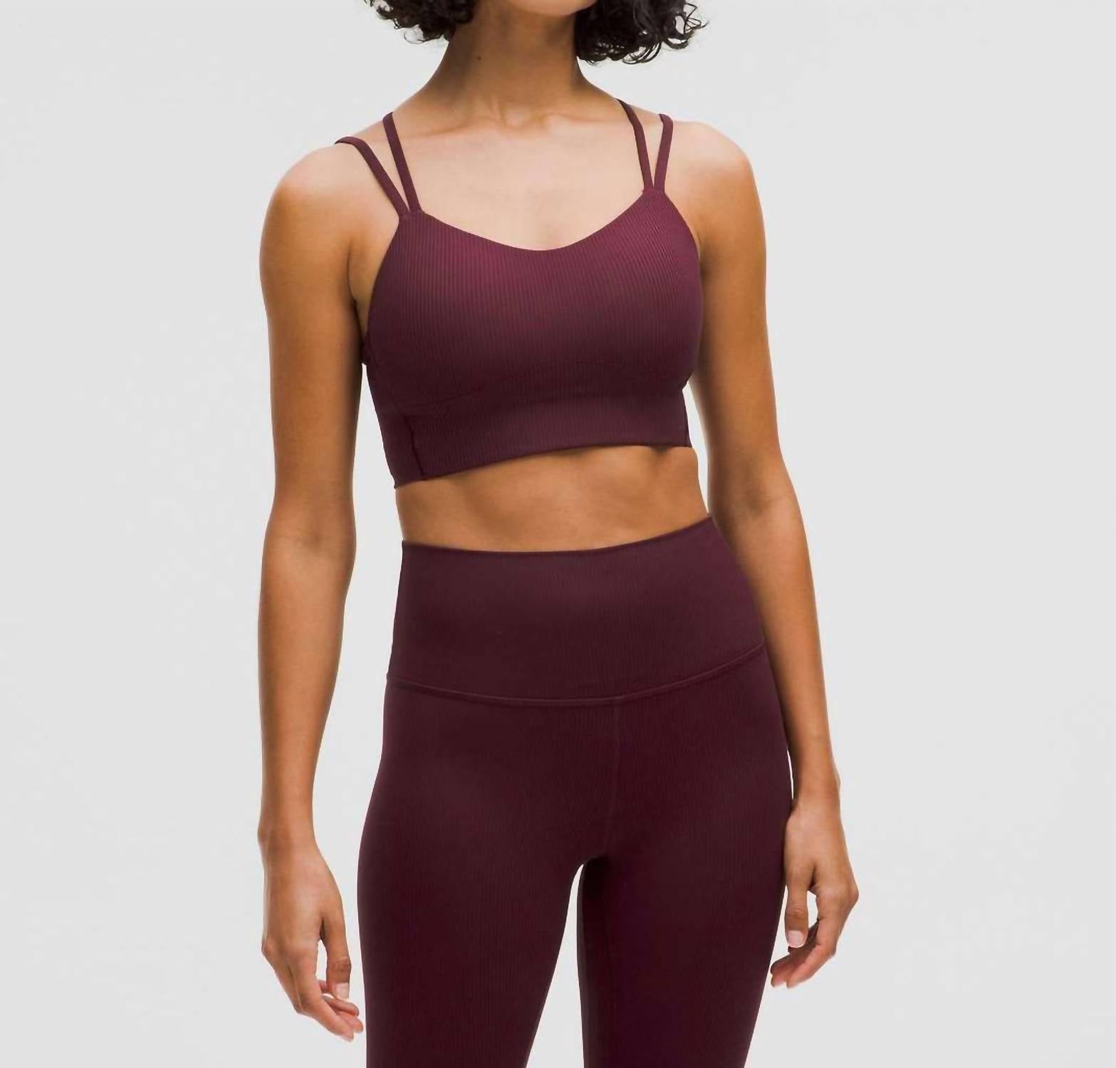 Experience effortless comfort with the Like A Cloud Longline Bra by lululemon, crafted for your yoga sessions and beyond. Tailored for women, this sports bra in a deep Goodnight Plum features marshmallowy-soft, molded foam cups and a smooth ribbed texture that is sweat-wicking, quick-drying, and four-way stretch. It's designed with light support ideal for B/C cups, making it perfect for low-impact activities. Embrace the athleisure trend with this solid, versatile piece for your summer workouts.