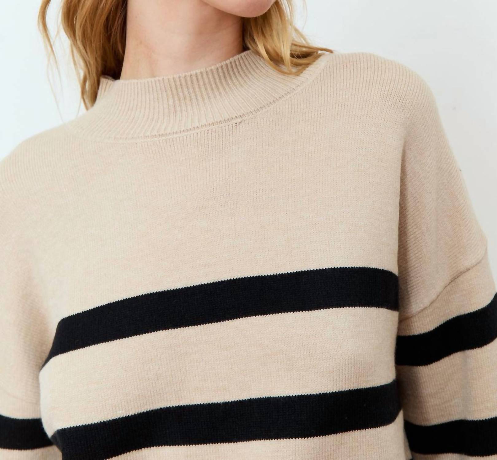 Introducing the Salvia Mockneck Sweater by DELUC, a stylish choice for fall engagements and casual occasions. With long sleeves and a mockneck design, this sweater combines the timeless appeal of beige melange and black stripes. Crafted from a cozy blend of 72% acrylic, 20% nylon, and 8% spandex, it offers a comfortable fit. Closure is pull-on.