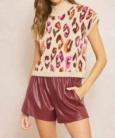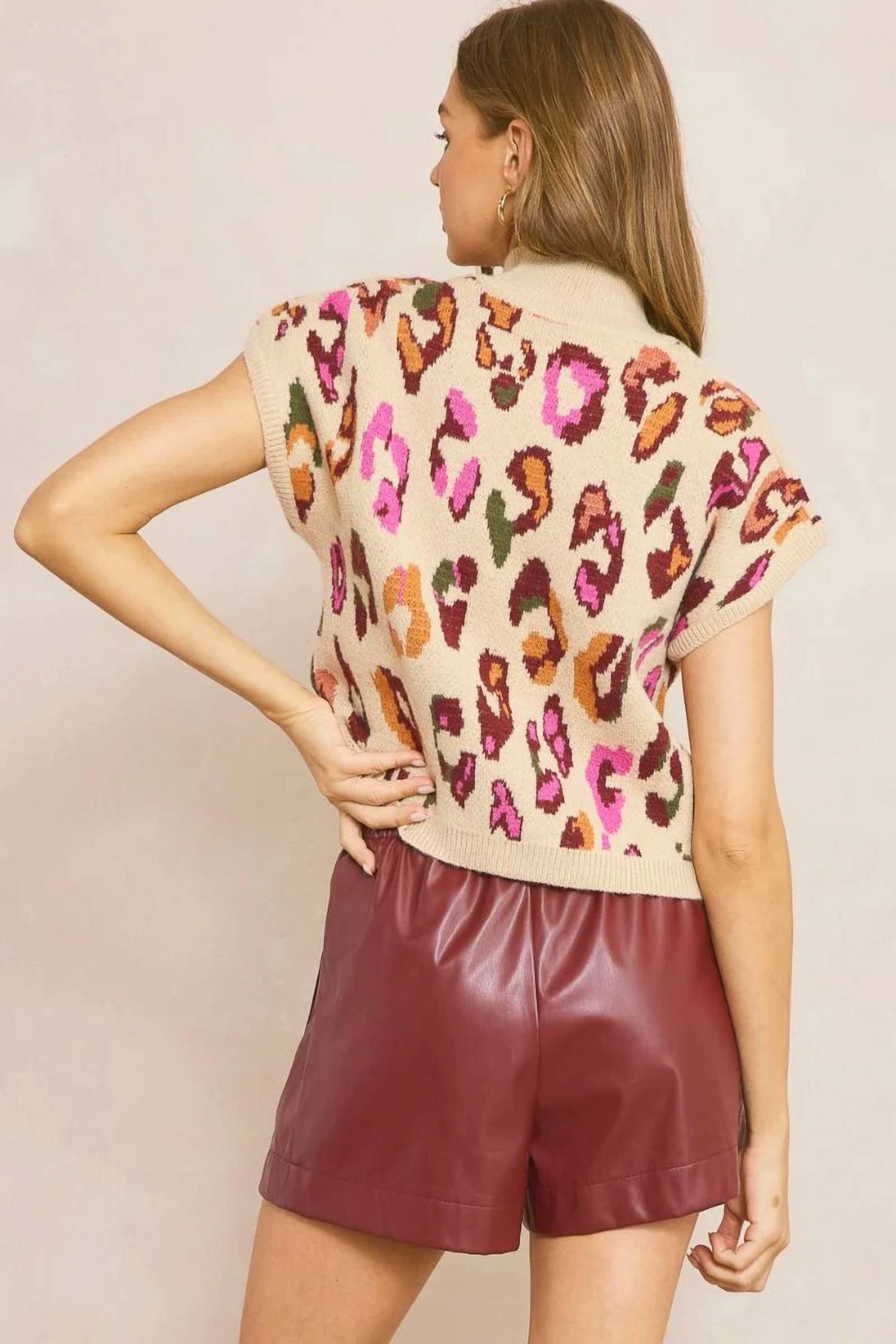 Introducing the Cheetah Sleeveless Sweater by Entro, a chic travel companion in a vintage taupe animal pattern. Featuring a mock neckline and cap sleeves, this sweater is crafted from a comfortable blend of 42% acrylic, 30% polyester, and 28% nylon, offering a touch of stretch. Material: Acrylic. Closure: Pull on. Care: Hand wash, lay flat to dry.