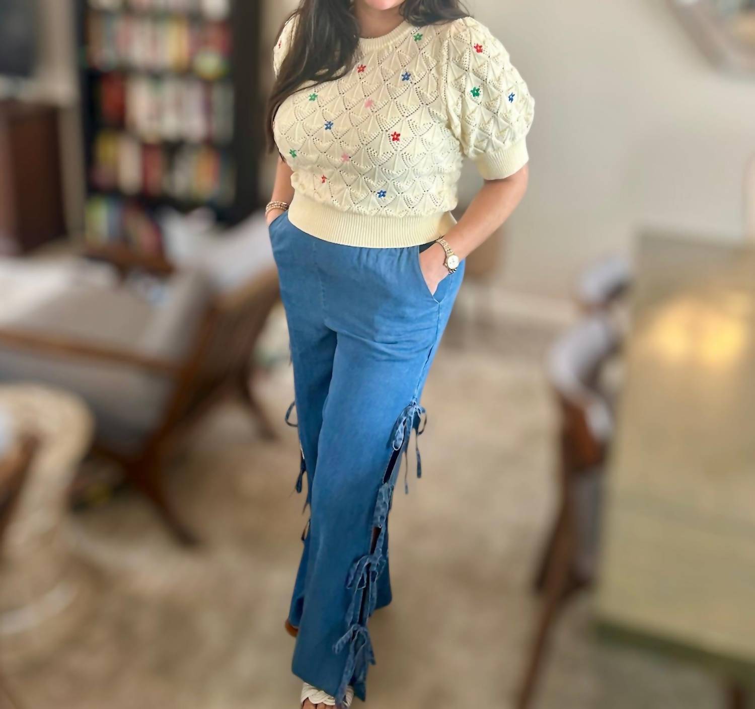The Diamond Pattern Pointelle Sweater by Entro is an elegant, beige pullover top perfect for the fall season. Highlighting short puff sleeves and floral embroidery, this piece combines a textured, semi-sheer knit with 100% cotton for a lightweight feel. It features a crewneck design and provides convenient pull-on closure. For care, machine wash and lay flat to dry. Available with bust measurements: small 36", medium 38", large 40", and lengths: small 20", medium 20.5", large 21".