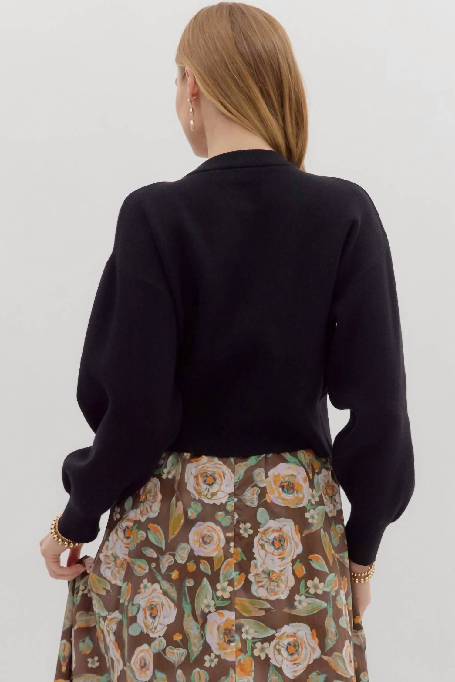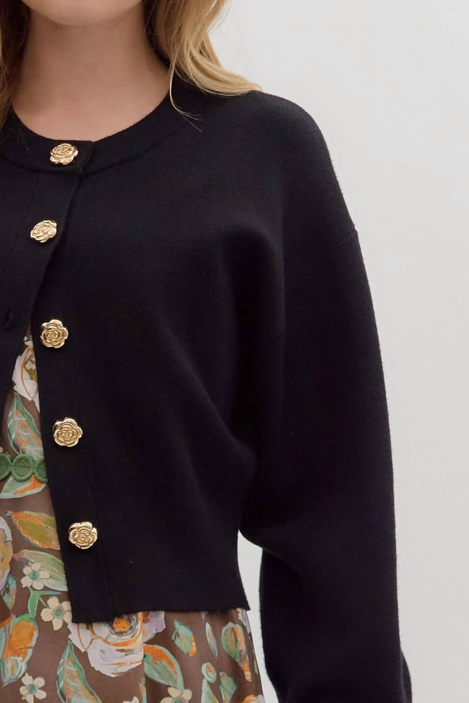 This cardigan will be a sweater-rotation favorite. Elevate your vacation wardrobe with the Reason To Stay Sweater Cardigan by Entro, a sophisticated piece in black solid knit. Featuring long sleeves and a crewneck, this cardigan boasts a cropped length with gold flower accent button front closure. Crafted from a blend of 50% Viscose, 30% Polyester, and 20% Nylon, it embodies quiet luxury for spring. Ideal for women seeking a touch of elegance without compromising on comfort.