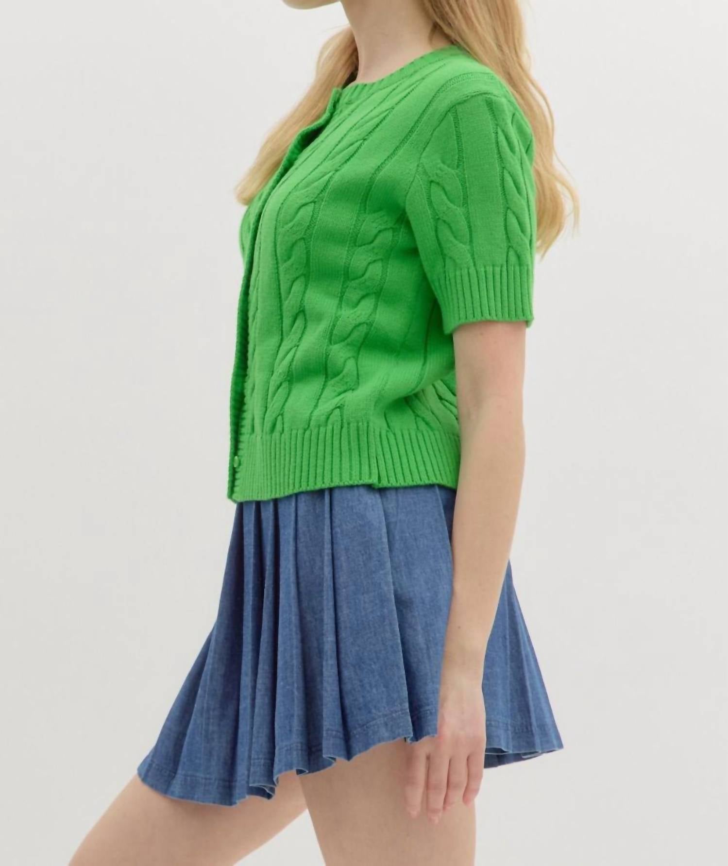 Introducing the Green Sweater by Entro, a stylish cable knit short sleeve top perfect for your casual or dressy days. Made from a cotton blend, this lightweight sweater provides cozy comfort suitable for layering with its playful button front closure. Care for this non-sheer, patterned piece with ease by machine washing and line drying. Opt to size up if you prefer a looser fit to suit your style needs.