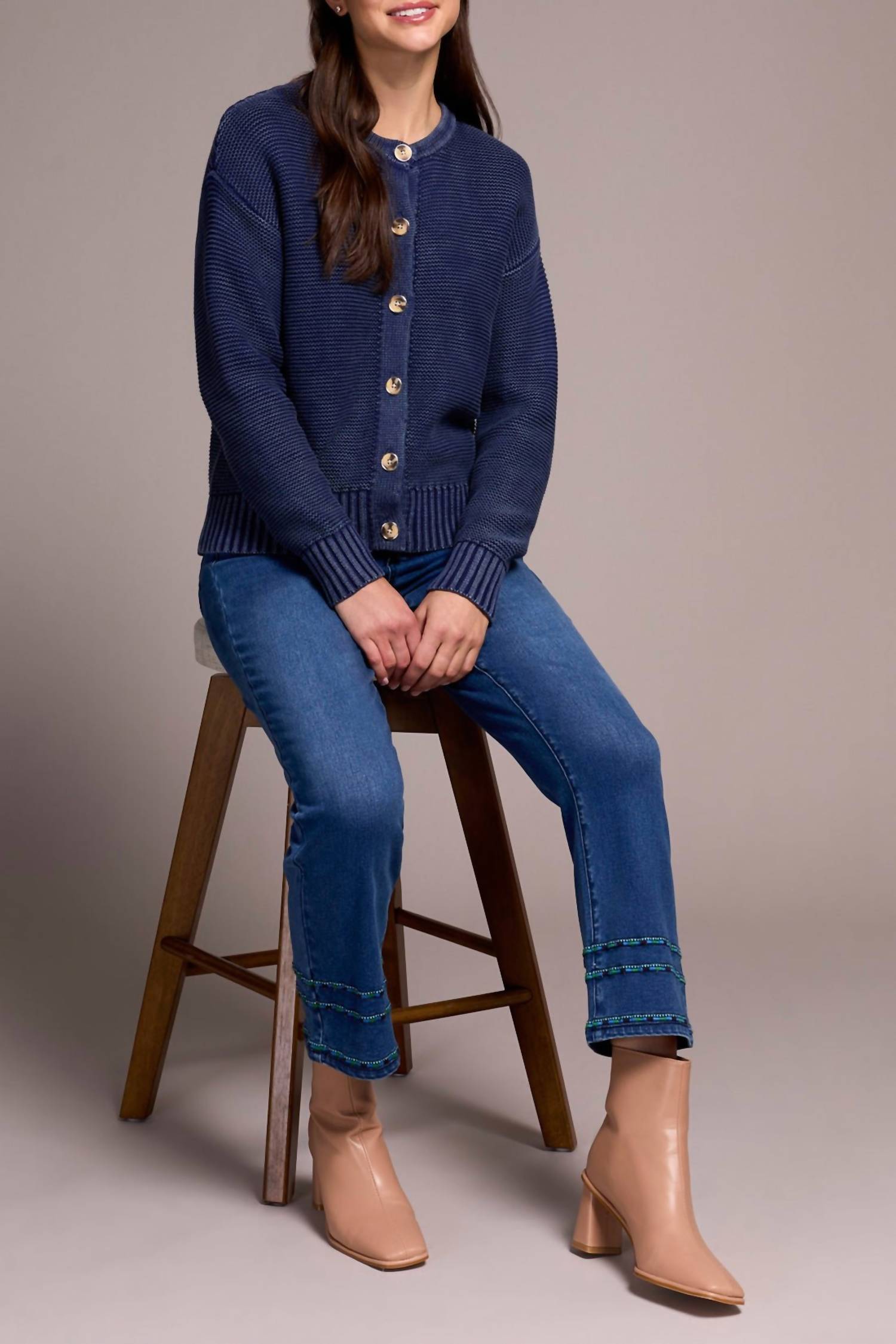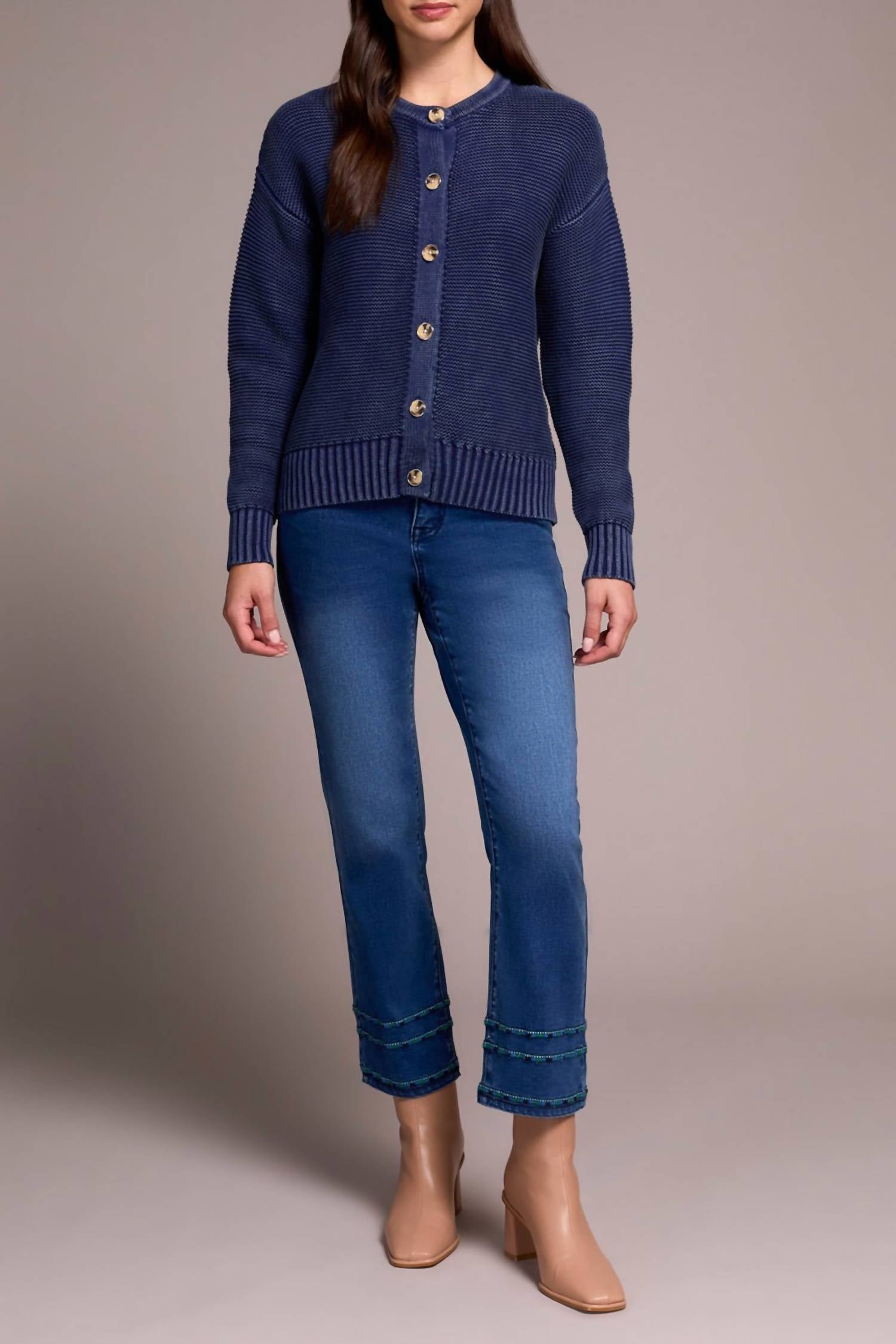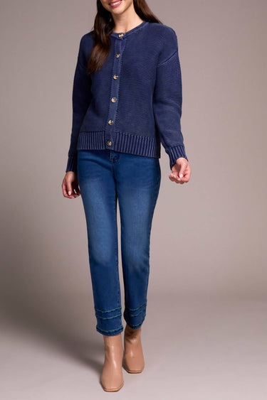 Embrace effortless elegance with the TRIBAL Button-front Cardigan in Nightfall - Dark Blue, perfect for any fall occasion. This women's cardigan features long sleeves and a close fit, crafted from 100% cotton yarn for ultimate comfort and breathability. Enhanced by a special wash, it presents a vintage finish and sophisticated tortoise button details on the button closure. Care for this minimalist piece by hand washing and laying it flat to dry for lasting quality.