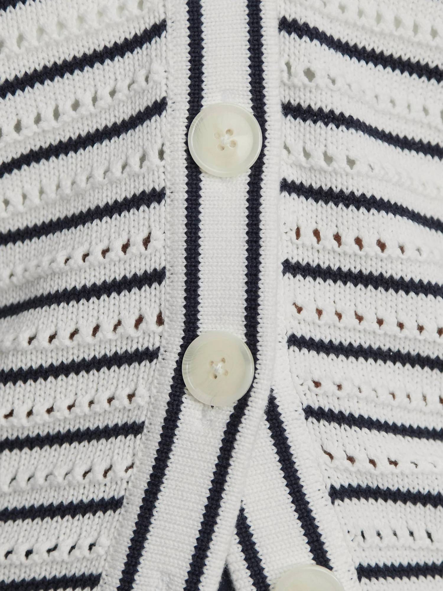 Discover the Antonia Relaxed Cardigan by Varley, an elegant addition to your fall wardrobe. This black and white knit cardigan features long sleeves and a chic V-neckline, accentuated by an all-over contrasting stripe. It boasts a relaxed fit with dropped shoulders and is completed with a button closure and ribbed hemline and cuffs. The perfect choice for a holiday party, this piece offers both style and comfort.