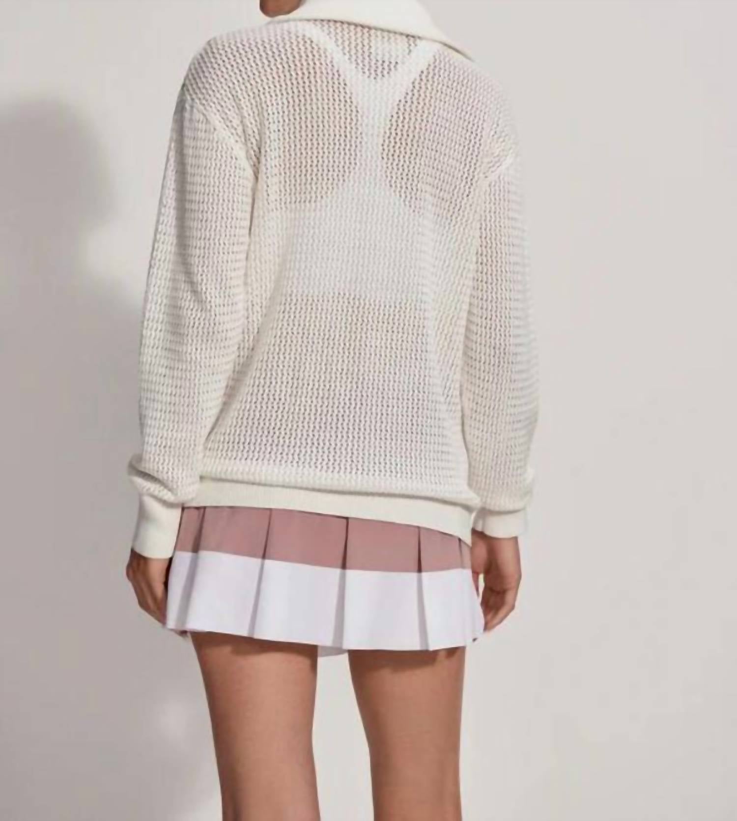 Introducing the Savannah Knit Sweater by VARLEY, crafted for chic style and functionality. This long sleeve textured sweater in white and rose is composed of 100% Cotton and measures 25.5 inches in length. It features a cowlneck with a convenient zip closure for easy wear. Care instructions include machine washing and laying flat to dry, making it ideal for effortless maintenance.