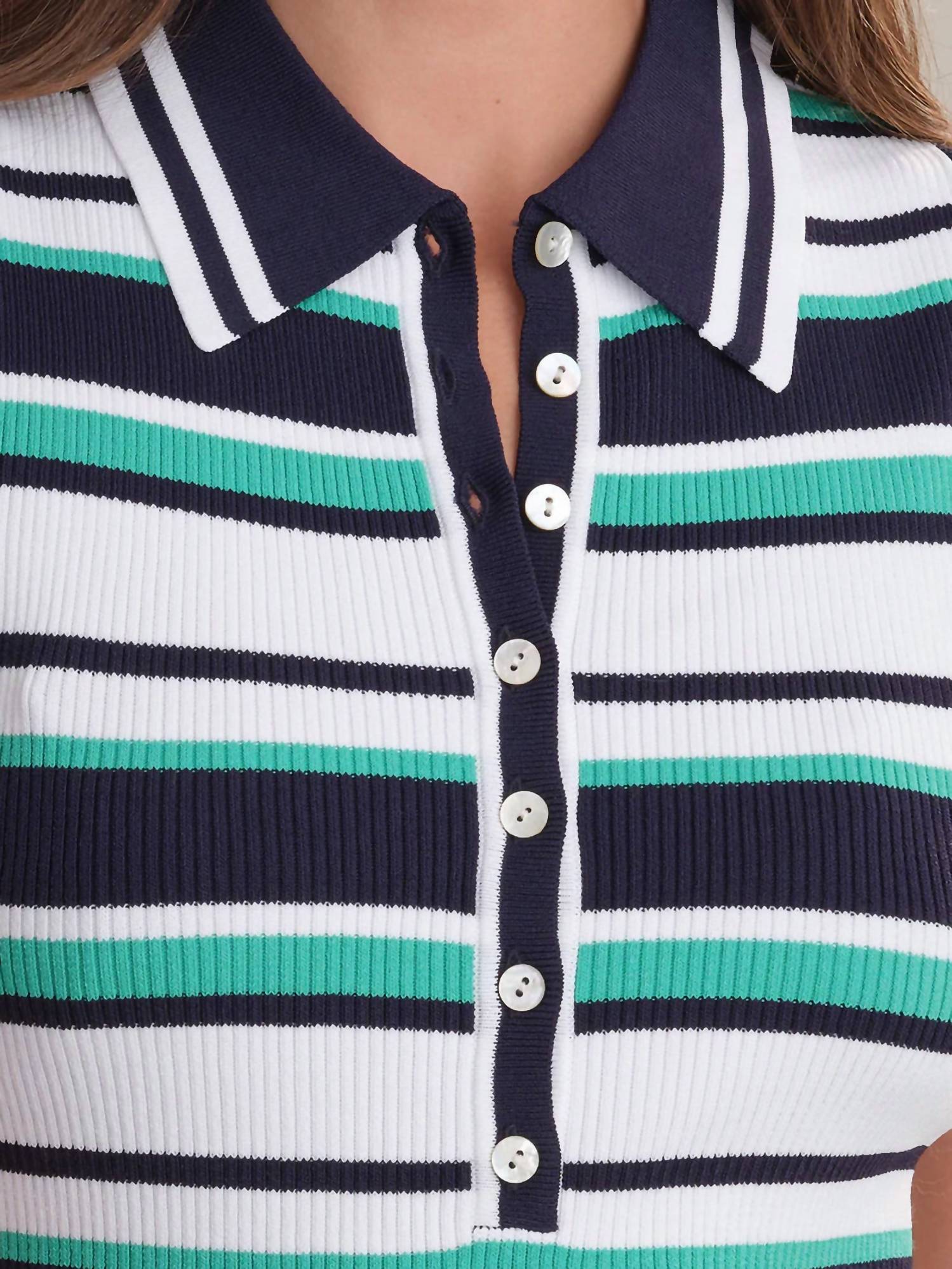 Presenting the Vivienne Johnny Collar Striped Tank by 525 America, a chic addition to your wardrobe in a Dark Blue Multi stripe pattern. This sleeveless sweater-tank boasts a trendy cropped fit with a collar neckline, perfect for maximalist spring styles. Crafted from a viscose blend of 52% Viscose and 48% Nylon, it features a button closure for a polished finish. Measuring 20" in length, it is conveniently machine washable and suitable for tumble drying on low.