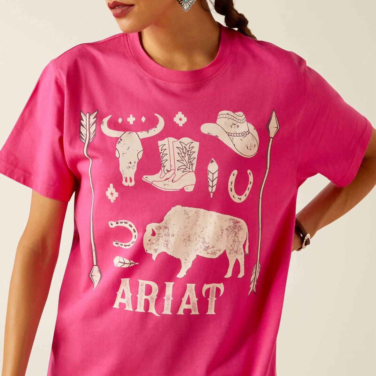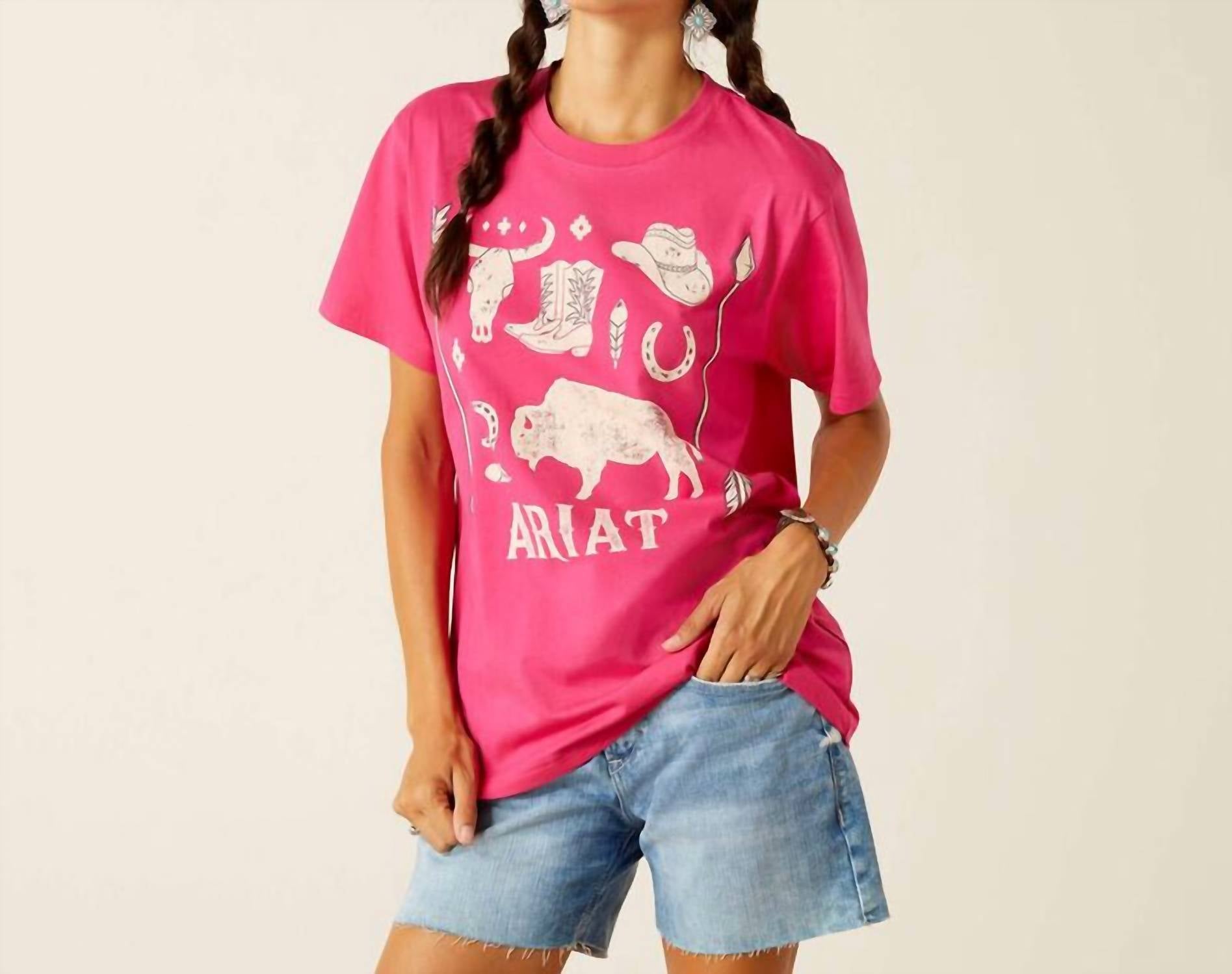 Vibrant hot pink tee for women, perfect for casual styling. Short sleeve piece is crafted from 100% cotton. Offering a soft cotton jersey feel and screen print graphics. With a crewneck and pull-on closure. Provides a straight and loose fit from waist to hips. Ensuring added comfort. Originating in US. Machine washable for easy maintenance.