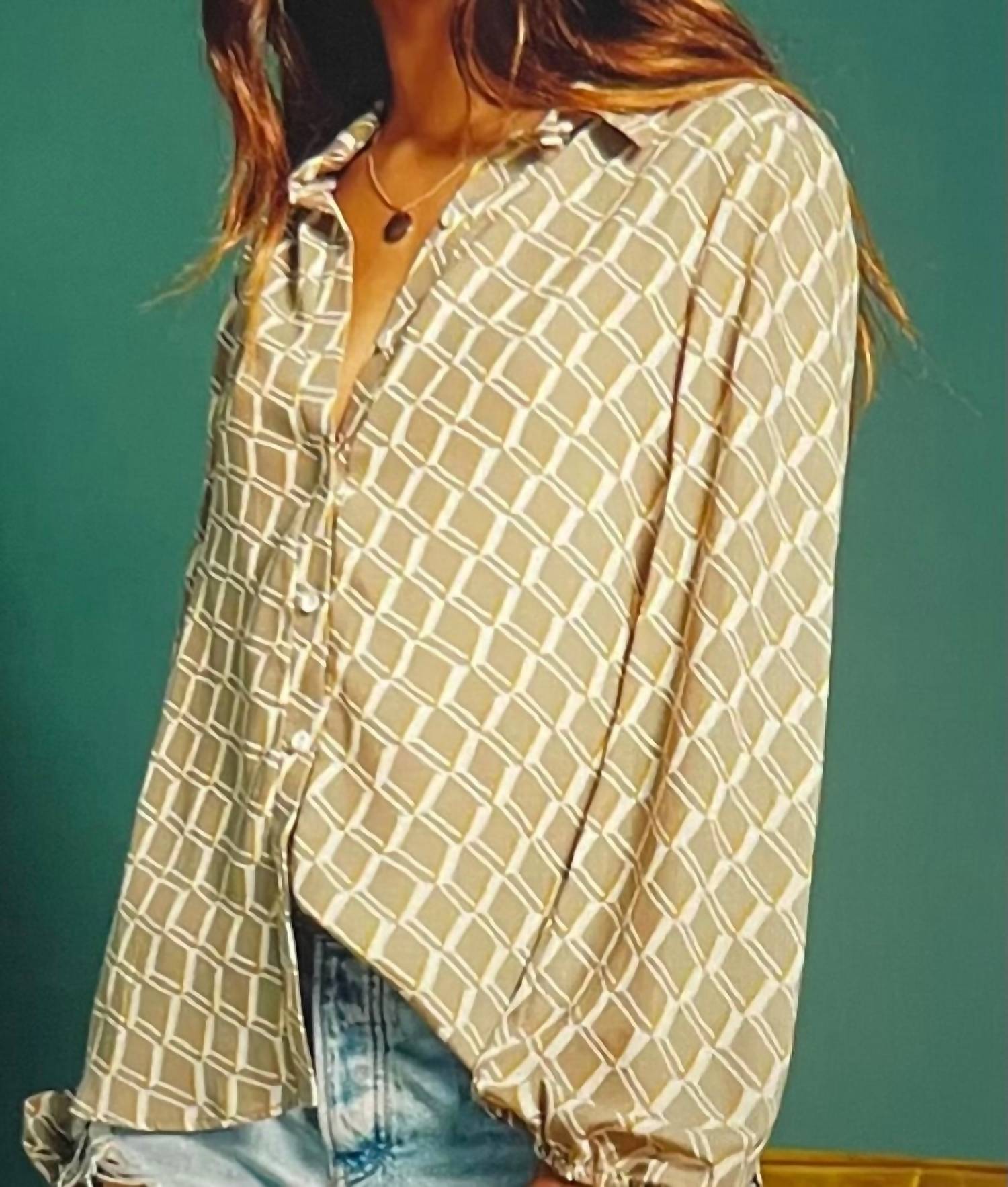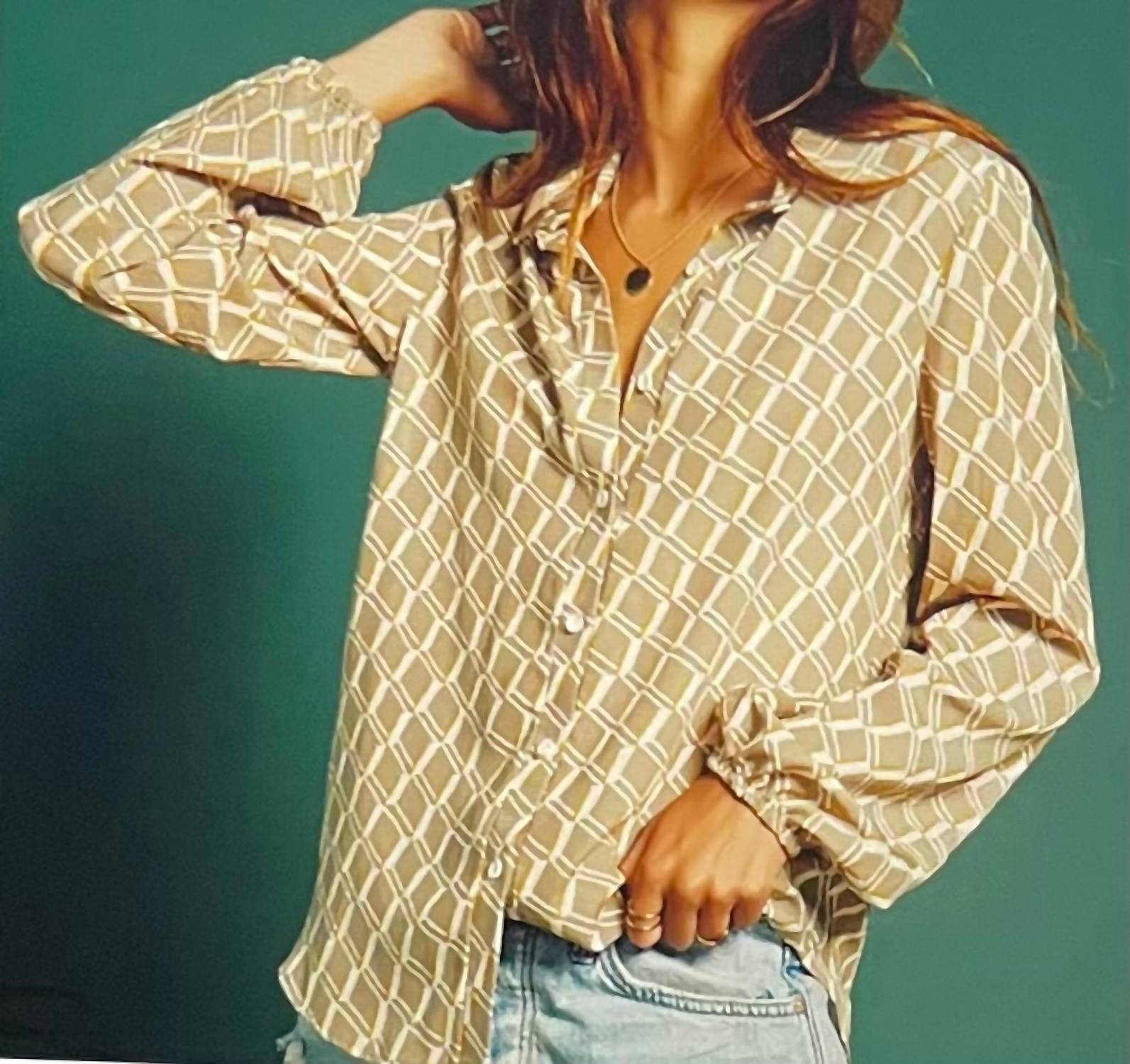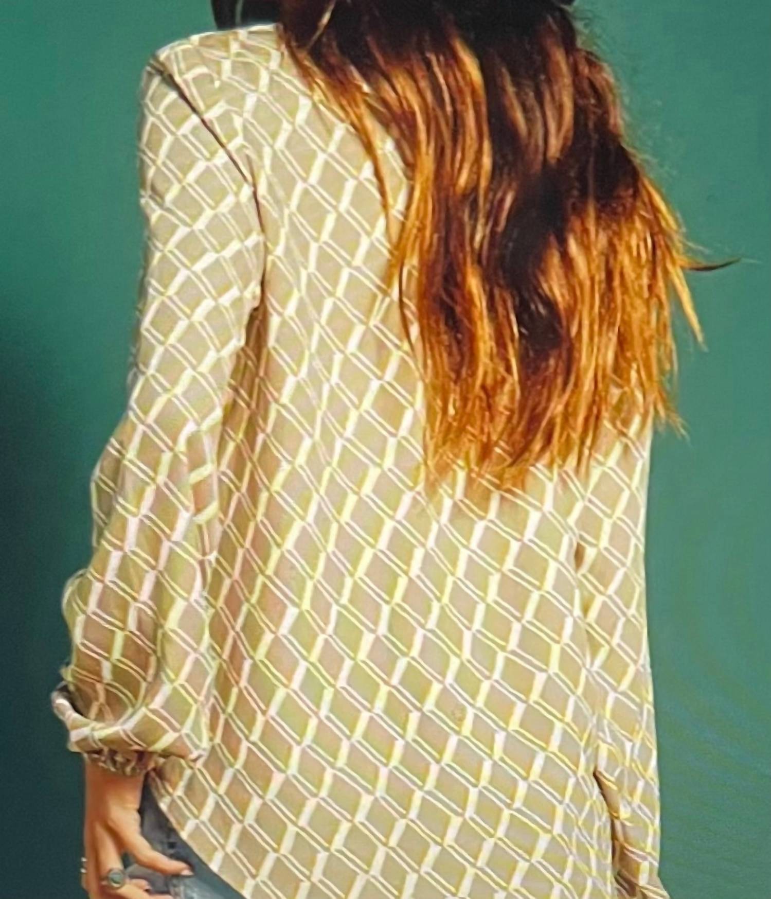 Elevate your wardrobe with the Geometric Print Blouse by BUCKETLIST, a chic addition in a sophisticated cream hue. This women's blouse features a straight collar and long sleeves, offering a stylish yet comfortable fit. The button closure complements its geometric pattern, making it a statement piece that is both fashionable and functional. Care for this garment by hand washing and laying it flat to dry.