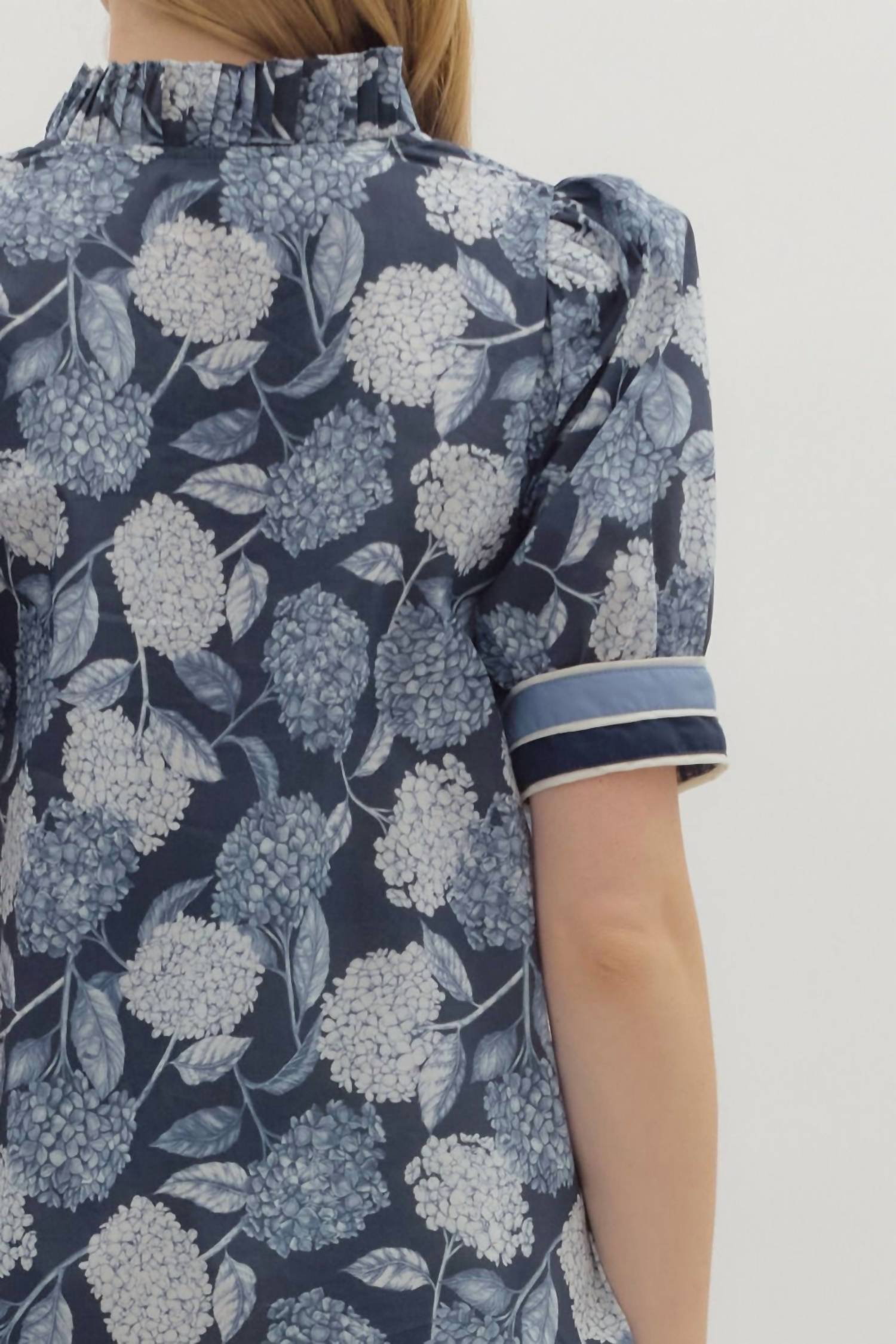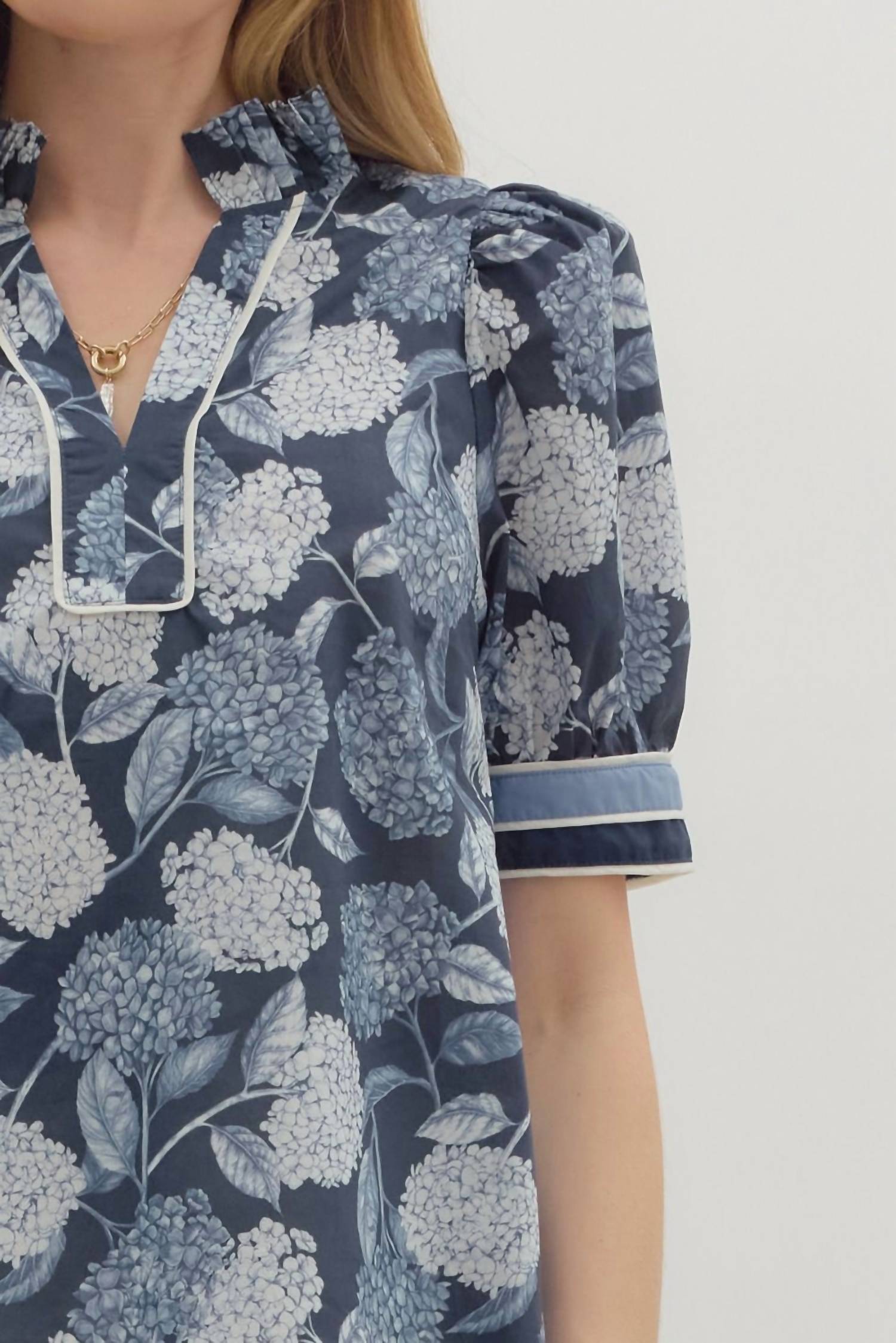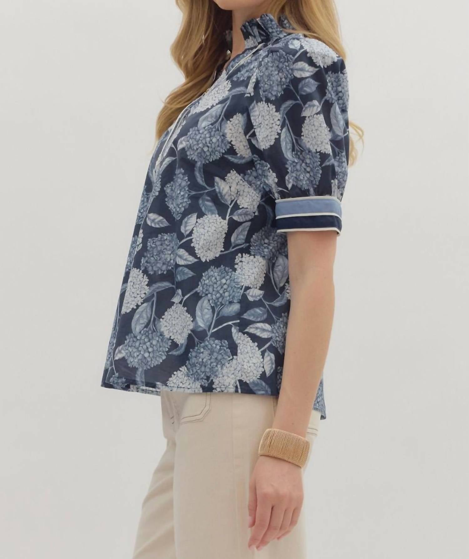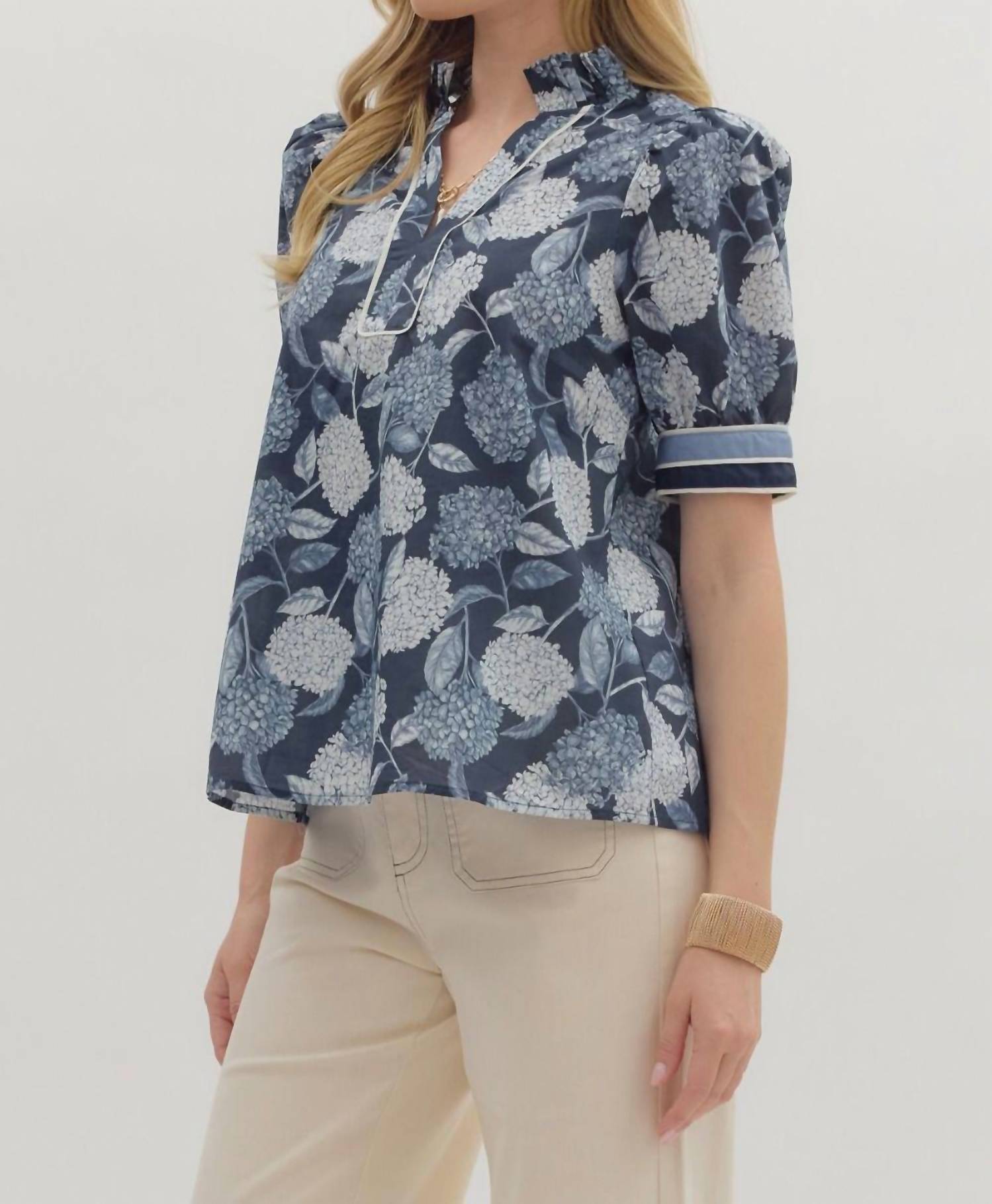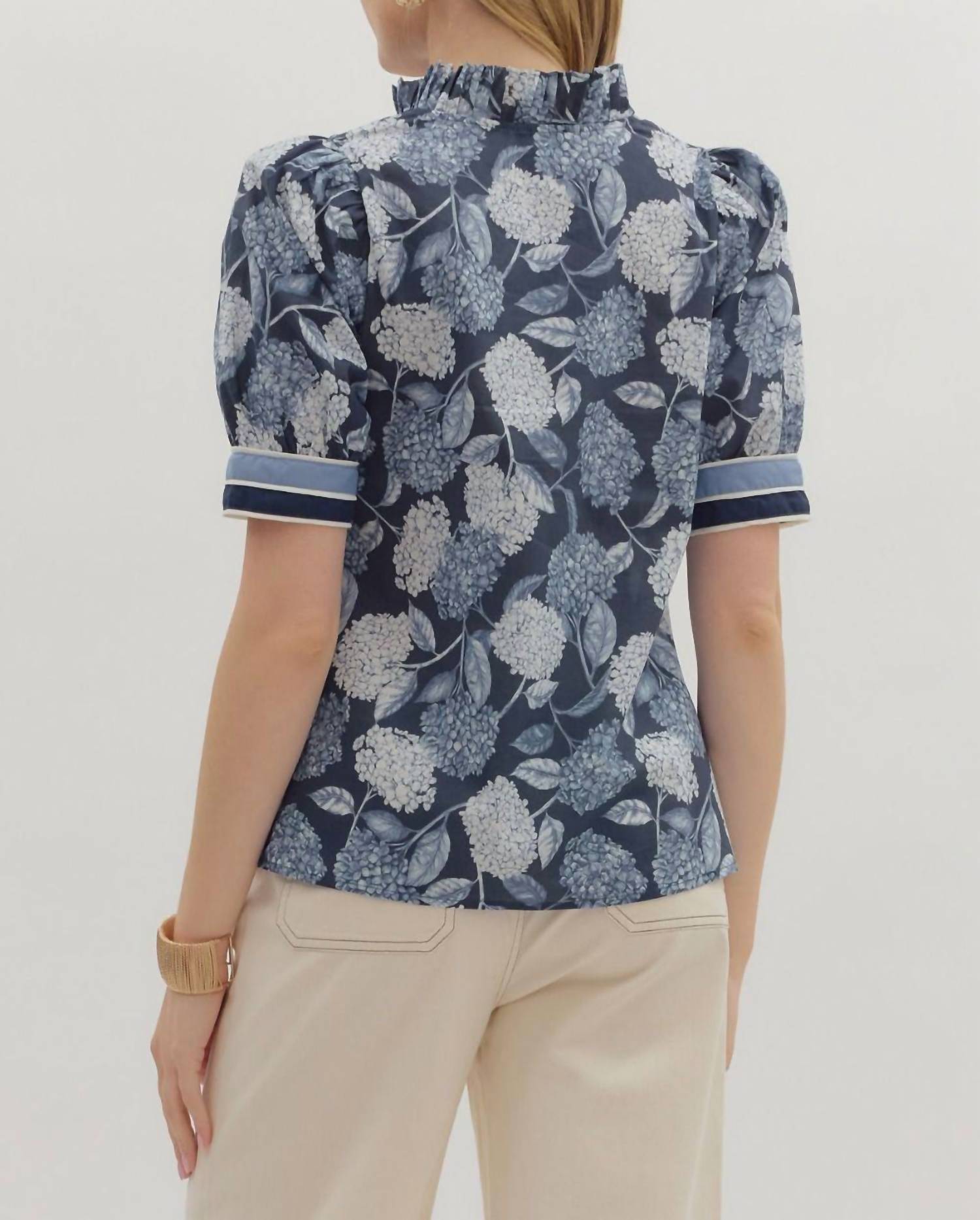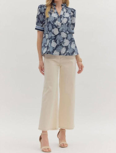 This cotton blouse features puff sleeves and a split neckline with contrasting ivory trim. It is lightweight and breathable, suitable for both work and casual wear. Made from 100% cotton.