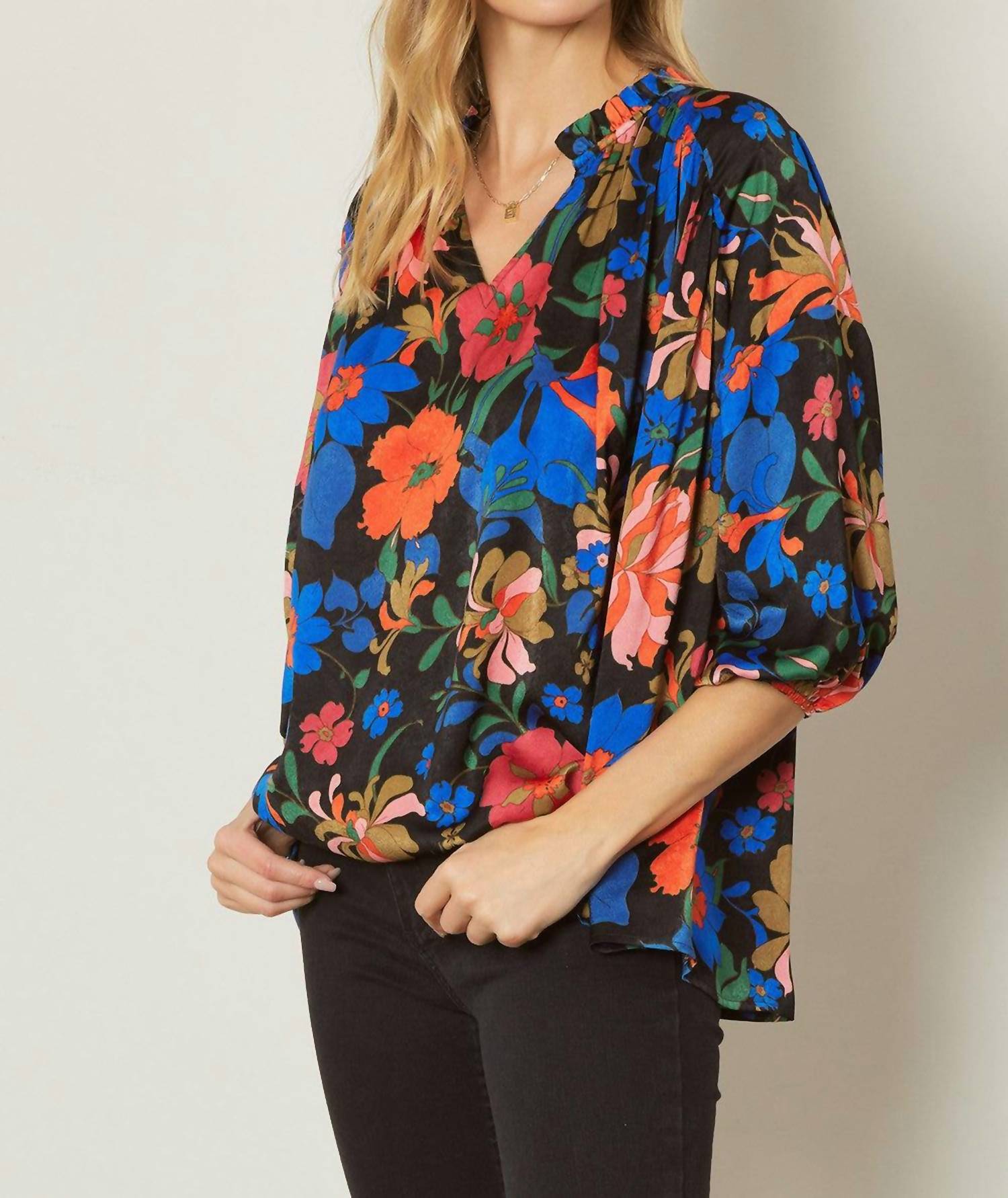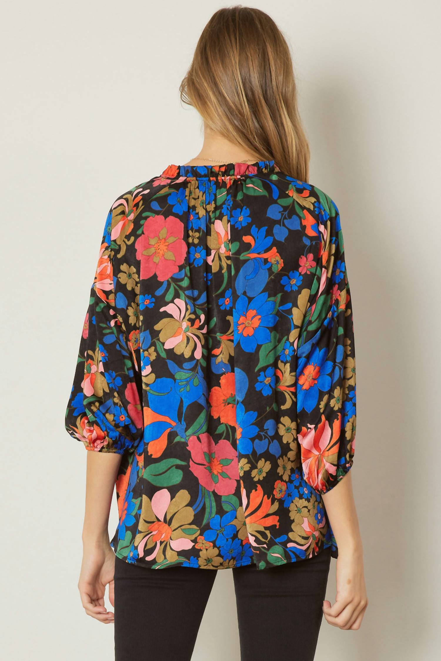 Embrace a burst of floral flair with the Bold Floral Print Top by Entro, a chic addition to your blouses collection. This women's top in classic black showcases three-quarter sleeves with elastic cuffs and a flattering V-neckline, crafted from 100% polyester. With a garment length starting at 26 inches, its oversized silhouette offers a trendy, comfortable fit. Imported with a pull-on design, it requires hand washing or dry cleaning for care.