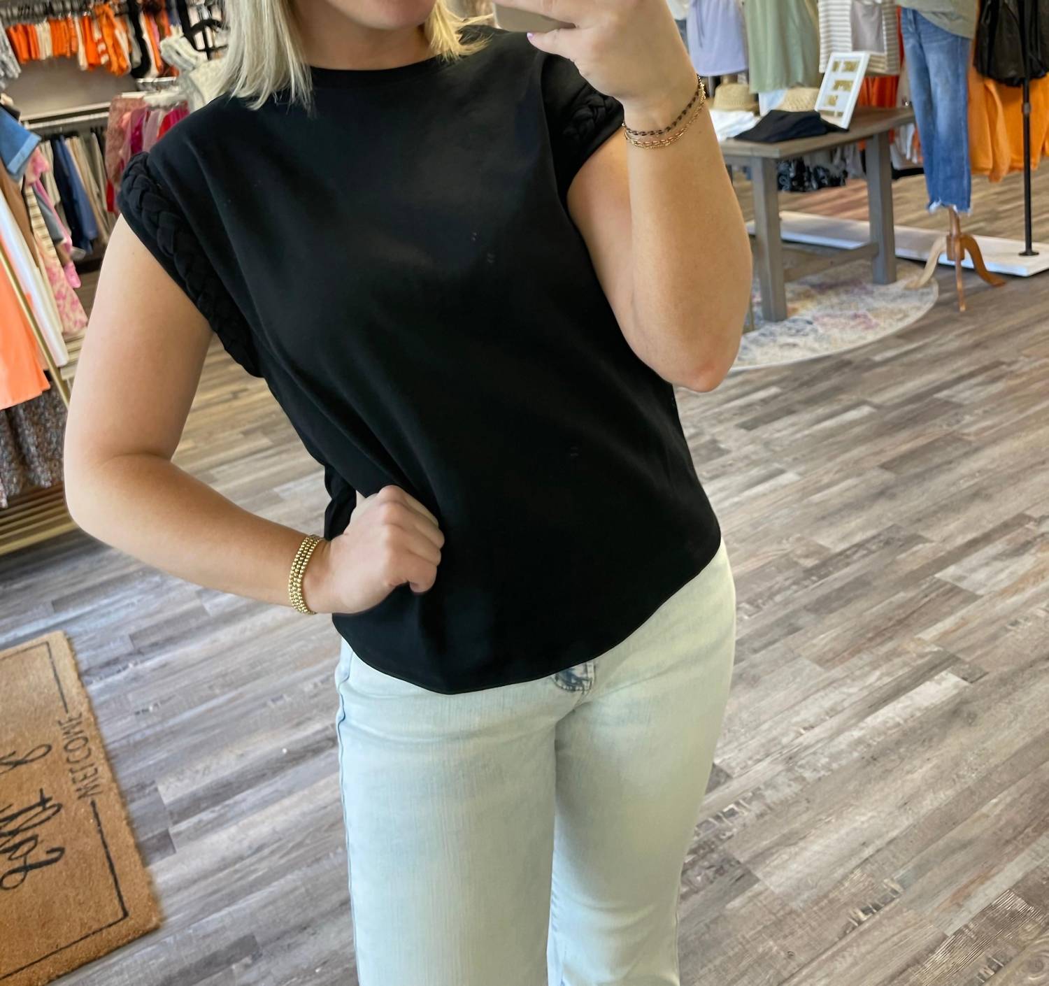Elevate your basics with the Braided Detail Cap Sleeve Top by Entro. This solid black blouse showcases cap sleeves with an intricate braided detail for added flair. Made from a comfortable cotton blend, it features a crewneck and a pull-on closure for easy wear. Ideal for true-to-size fits, this top offers effortless style with minimal fuss.